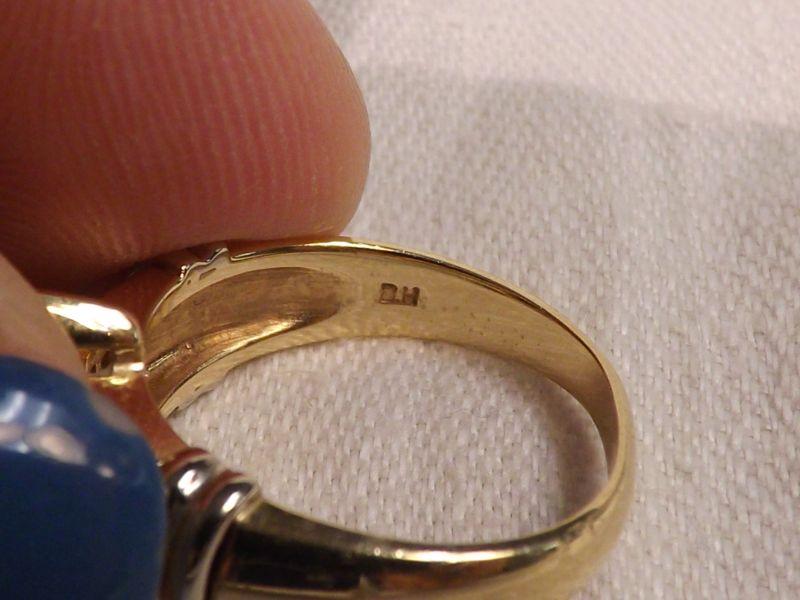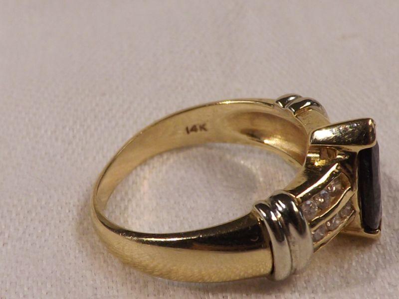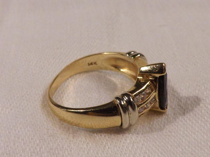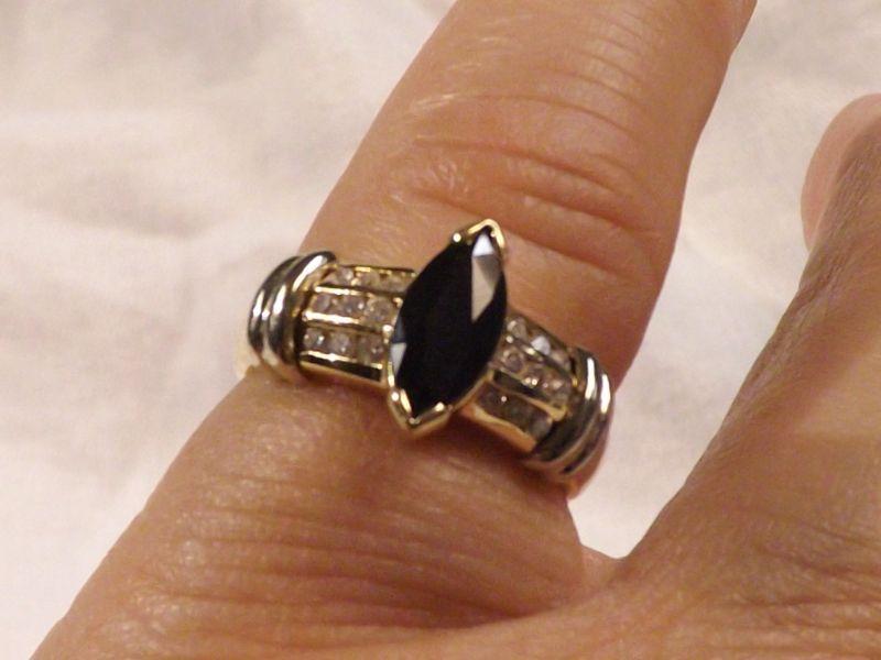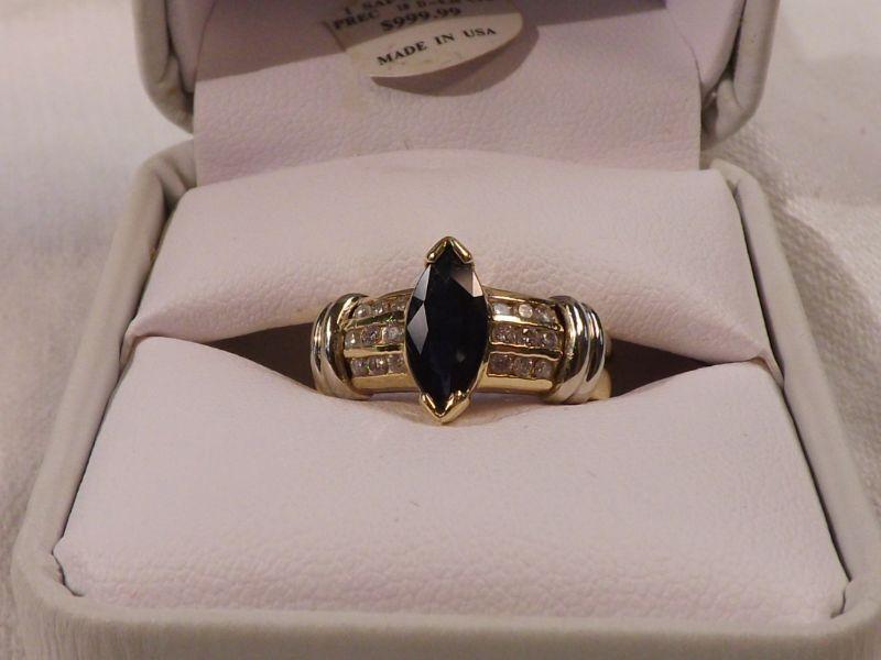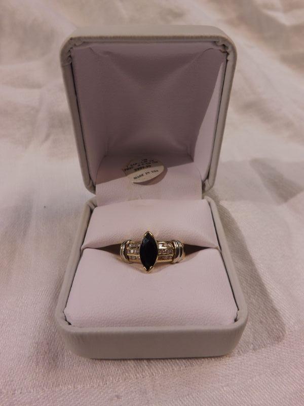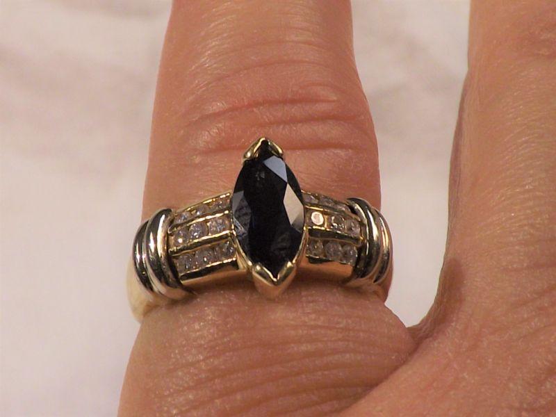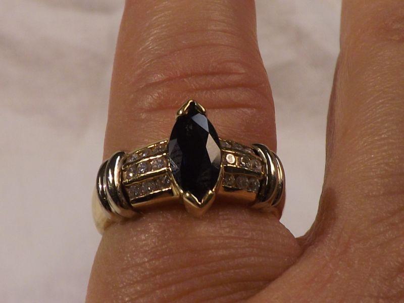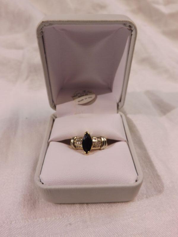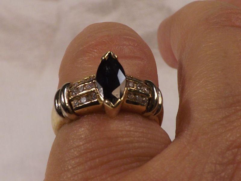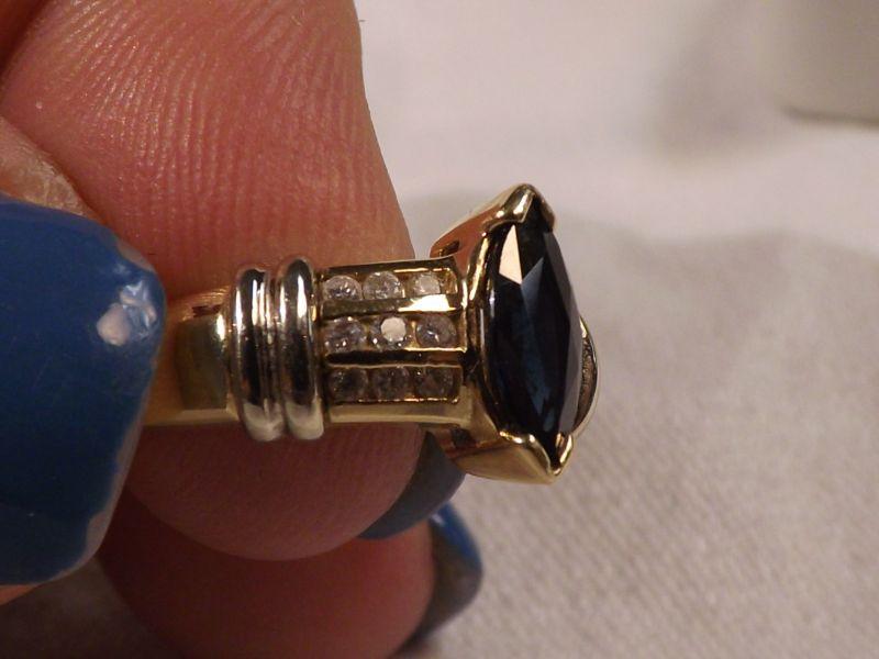 14k yellow-gold (wt. 5 gr), Marquis-cut Blue Sapphire (1.09 ct) ring with 18 diamond chips (.26 ctw) signed BH. Vintage ring by Effy Company made in New York. Size 6.5-7. **Please read Terms and Conditions before placing a bid. Pick up is Wednesday, September 25 from 4pm to 7pm and Saturday, September 28 from 9am to 1pm in Williamstown, NJ. All sales are final. All sales are as is, where is. Please review all photos. Any props included in photos are not included in listing. All measurements are approximate.
