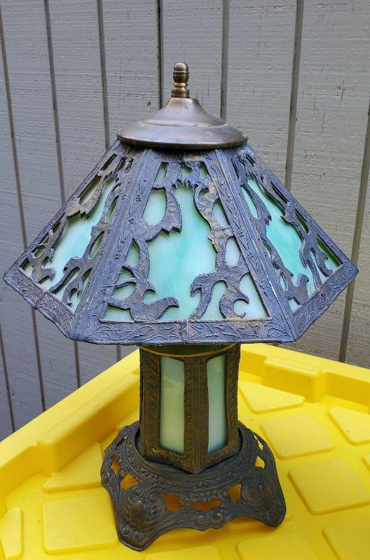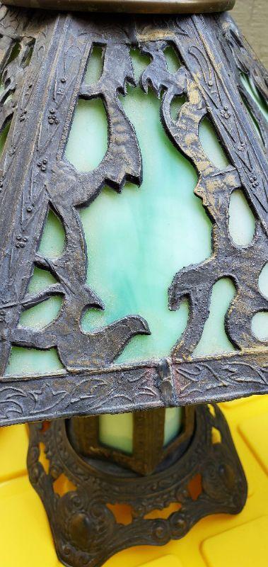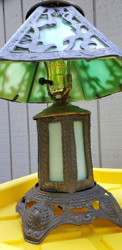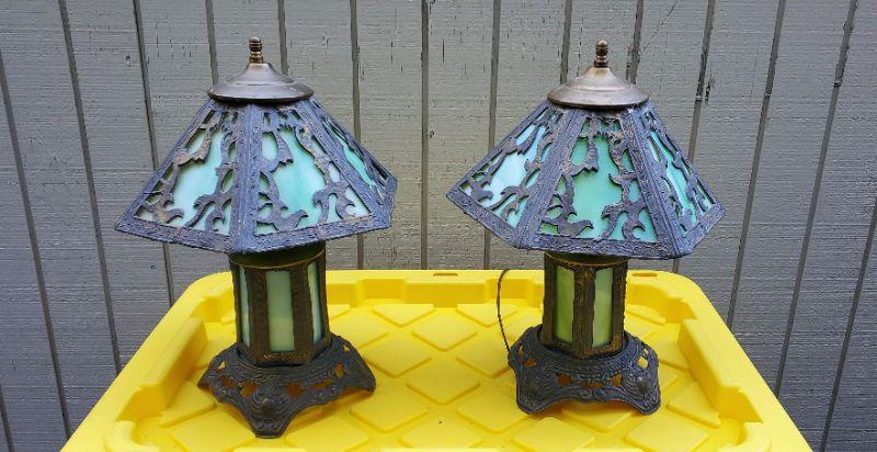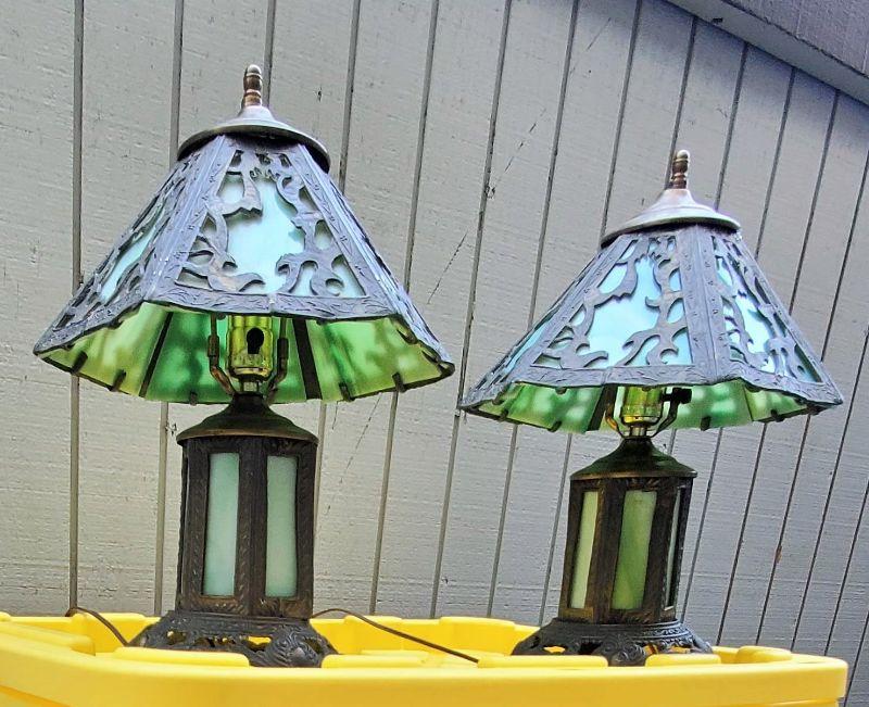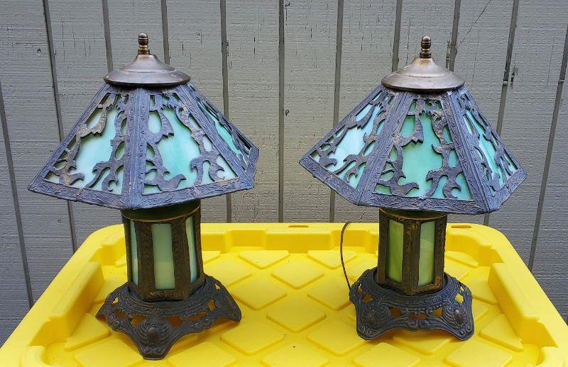 A gorgeous pair of 16" tall vintage brass lamps in an Arts and Crafts style with light mint green slag glass inserts.