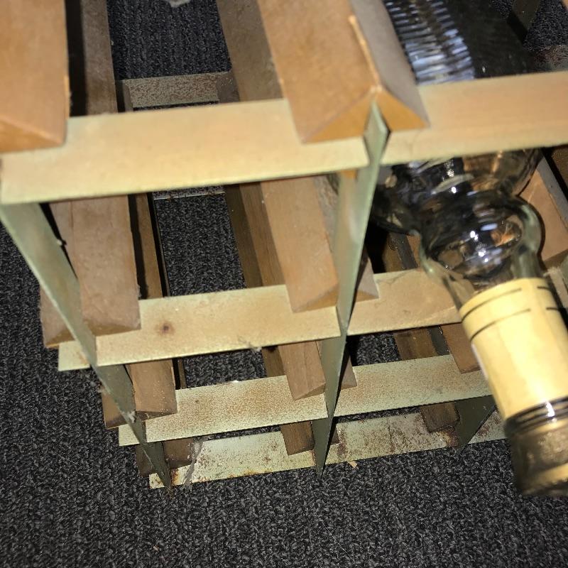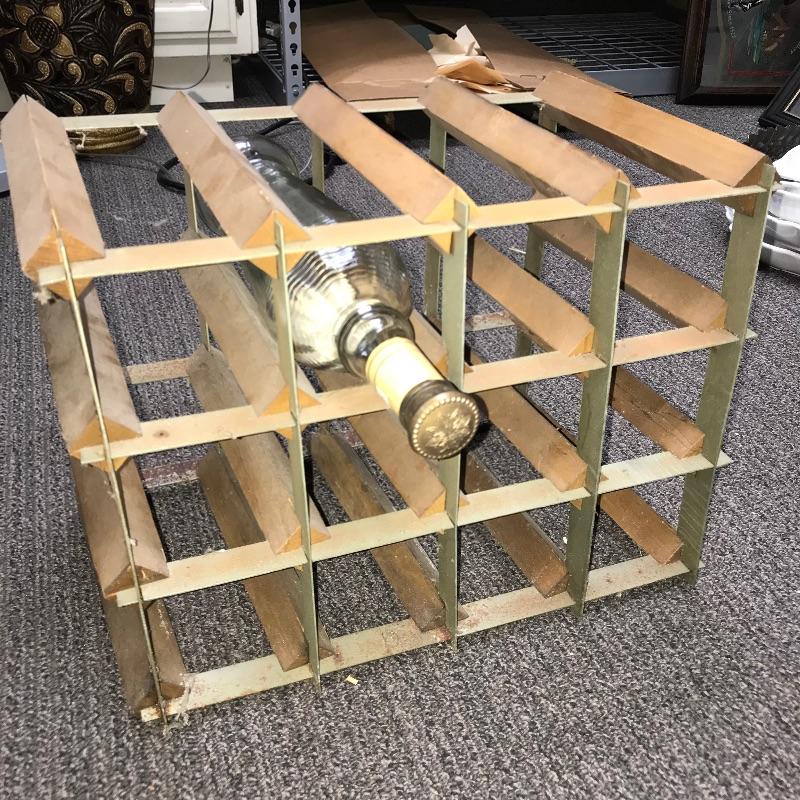 Vintage 16-bottle wine rack. Item is solid but there is some oxidization and rust on the metal parts. see pictures.