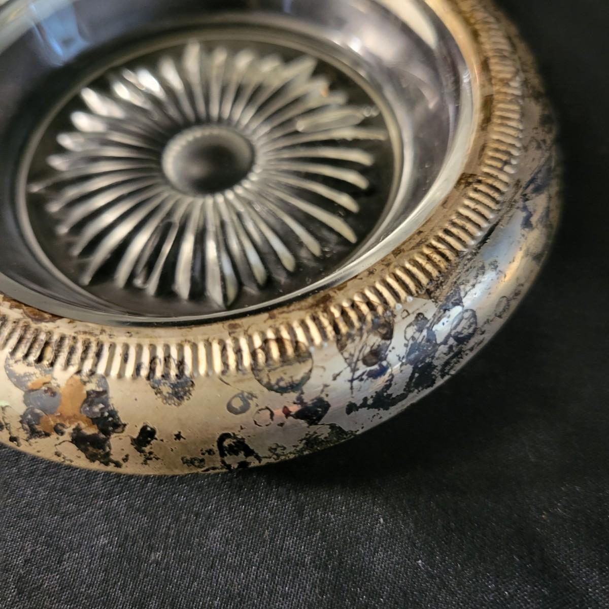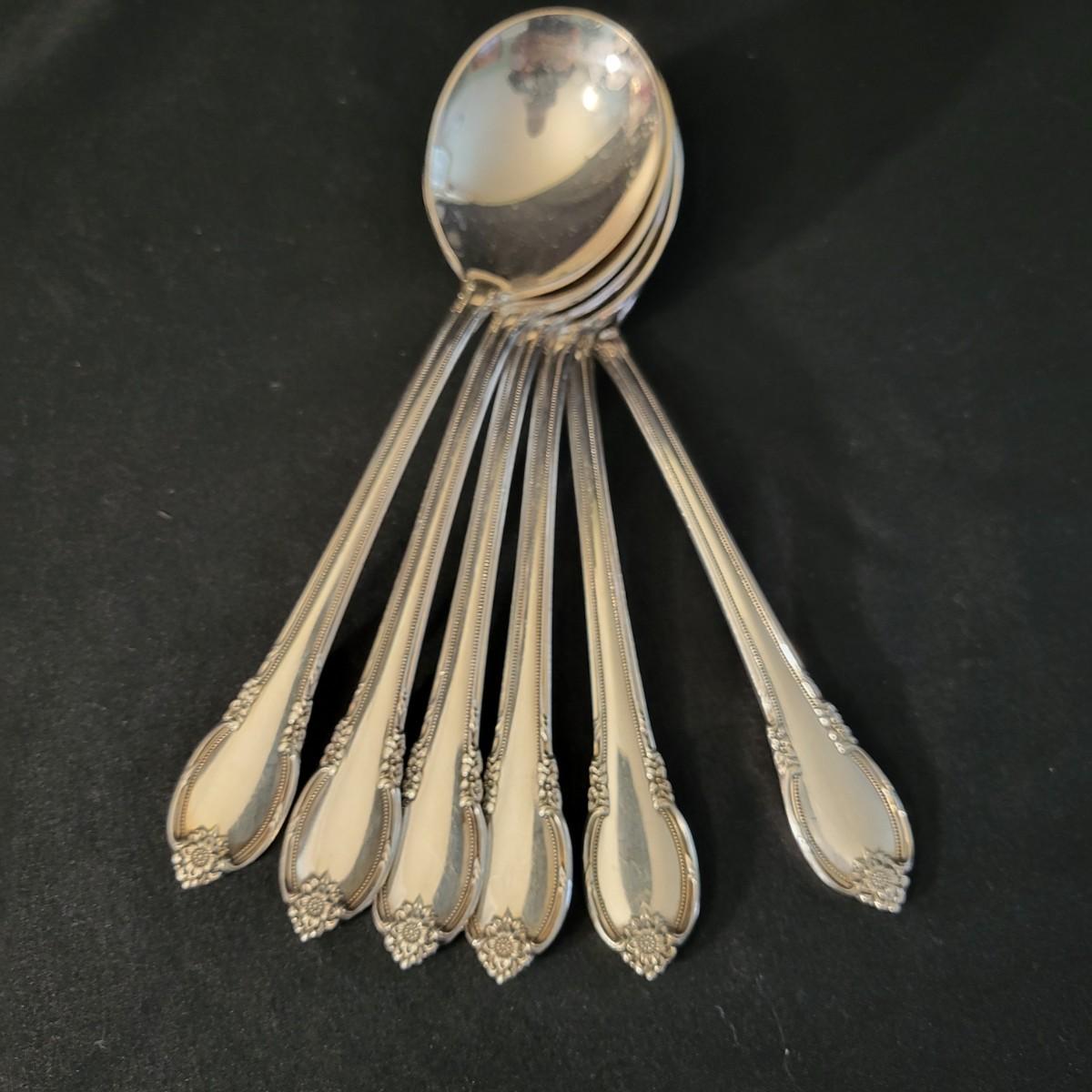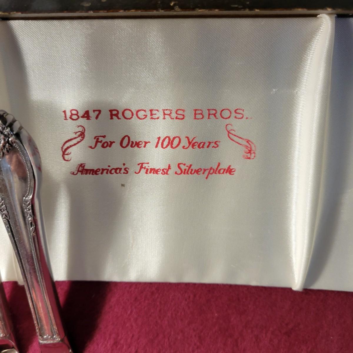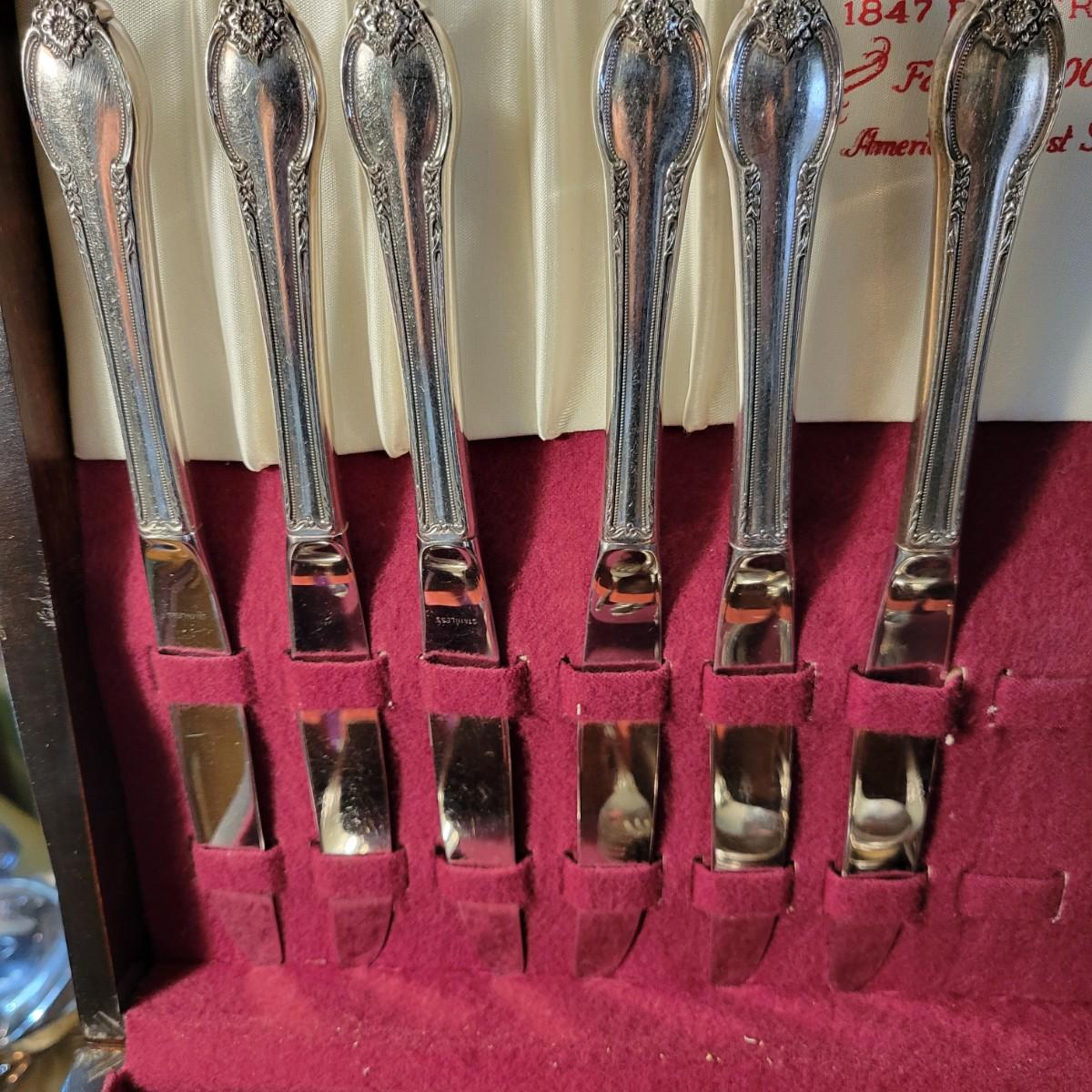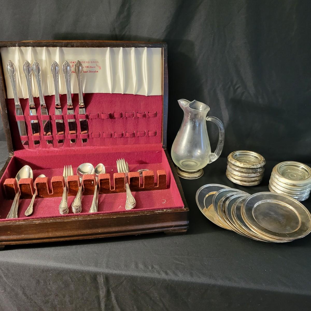 A vintage 1847 Rogers Bros Plated silver silverware set with a four piece with six place settings and additional pieces in good condition. The pattern is Remembrance and introduced in 1948 and subsequently discontinued. Also included is a storage box for the silverware, a glass pitcher with a played silver base, ten glass coasters with plated silver accents and six plated silver plates manufactured by FB Rogers. Wood storage box (note the scratch mark) measures approximately 17" x 11.5" x 4" Shipping available