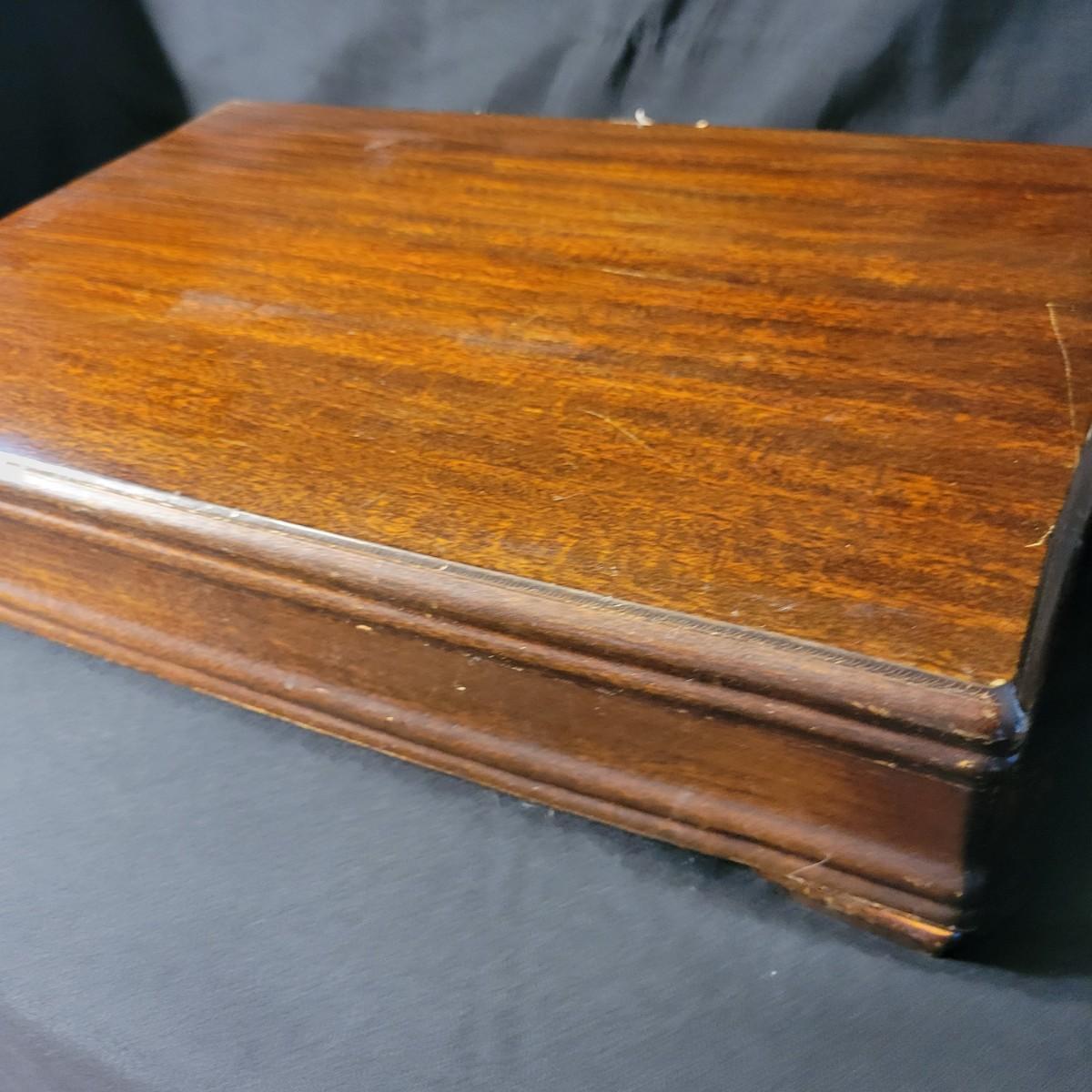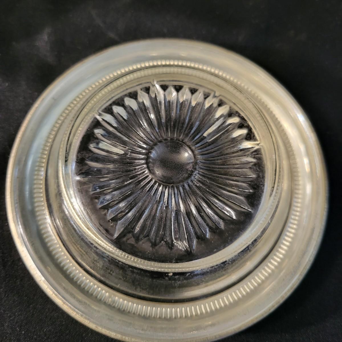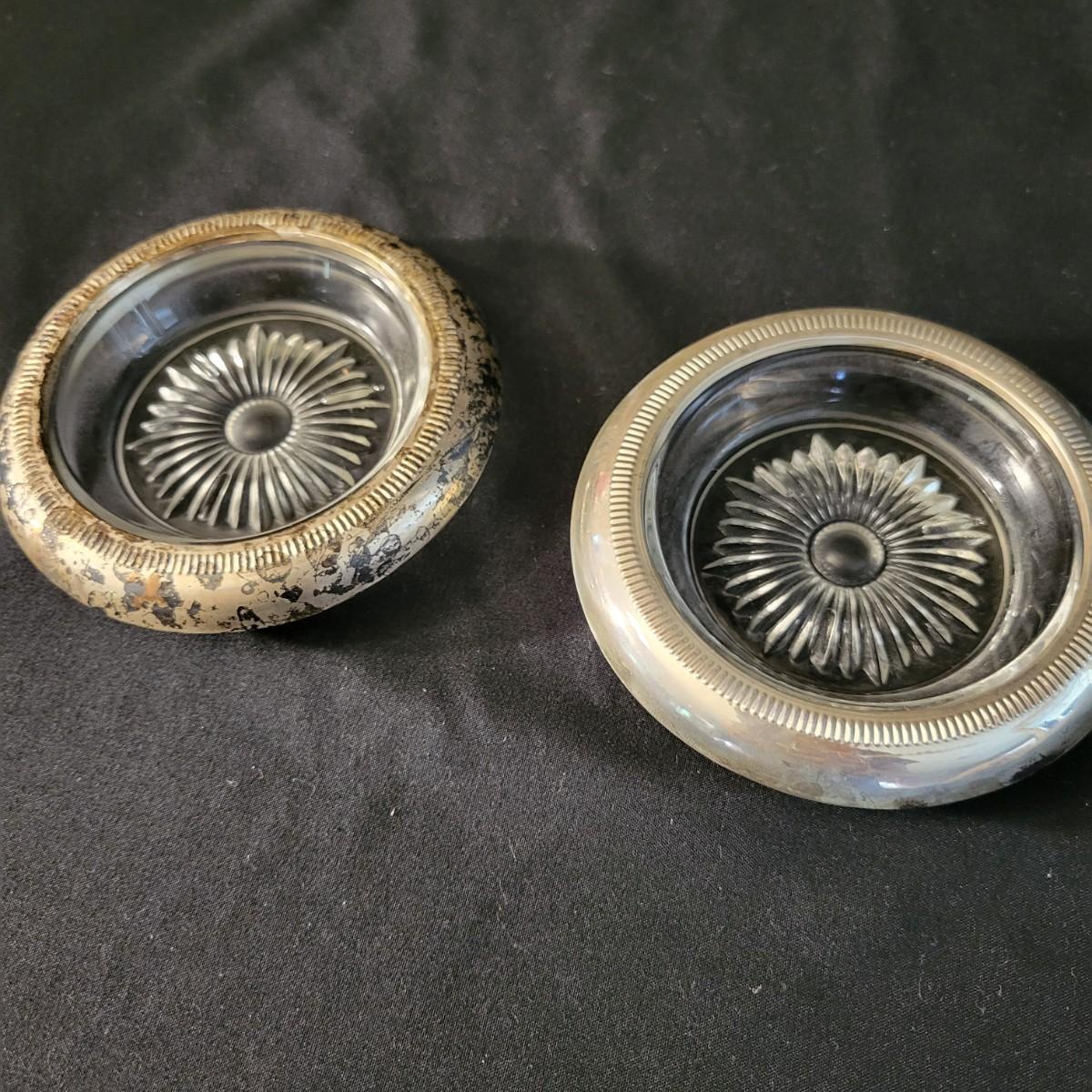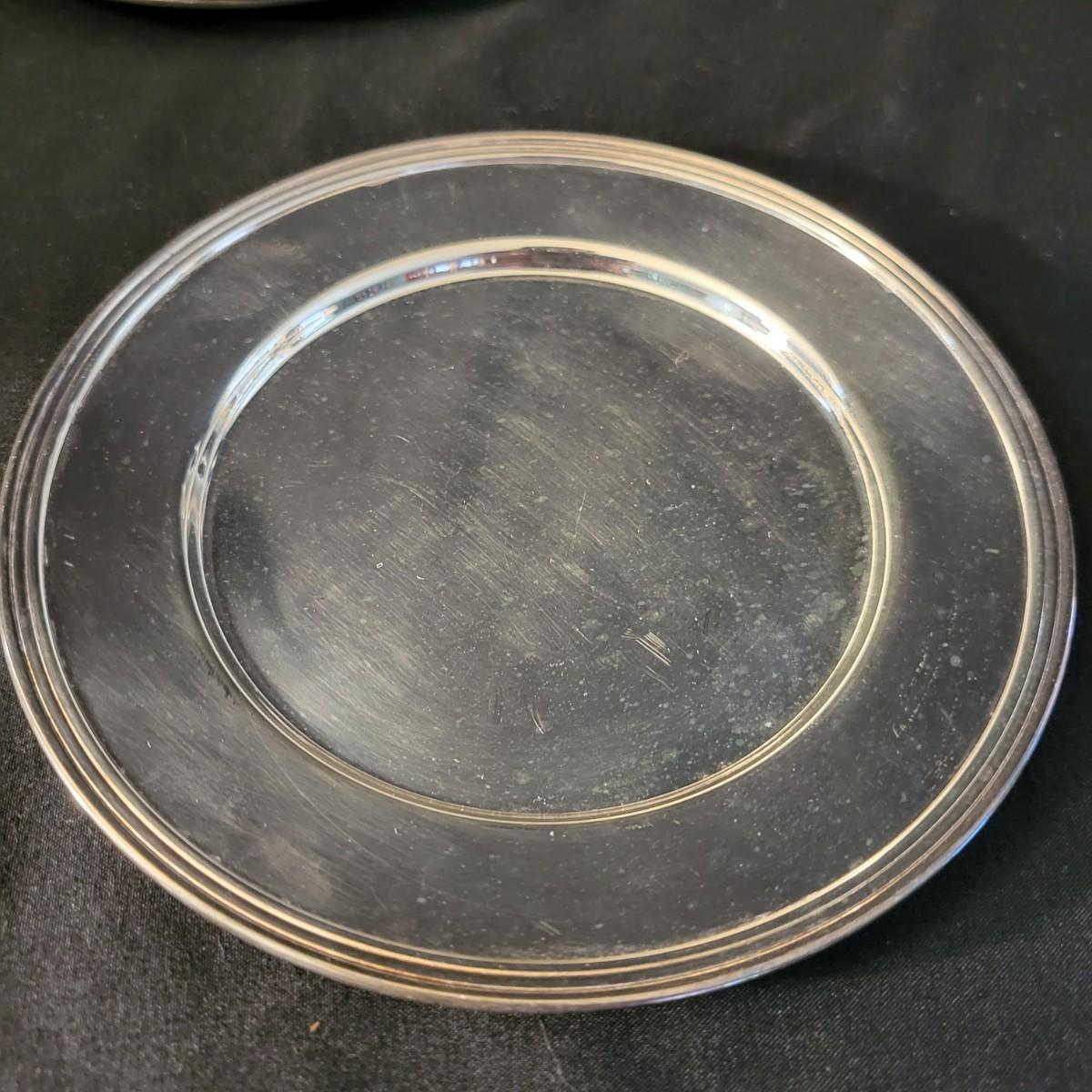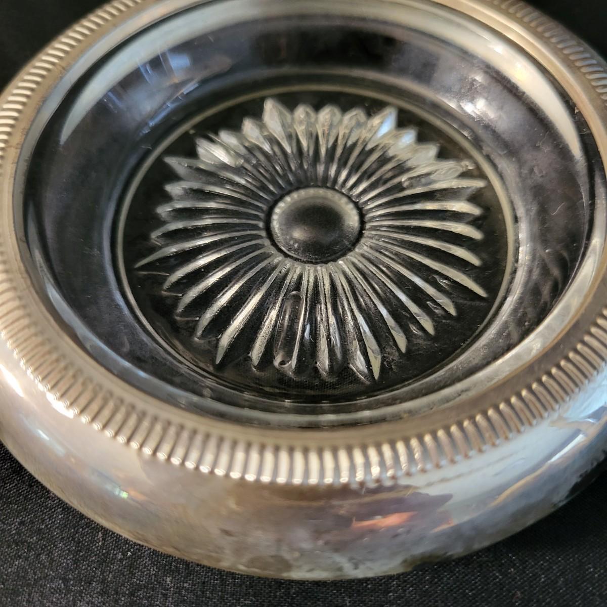A vintage 1847 Rogers Bros Plated silver silverware set with a four piece with six place settings and additional pieces in good condition. The pattern is Remembrance and introduced in 1948 and subsequently discontinued. Also included is a storage box for the silverware, a glass pitcher with a played silver base, ten glass coasters with plated silver accents and six plated silver plates manufactured by FB Rogers. Wood storage box (note the scratch mark) measures approximately 17" x 11.5" x 4" Shipping available