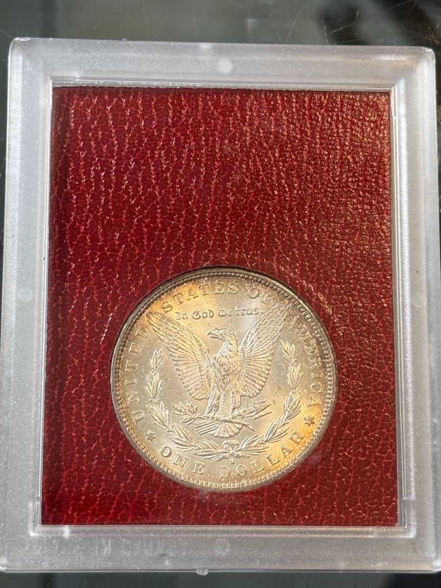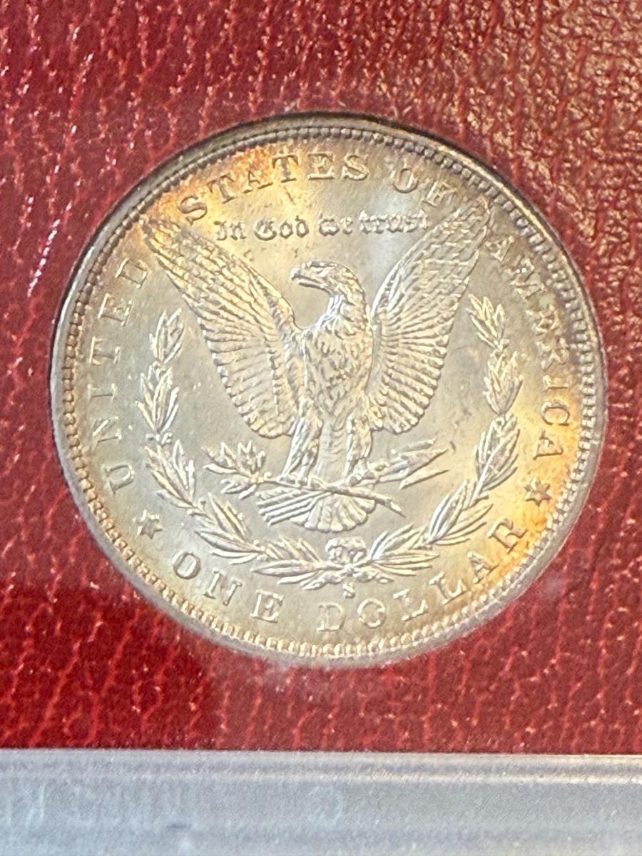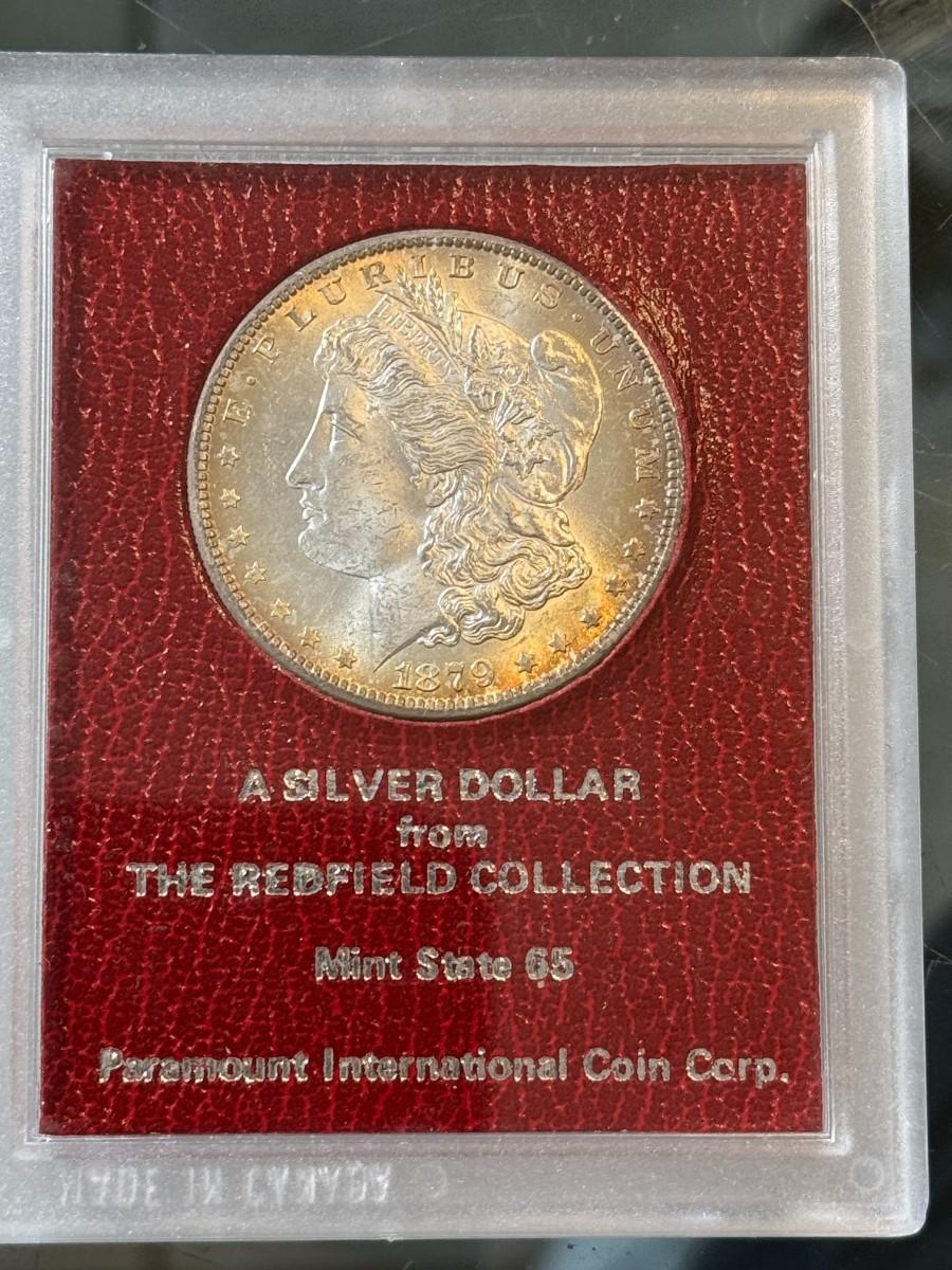 VINTAGE 1879-S MS65 GRADED/HOLDERED REDFIELD MORGAN SILVER DOLLAR AS PICTURED. GOLDEN TONED RIMS. $5 DOMESTIC SHIPPING.