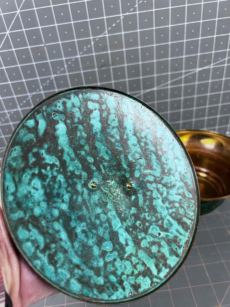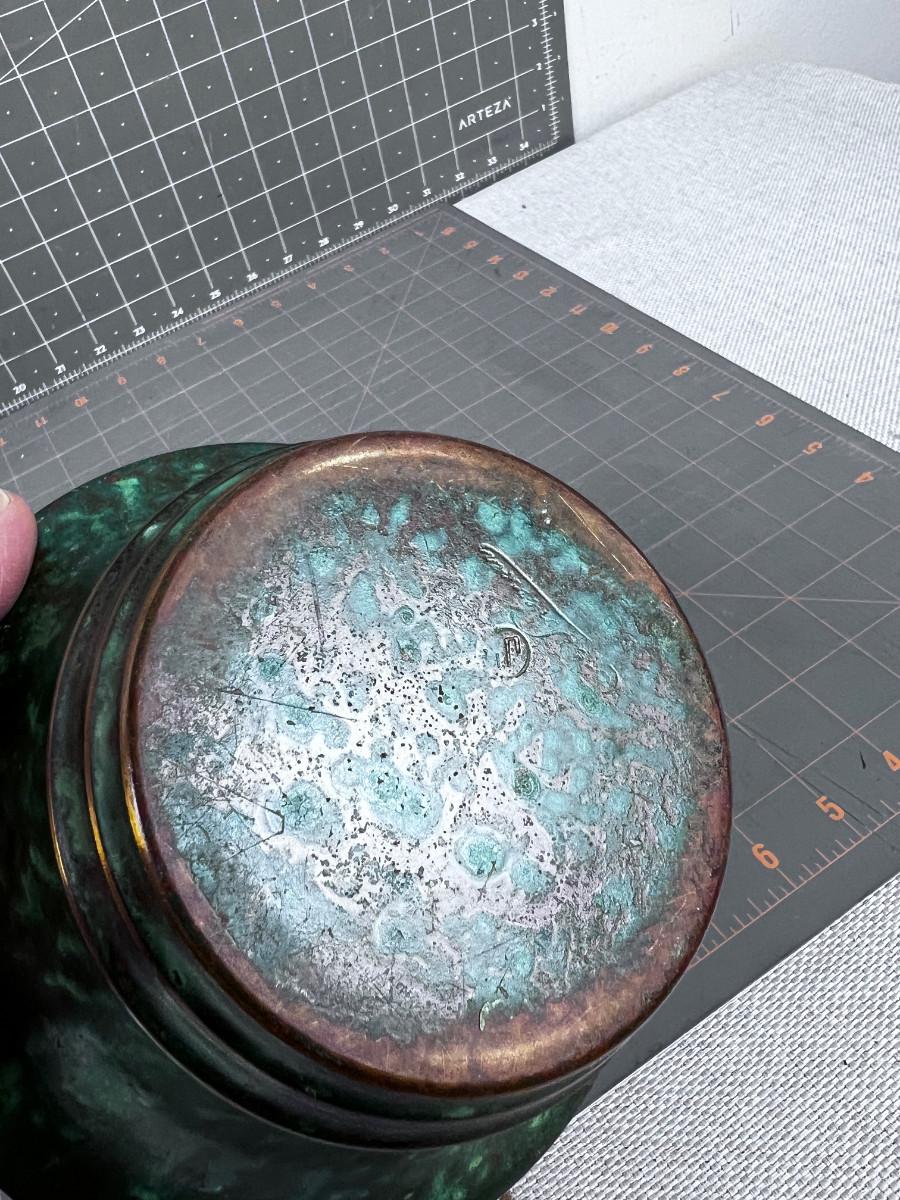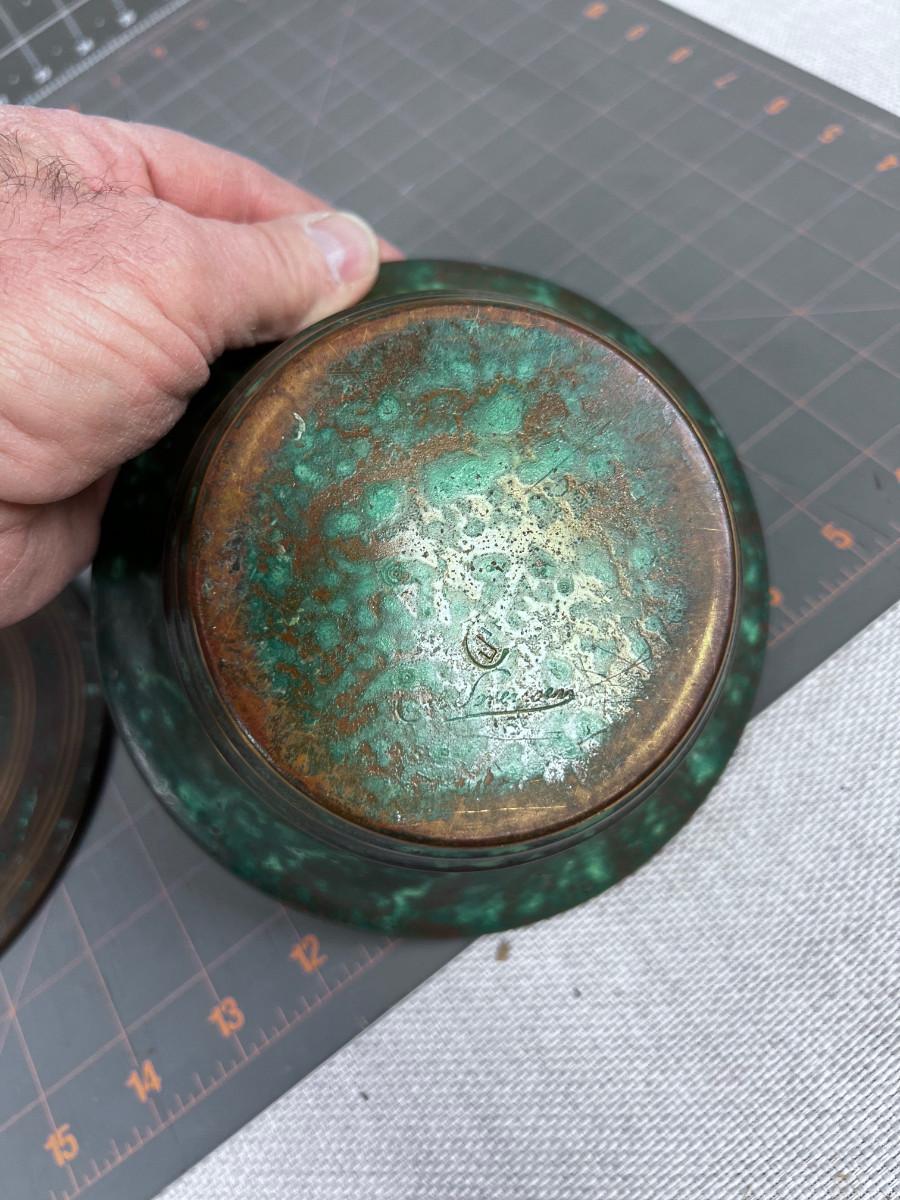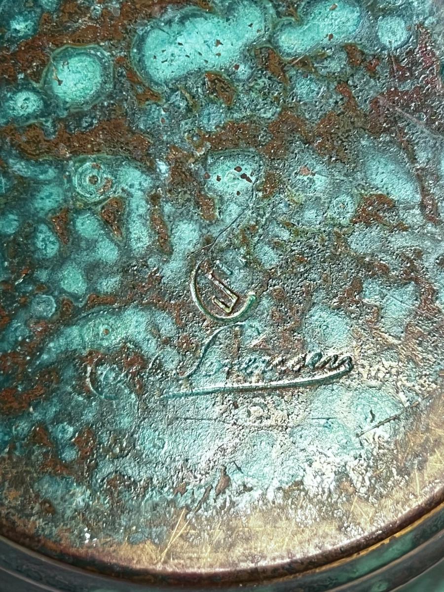 Metal Marked with a signature. Hard to Read. Lidded. Measures. 6" Across by 5" Vintage 1920's Carl Sorensen Bronze Verdigris Covered Dish Art Deco Ducks . Please review the photos for condition and size. In our opinion very nice condition.