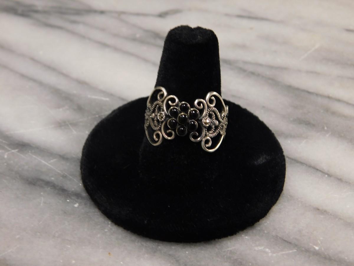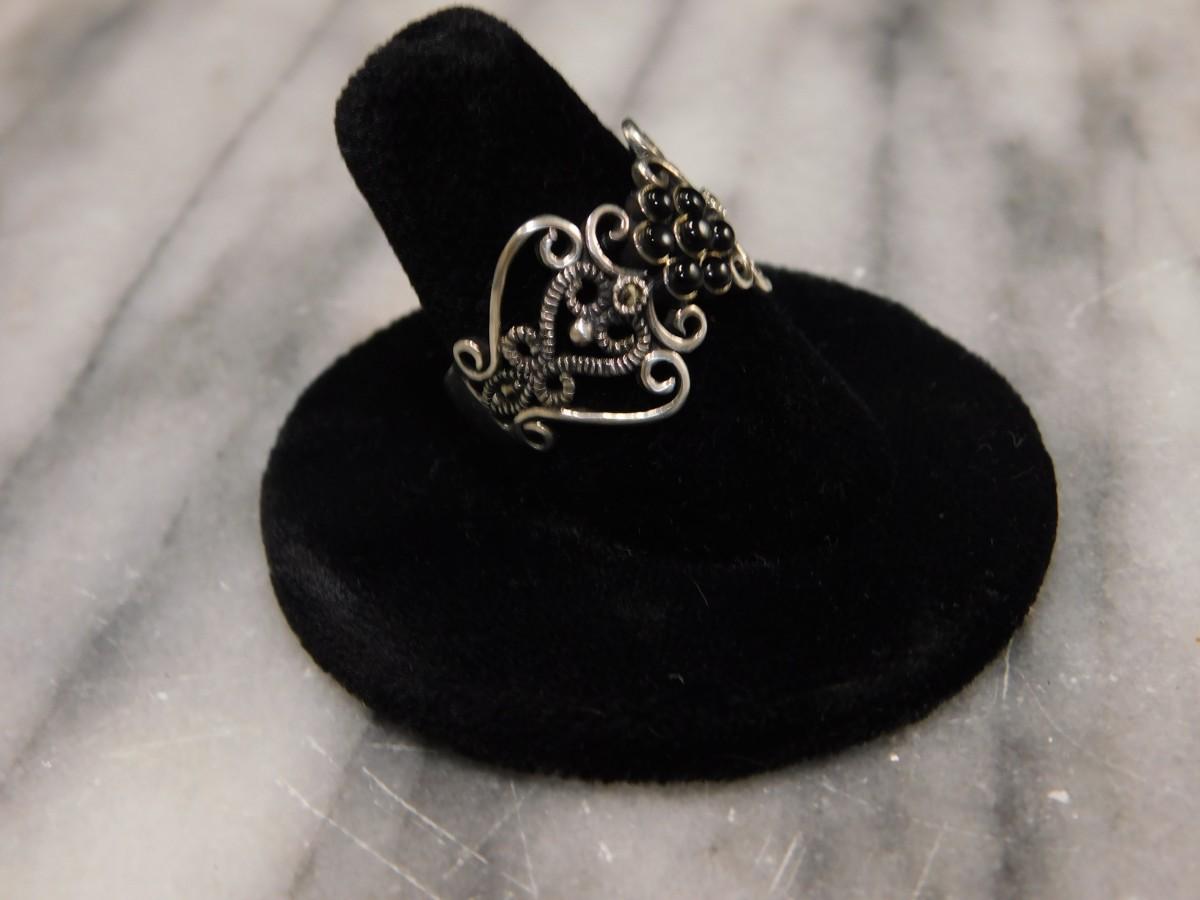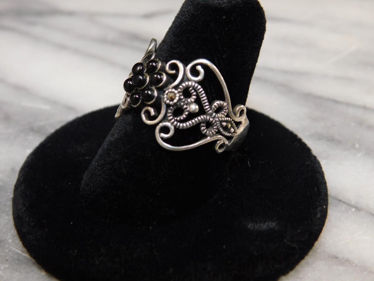 Vintage 1925 Sterling Onyx and Marcasite Filigree Ring Size 8.5 - 2.6g