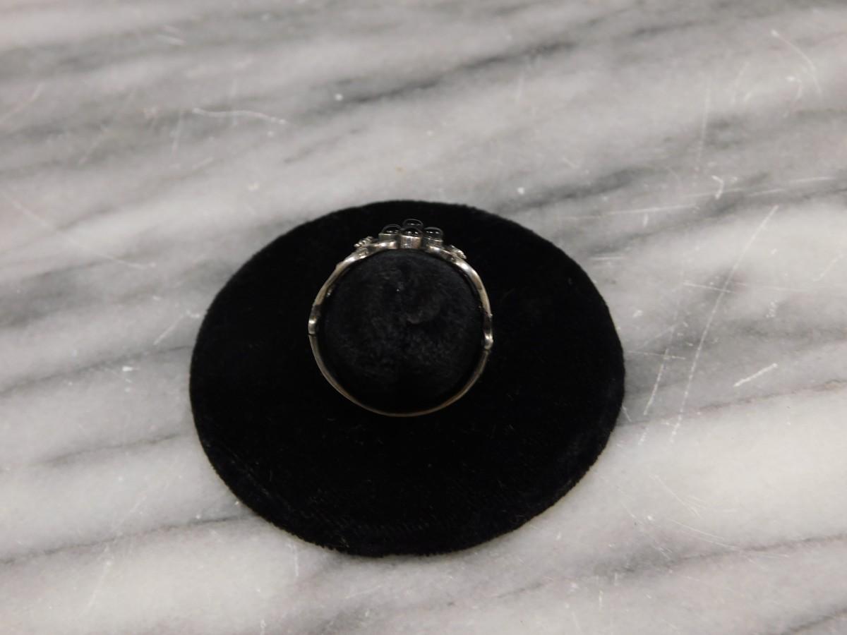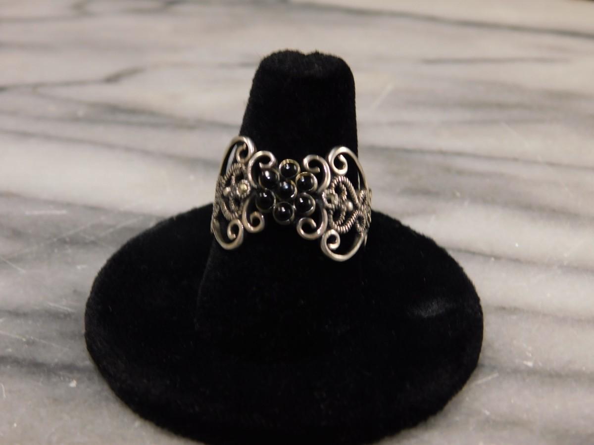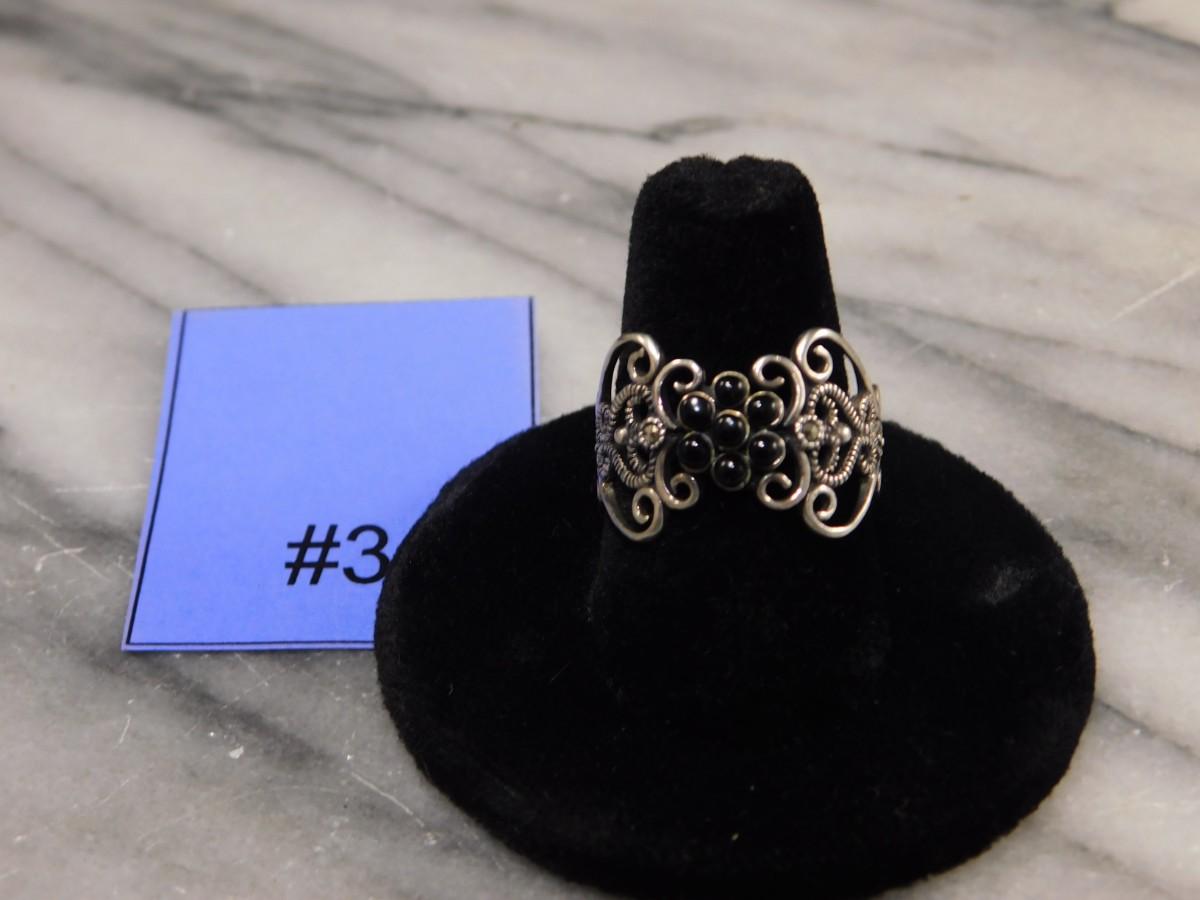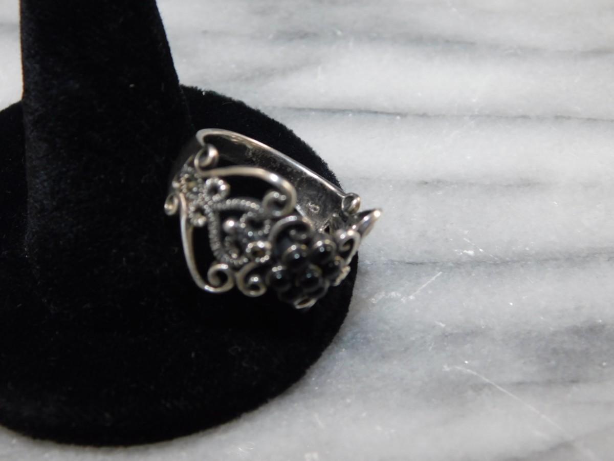 Vintage 1925 Sterling Onyx and Marcasite Filigree Ring Size 8.5 - 2.6g