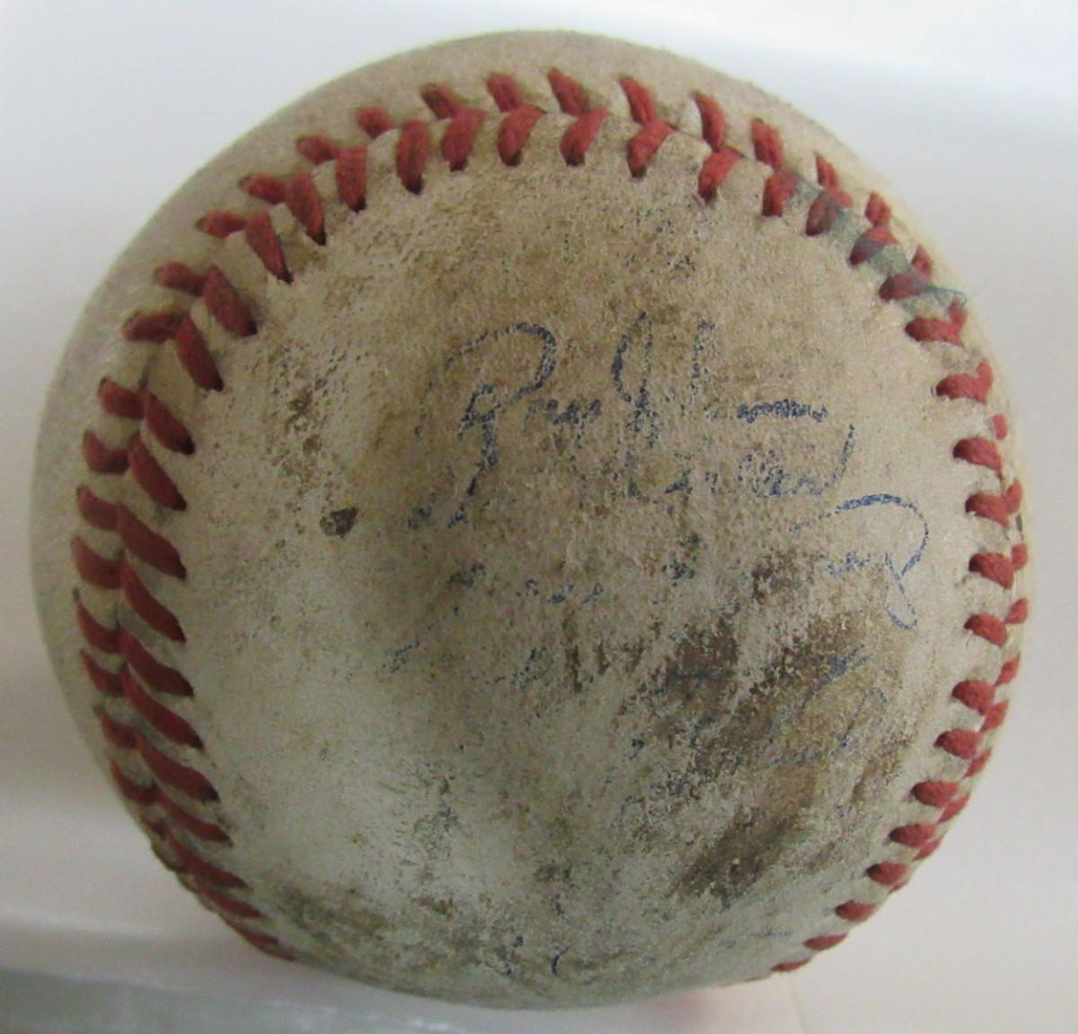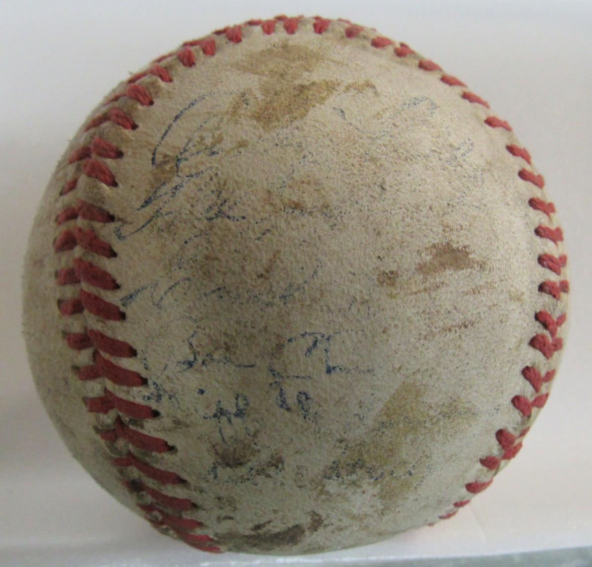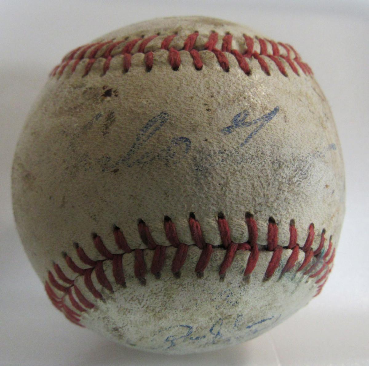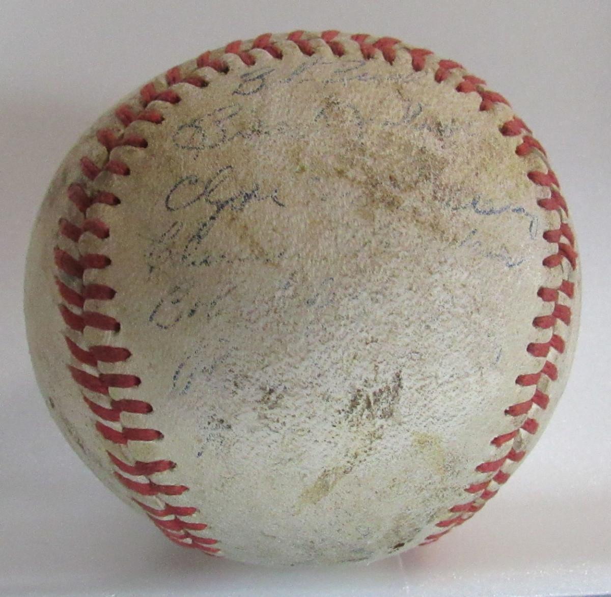 Not certified. Owner said it is from the 30s-40s. Signatures are wearing off. Quite faded, but still some are recognizable. Soiled, but a nice piece of history. Some names include: Bob Rusch, pitcher, Billy Jurgus, shortstop, Phil Caveretta, many more. Shipping available at actual shipping cost plus $5.00 handling fee on one box, $10.00 handling fee on 2 boxes. You will receive exact item as pictured, no refunds, returns not accepted.