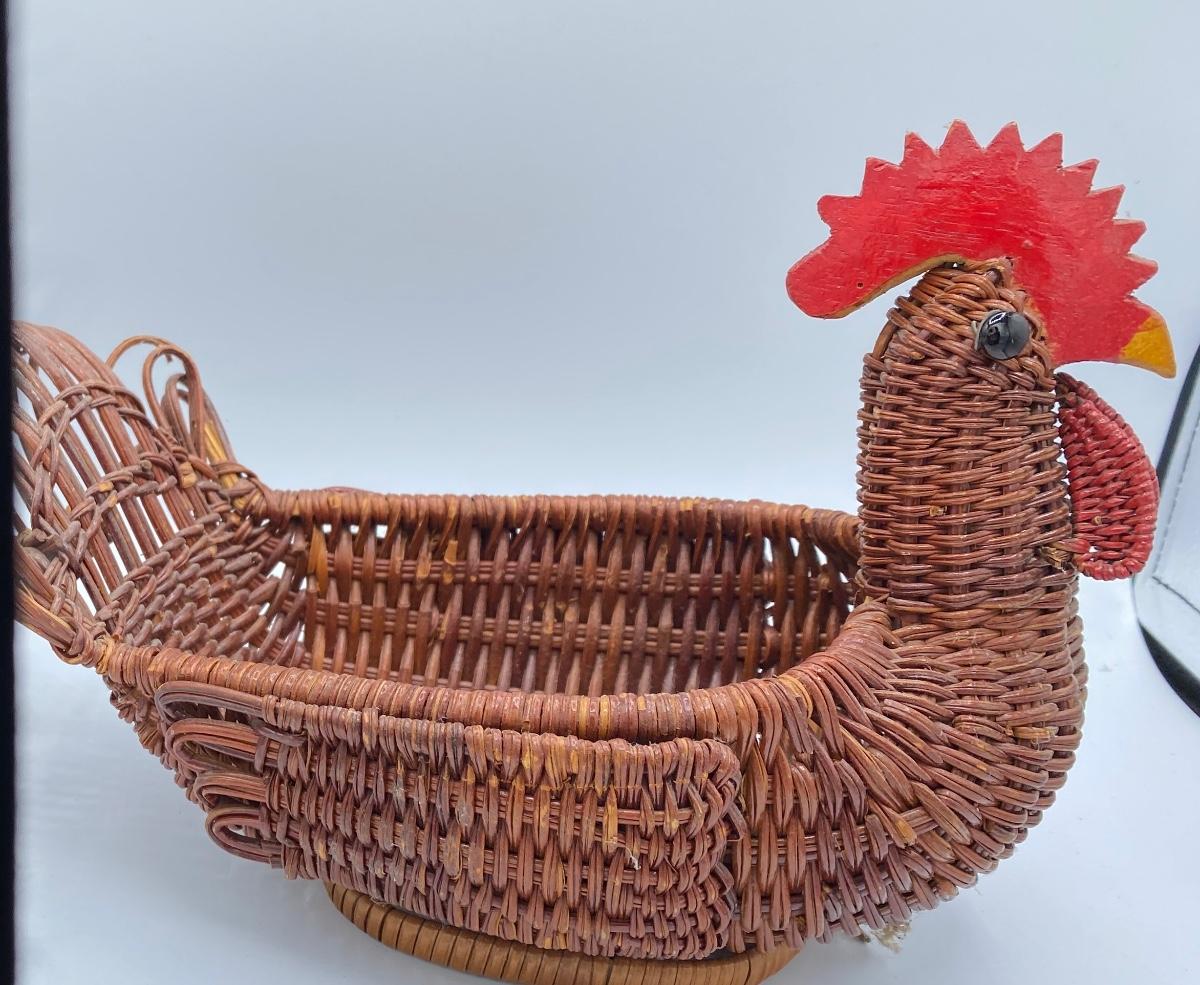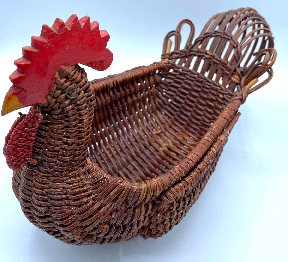 Darling Folk Art Basket from the 1930s with wooden comb /beak, cute! Measures 11” x 5.5 x 5”. One black bead eye missing.