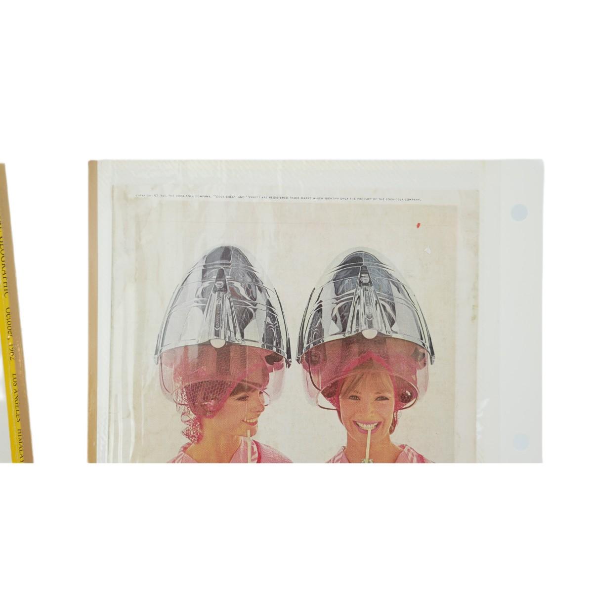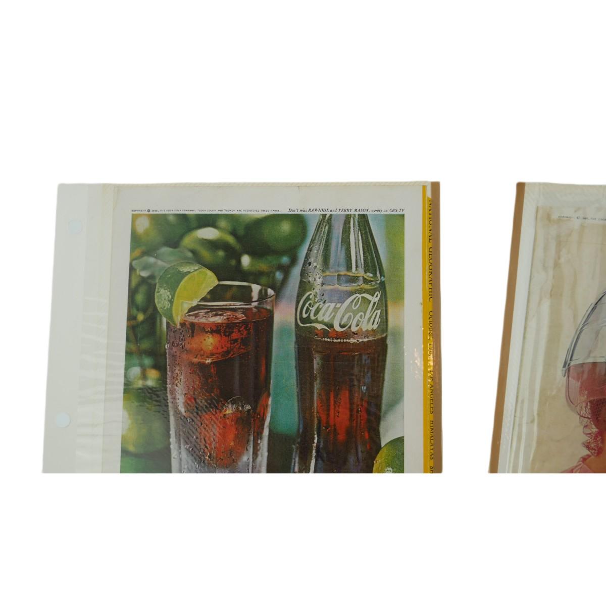 Three vintage Coca-Cola advertisements. One dated October 1962, one dated 1965, and one dated 1946. Taken from The National Geogrpahic Magazine and kept in these loose scrapbook sheets. Varying condition, overall good shape for their age. Each magazine advertisement measures approximately L 7" x H 10". Lot weighs 4 oz. (C84)