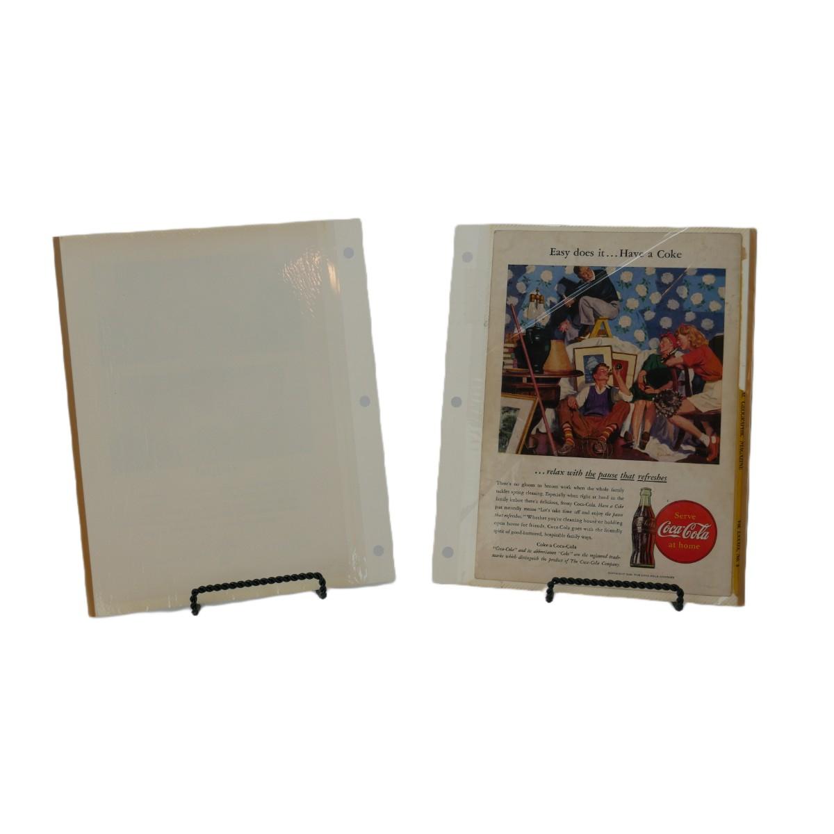 Three vintage Coca-Cola advertisements. One dated October 1962, one dated 1965, and one dated 1946. Taken from The National Geogrpahic Magazine and kept in these loose scrapbook sheets. Varying condition, overall good shape for their age. Each magazine advertisement measures approximately L 7" x H 10". Lot weighs 4 oz. (C84)