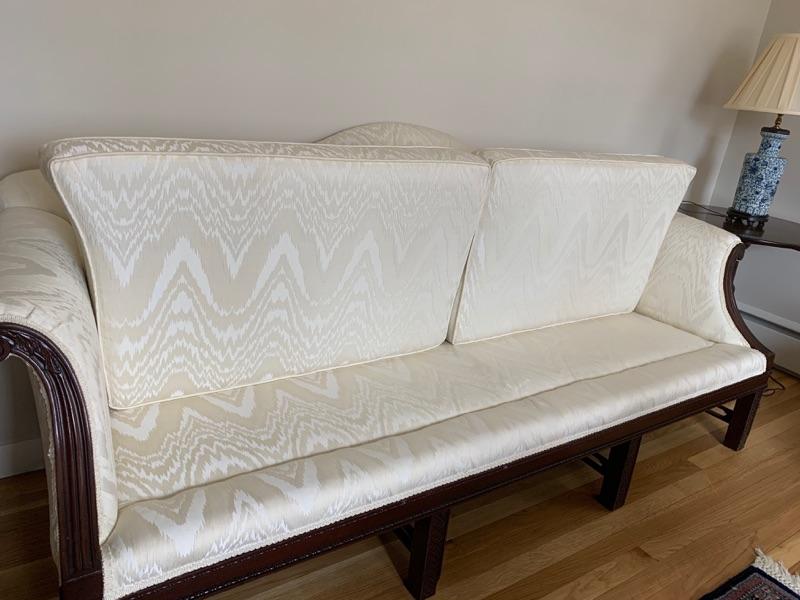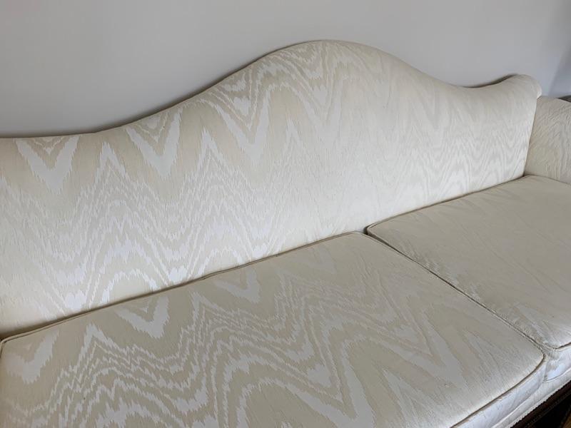 Vintage 1940's camelback sofa, newly recovered in ivory flame-stitch upholstery, Perfect condition and professionally re-upholstered with fluted Chippendale style legs in Mahogany wood.
