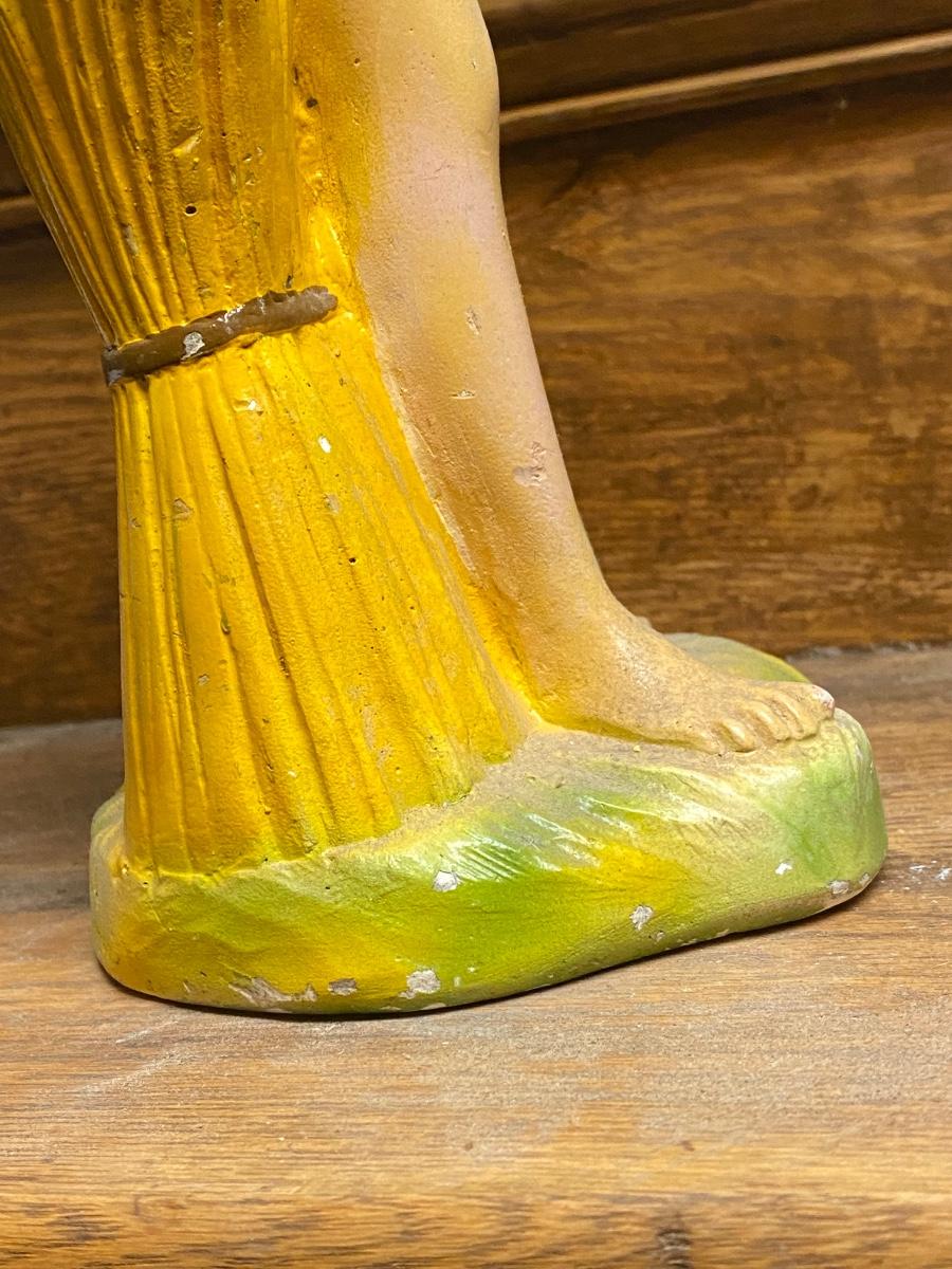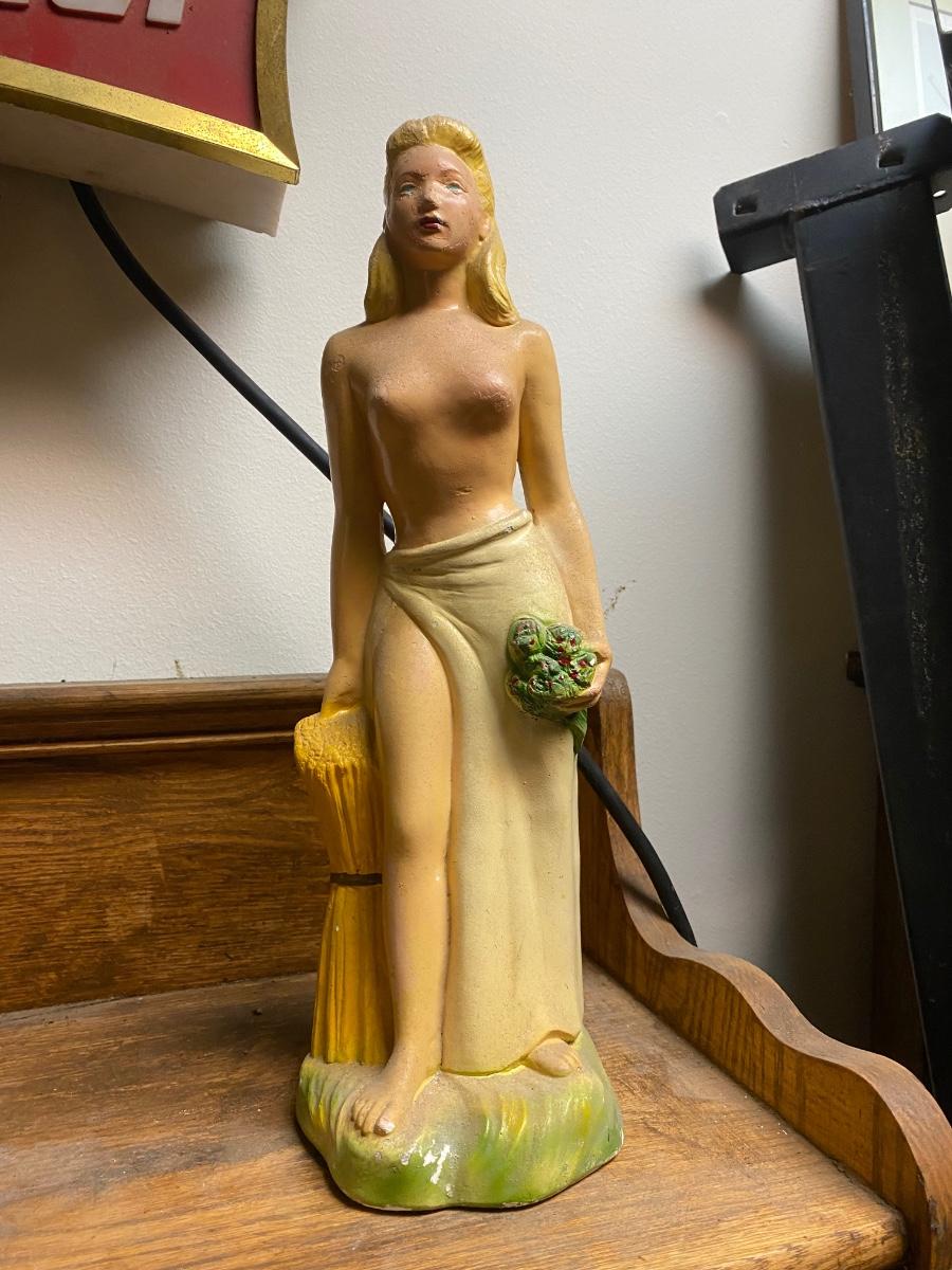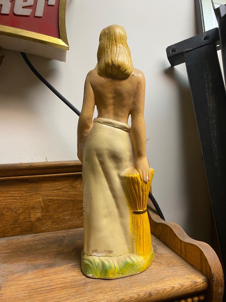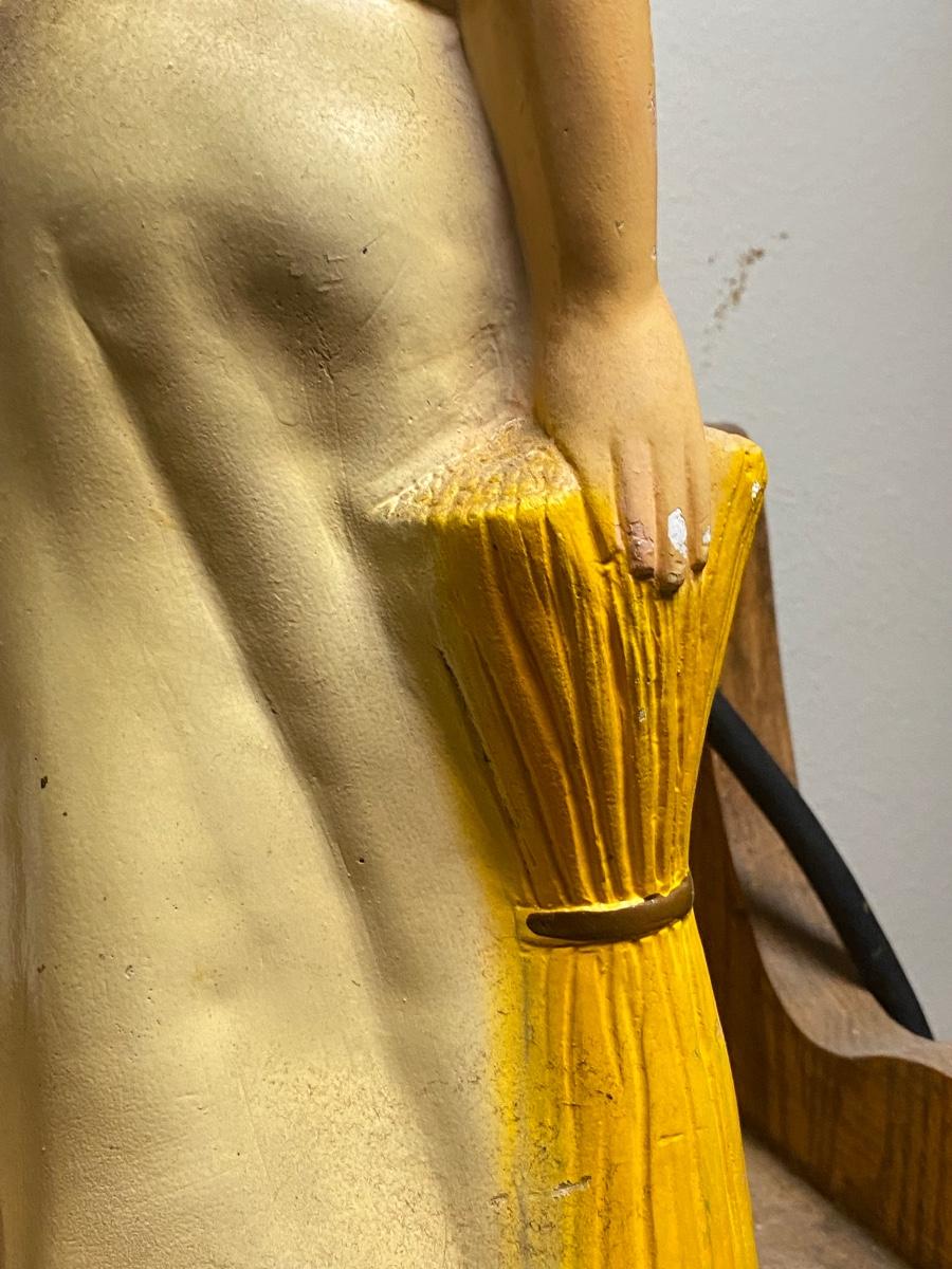 VINTAGE 1940S CARNIVAL CHALKWARE FIGURE, holding wheat, appprox 15" high, has signature and 1944 date on base. Some surfac e\\e issues as shown in photos, but nothing major.