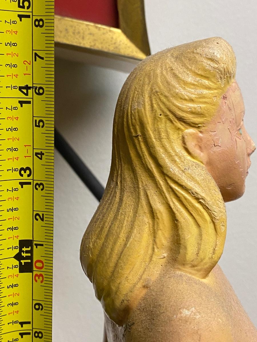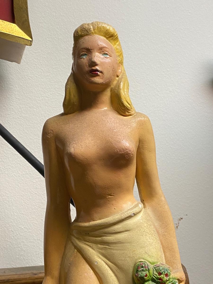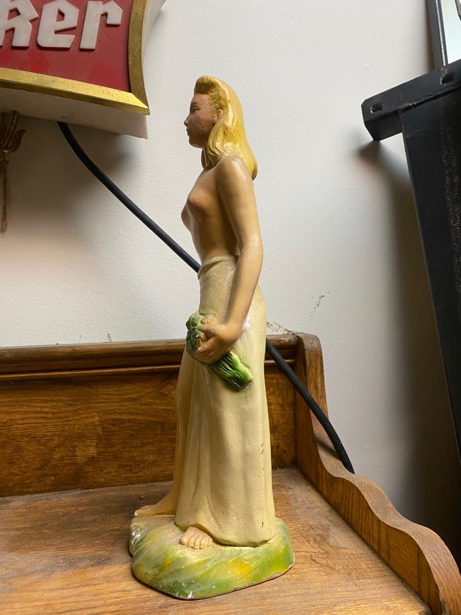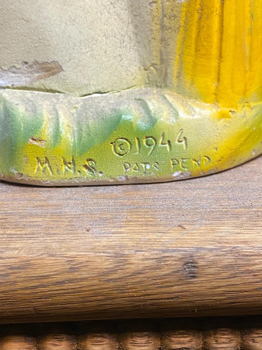 VINTAGE 1940S CARNIVAL CHALKWARE FIGURE, holding wheat, appprox 15" high, has signature and 1944 date on base. Some surfac e\\e issues as shown in photos, but nothing major.