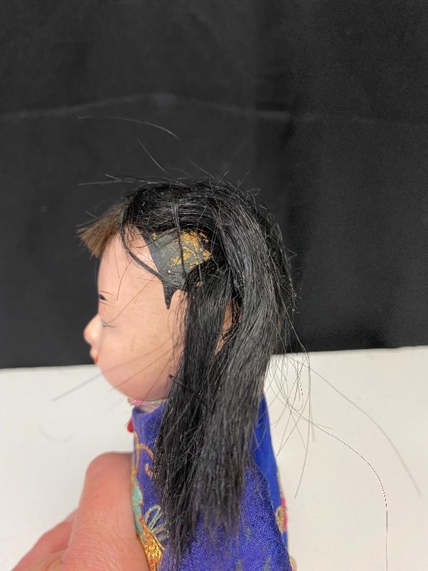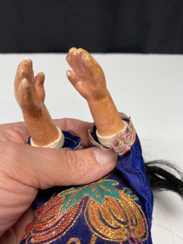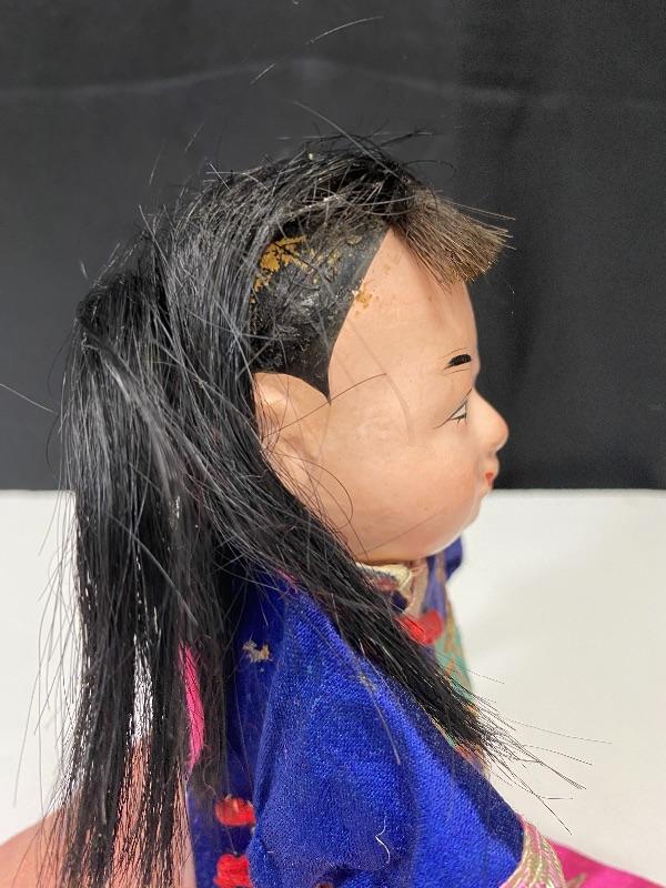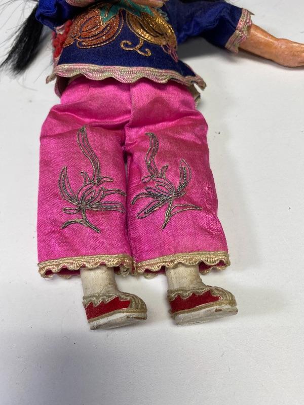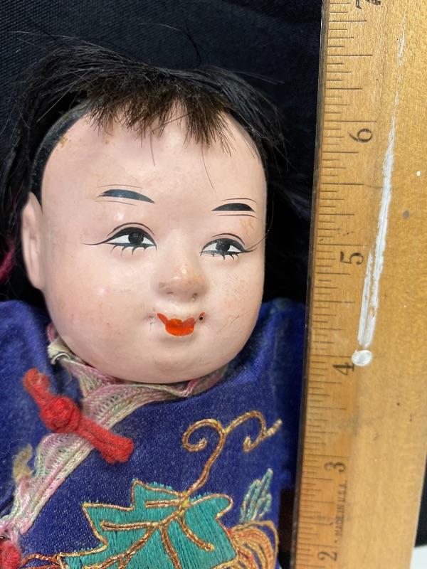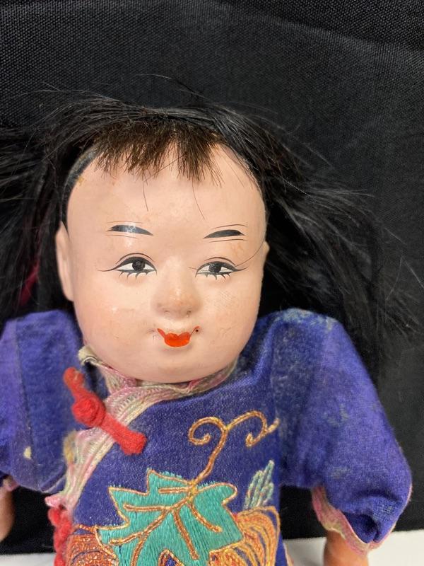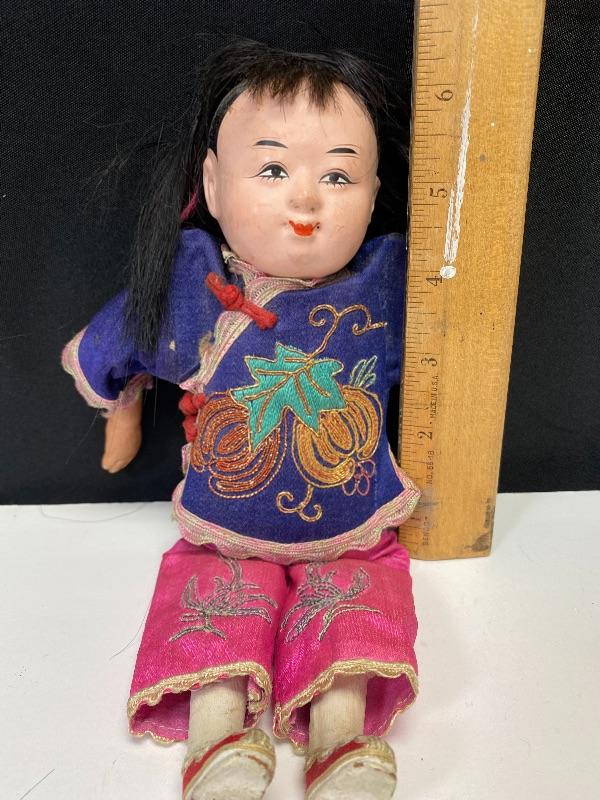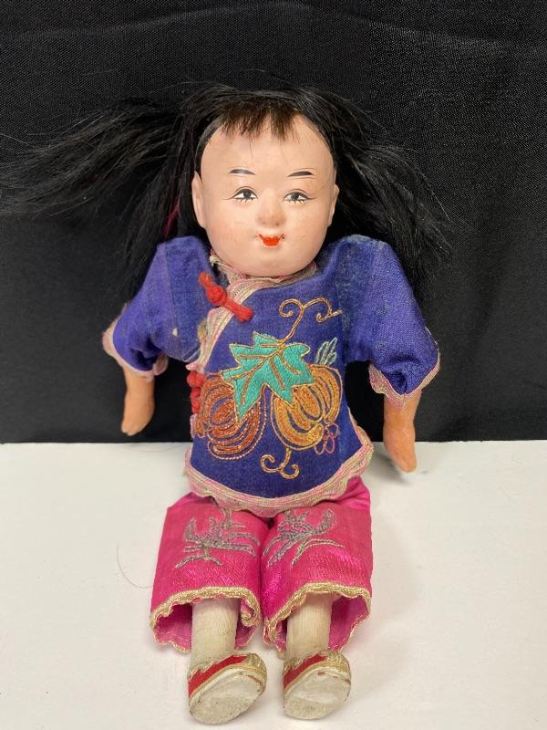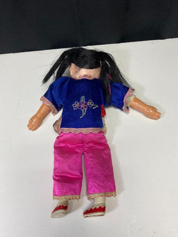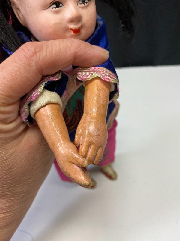 Vintage composite Asian doll. Chinese outfit, possibly from the 1940s. Has signs of age, hands are worn. About 10" size
