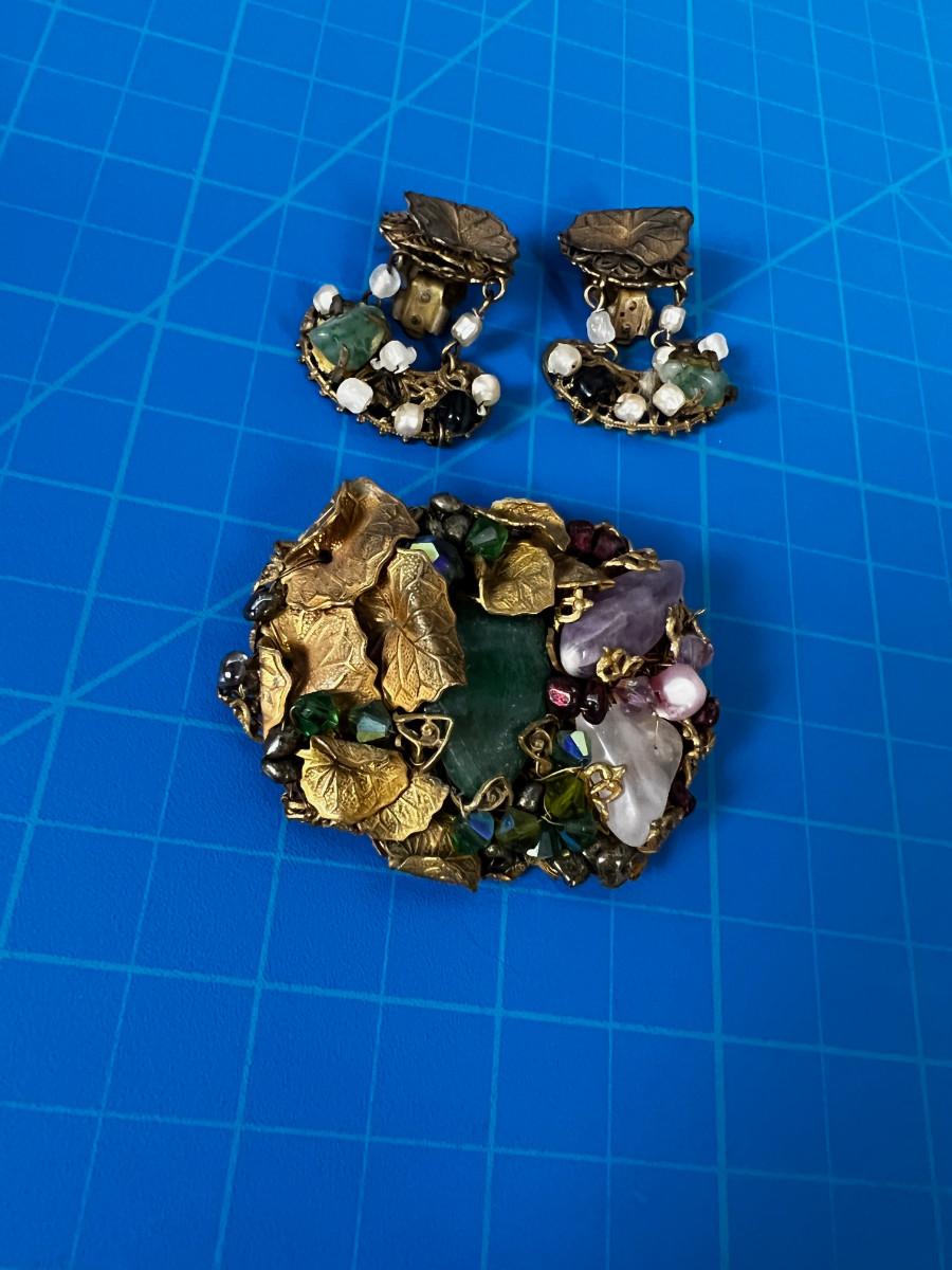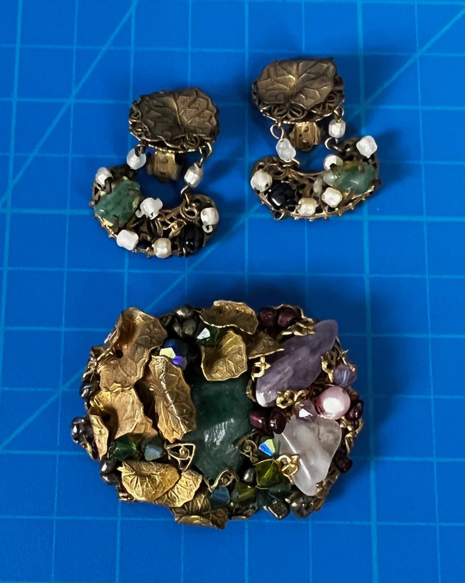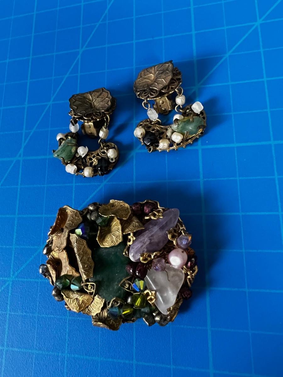 Vintage 1940's Earing & Pin Set, Jade & Amethyst