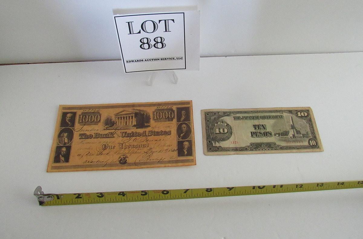 LOT88:  Vintage 1940s WWII Japanese Ten Pesos Bill, and Repro  Bank Note