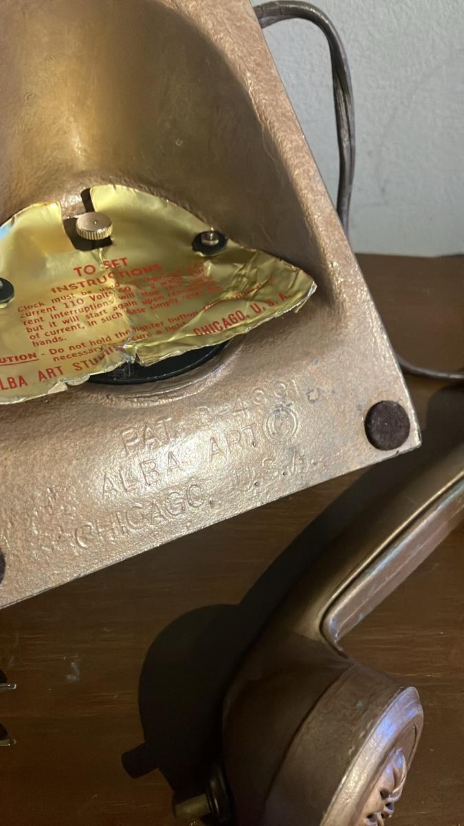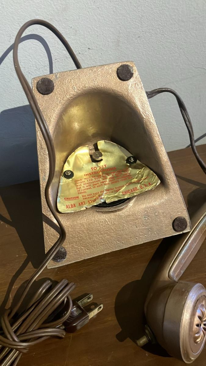 Step back into mid-century novelty with this charming and rare Timelite electric clock and cigarette lighter combo, cleverly disguised as a classic rotary dial telephone! Manufactured by Alba Art Studios, Chicago, USA (original label on underside marked "Pat. Pending"), this Art Deco-inspired piece dates to the 1940s-1950s era.