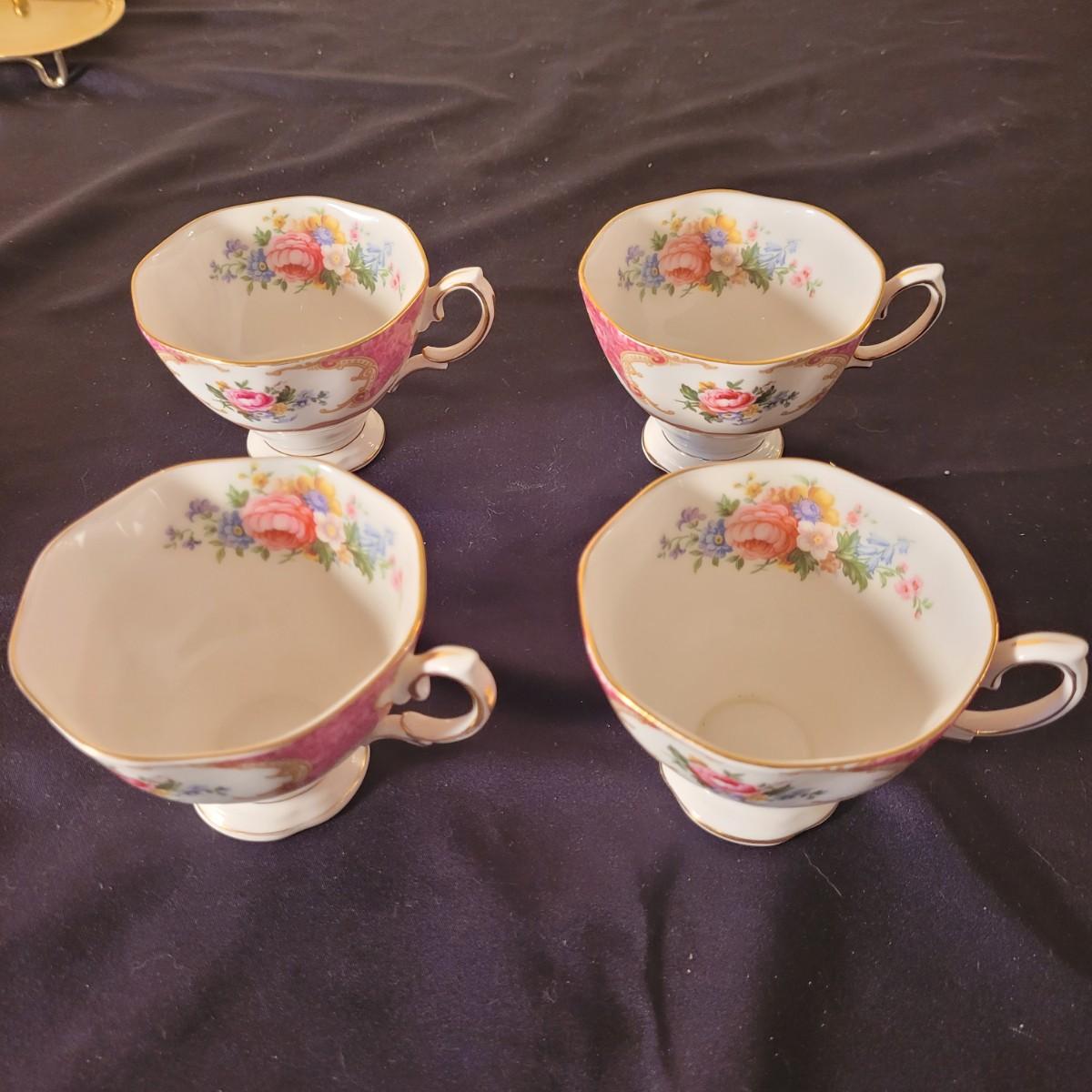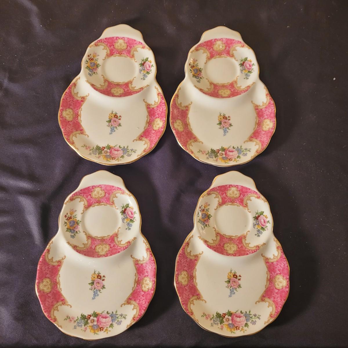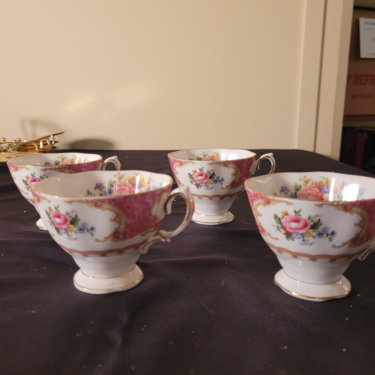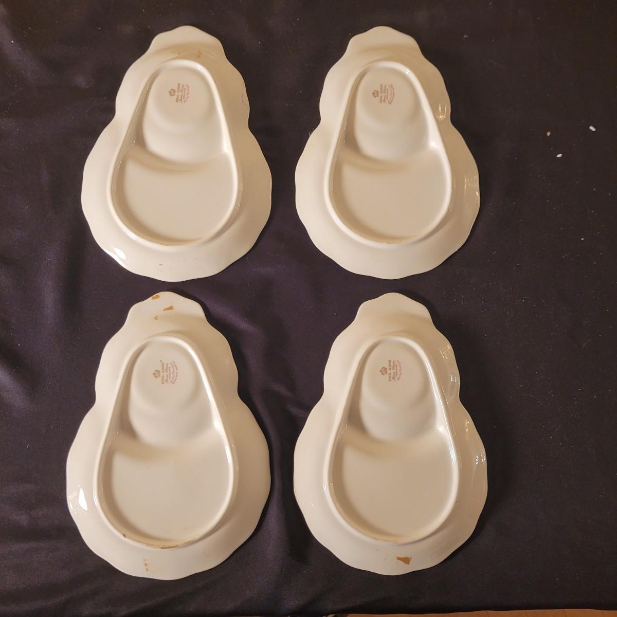 Set of four bone china tea set with plates with built-in saucers, tea cups and stands. Excellent condition, needs to be cleaned to remove grime. Plates measure approximately 9"L x6"W. Shipping available.