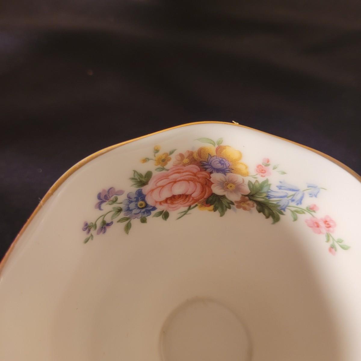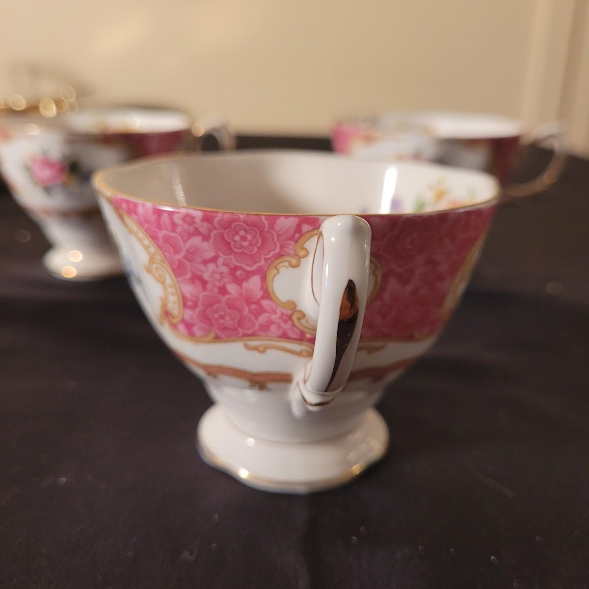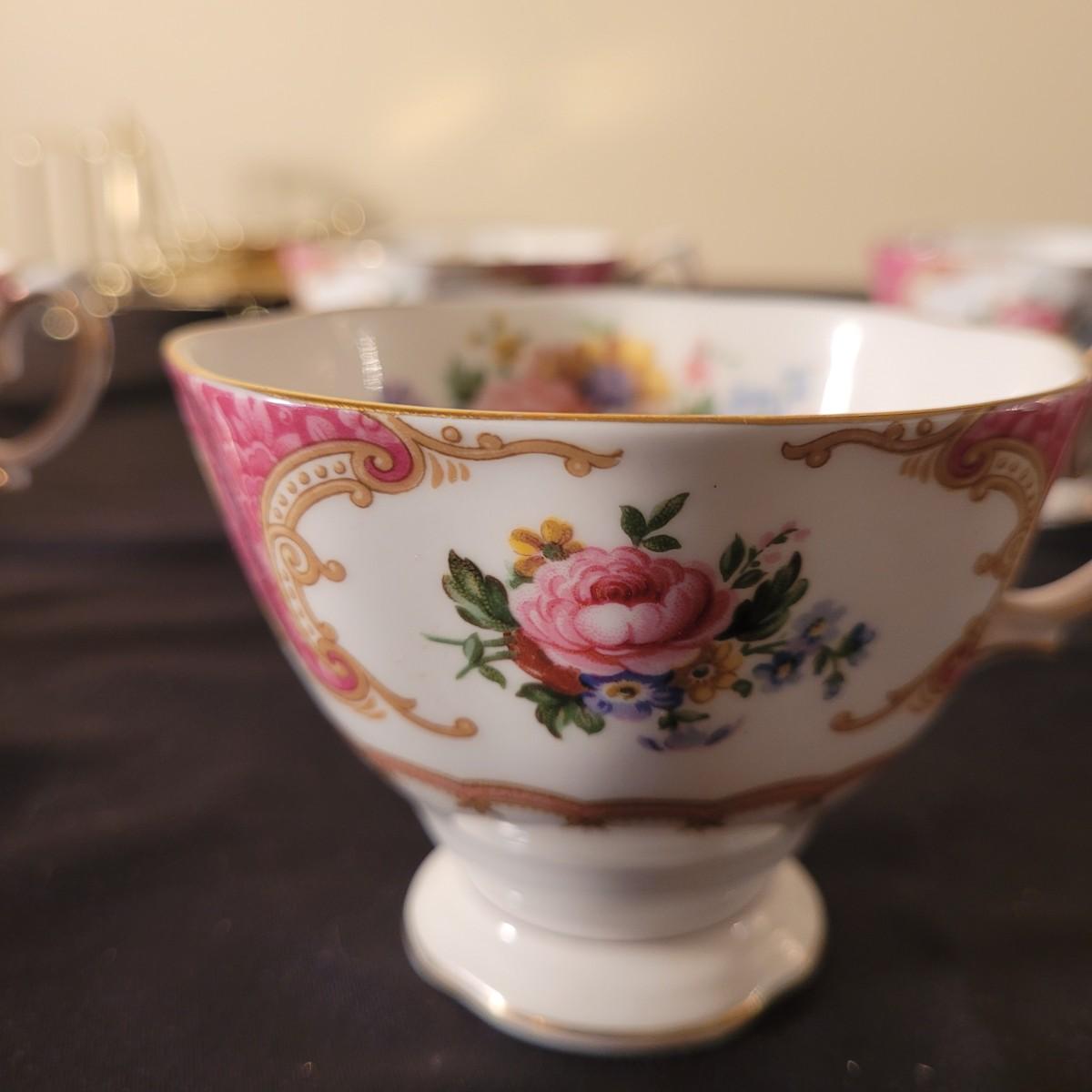 Set of four bone china tea set with plates with built-in saucers, tea cups and stands. Excellent condition, needs to be cleaned to remove grime. Plates measure approximately 9"L x6"W. Shipping available.
