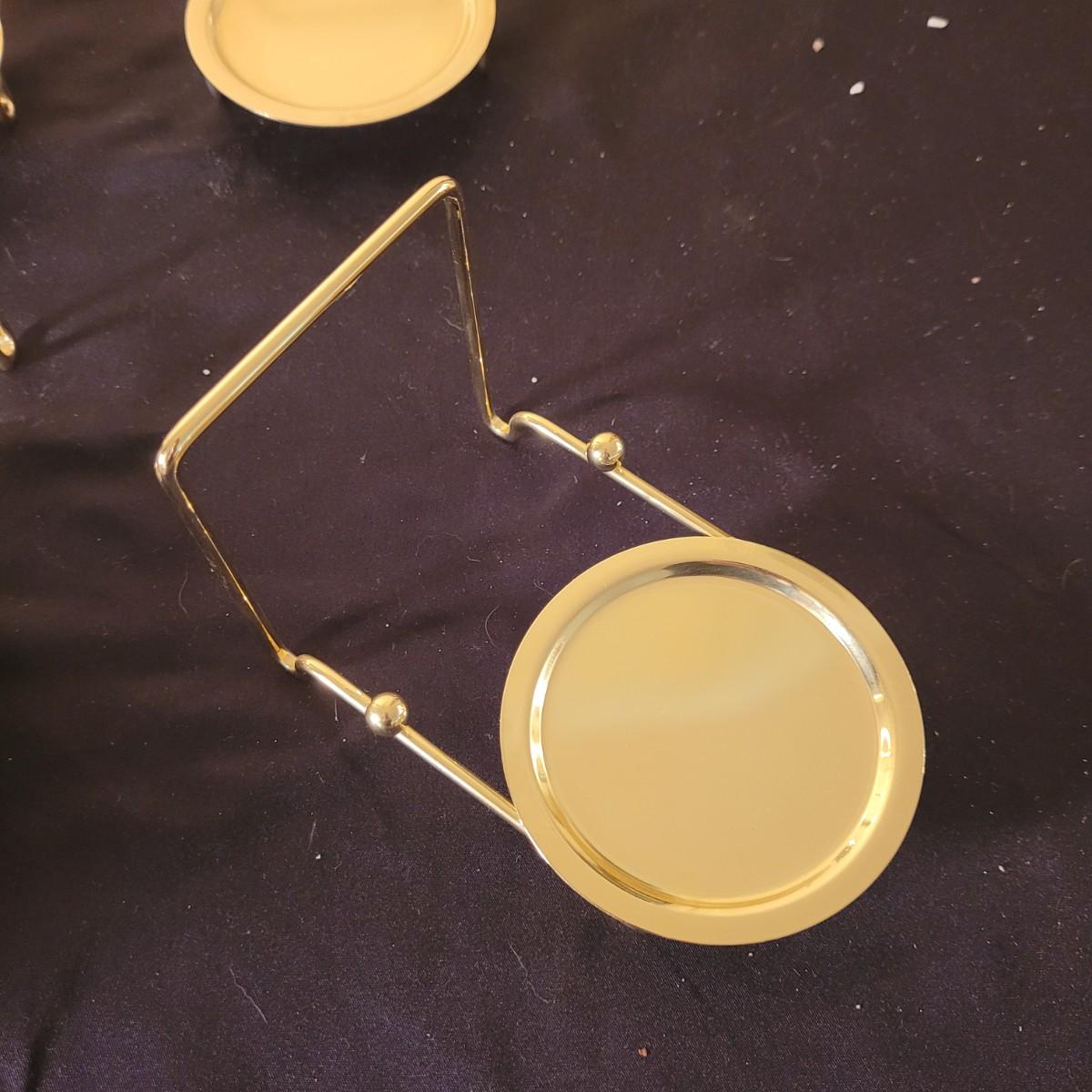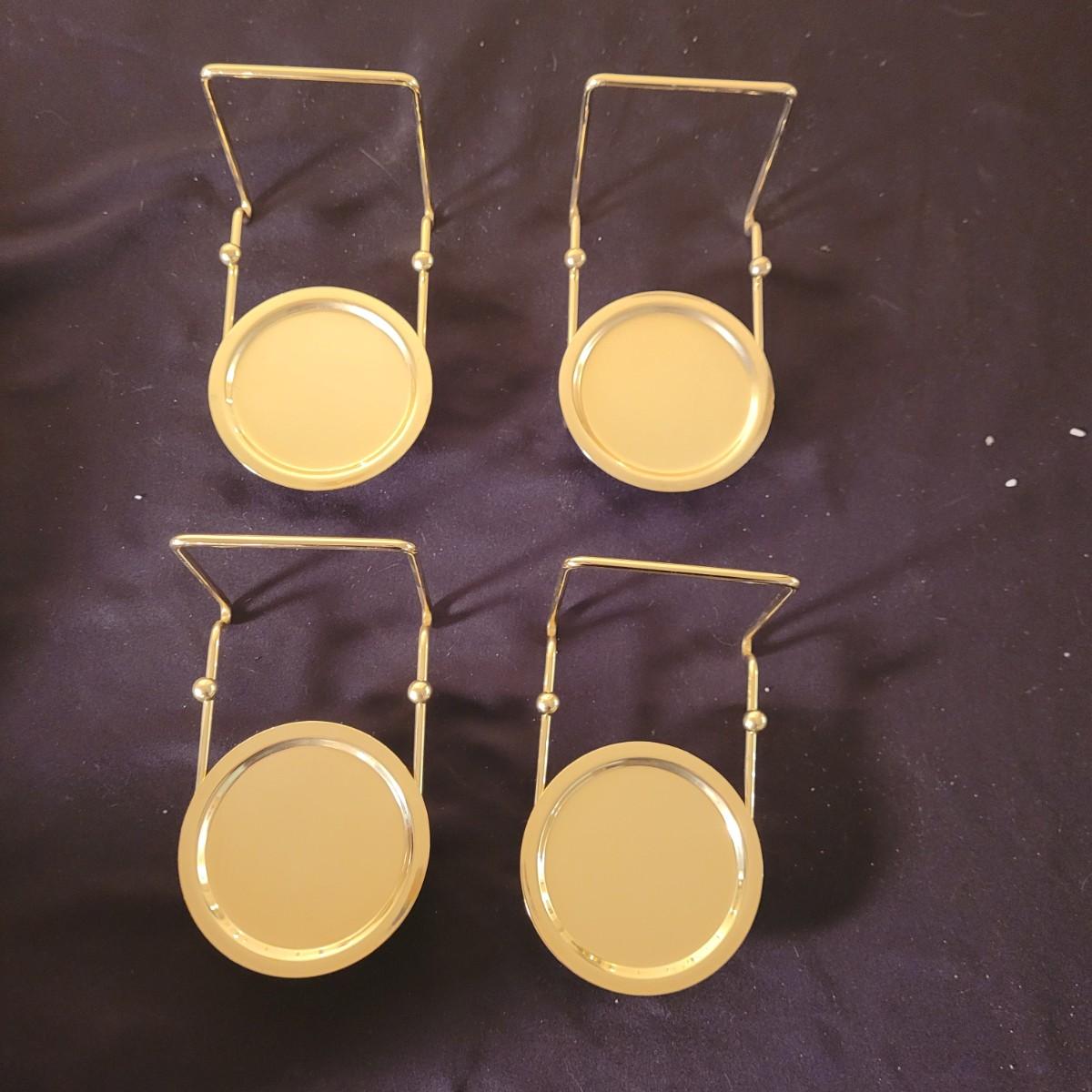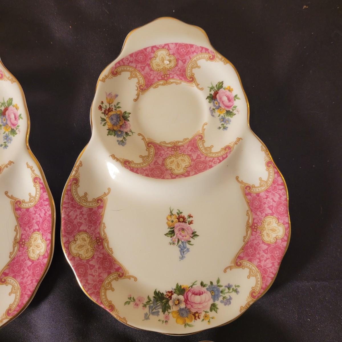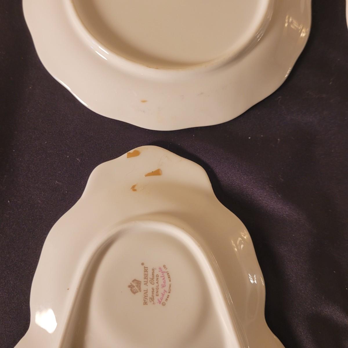 Set of four bone china tea set with plates with built-in saucers, tea cups and stands. Excellent condition, needs to be cleaned to remove grime. Plates measure approximately 9"L x6"W. Shipping available.
