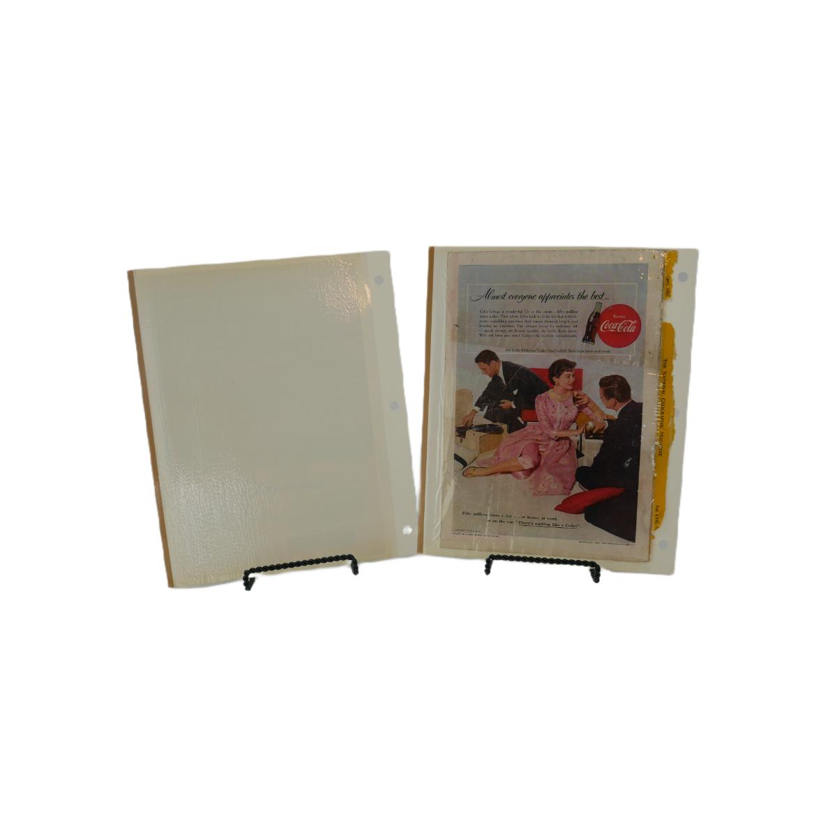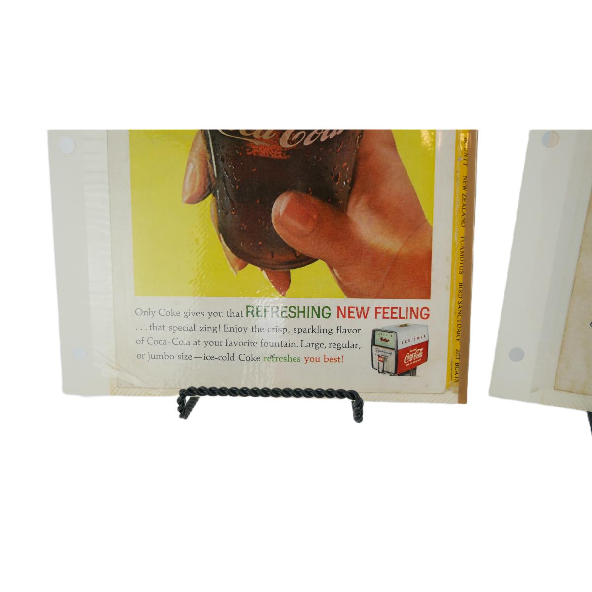 Three vintage Coca-Cola advertisements. One dated April 1962, one dated October 1960, and one dated April 1955. Taken from The National Geogrpahic Magazine and kept in these loose scrapbook sheets. Varying condition, overall good shape for their age. Each magazine advertisement measures approximately L 7" x H 10". Lot weighs 4 oz. (C85)