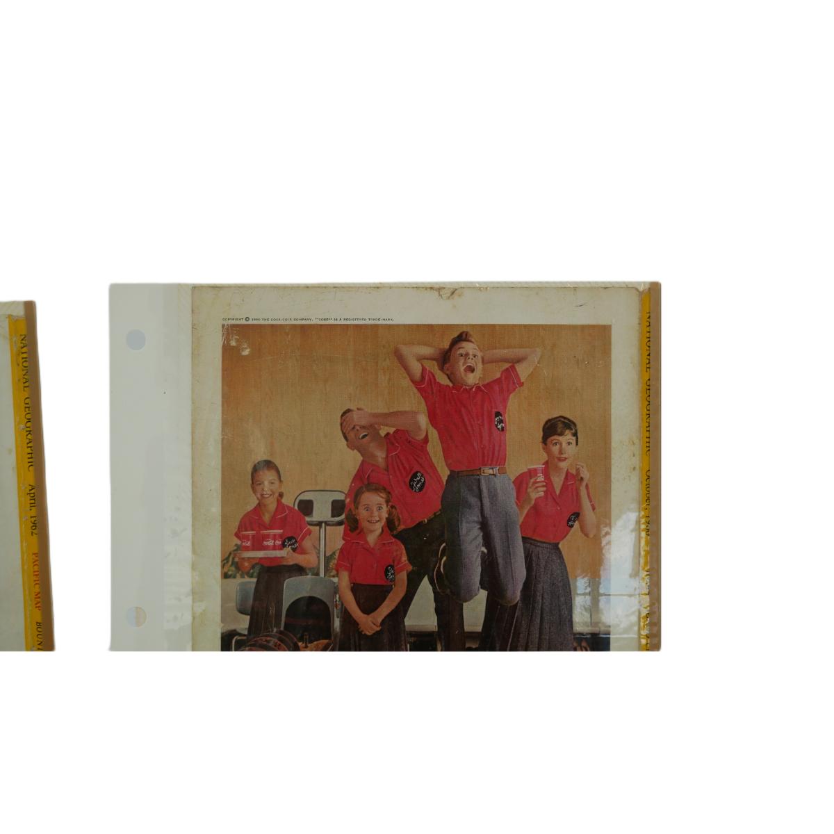 Three vintage Coca-Cola advertisements. One dated April 1962, one dated October 1960, and one dated April 1955. Taken from The National Geogrpahic Magazine and kept in these loose scrapbook sheets. Varying condition, overall good shape for their age. Each magazine advertisement measures approximately L 7" x H 10". Lot weighs 4 oz. (C85)