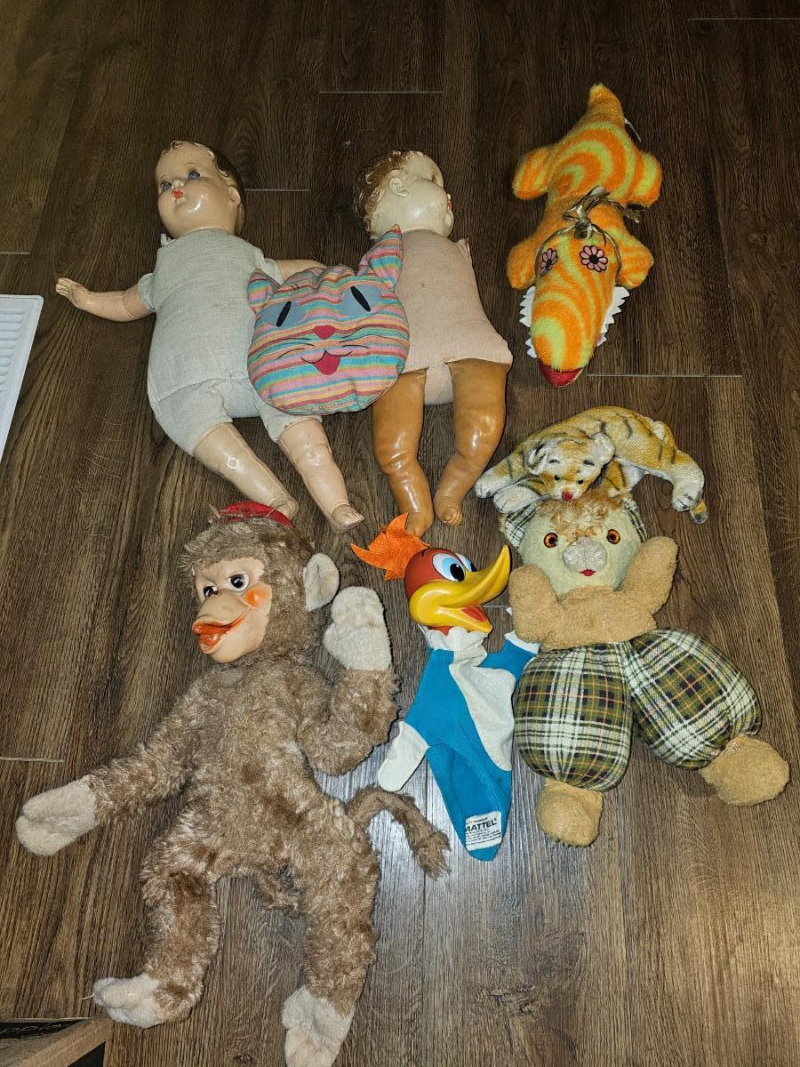 Vintage plush rubber face Happy Monkey by Master Industries, Woody Wood Pecker Mattel, Mohair 1950s cat plush... if you know your vintage and antique plush toys then you know the value of these. Rare pieces of toy history!