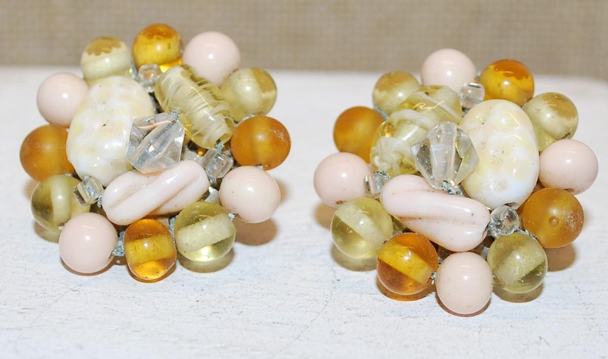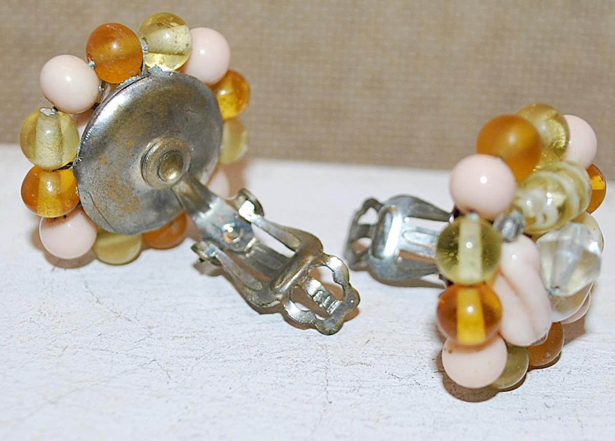 VINTAGE 1950's Assorted Pinks, Greens & Gold Beaded Earrings (1" Circ.) with HINGED Snap Clasp