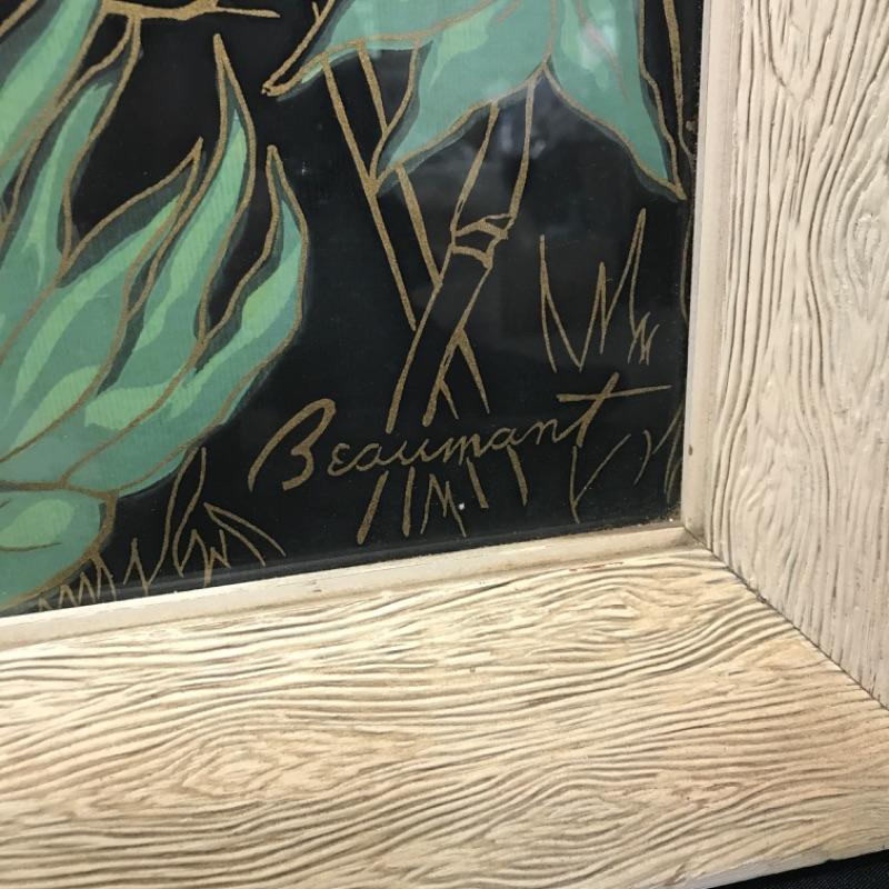 A great 1950's example of Asian Modern. This piece is guoache on paper, And is signed, “Beaumont“ In the bottom right hand corner. In excellent condition. Including the frame this measures 28 1/2“ x 34“. Excellent addition for your Mid Century Modern, or Googie setting.