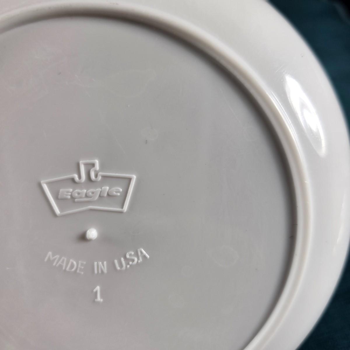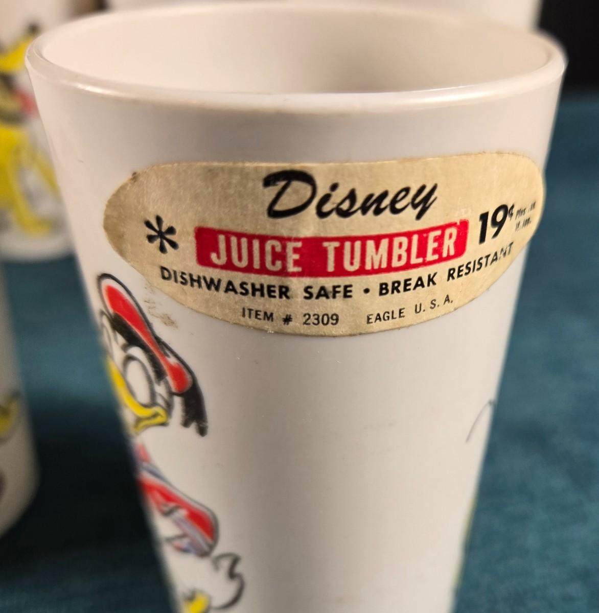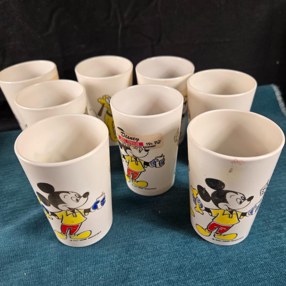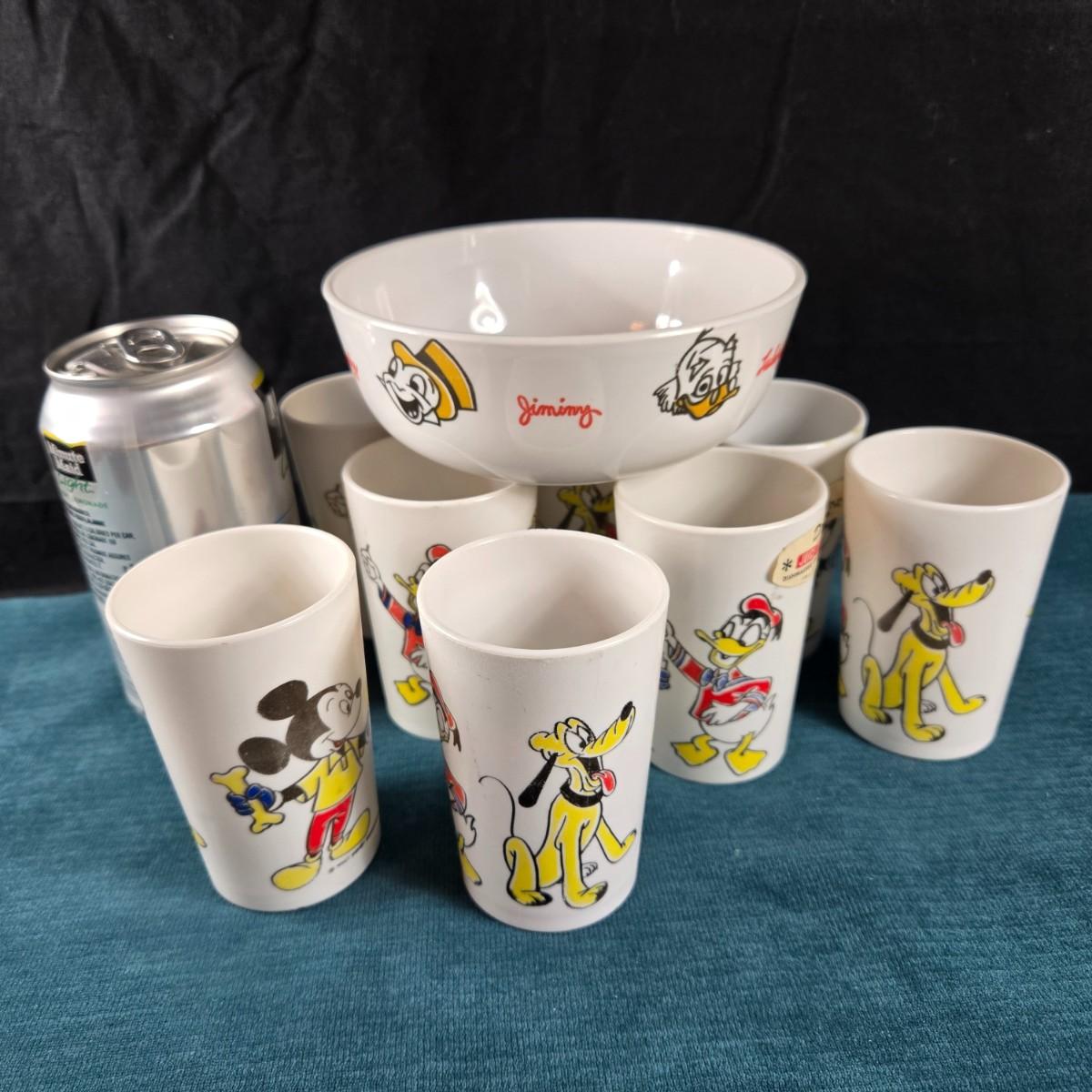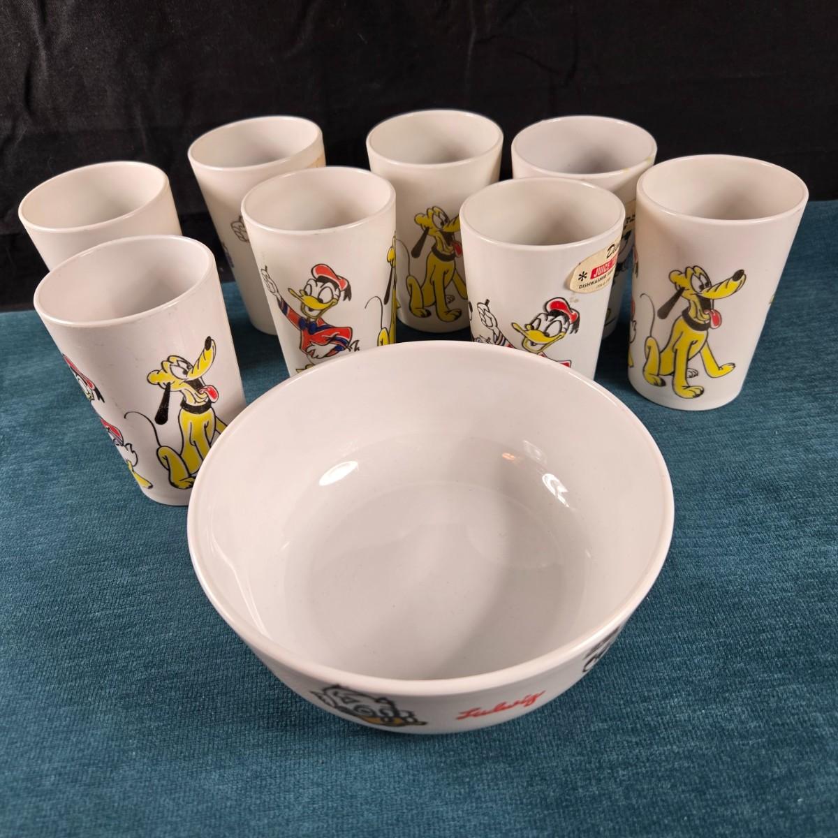 This auction lot is for a Vintage 1950's Cereal Bowl and 8 Juice Glasses. The bowl appears unused and is about 5.5-inches in diameter x 2-inches deep. The cups may have light use but are also in very good condition, most still have their original price tag on them. They are about 3.5-inches tall and 2.25-inches diameter.