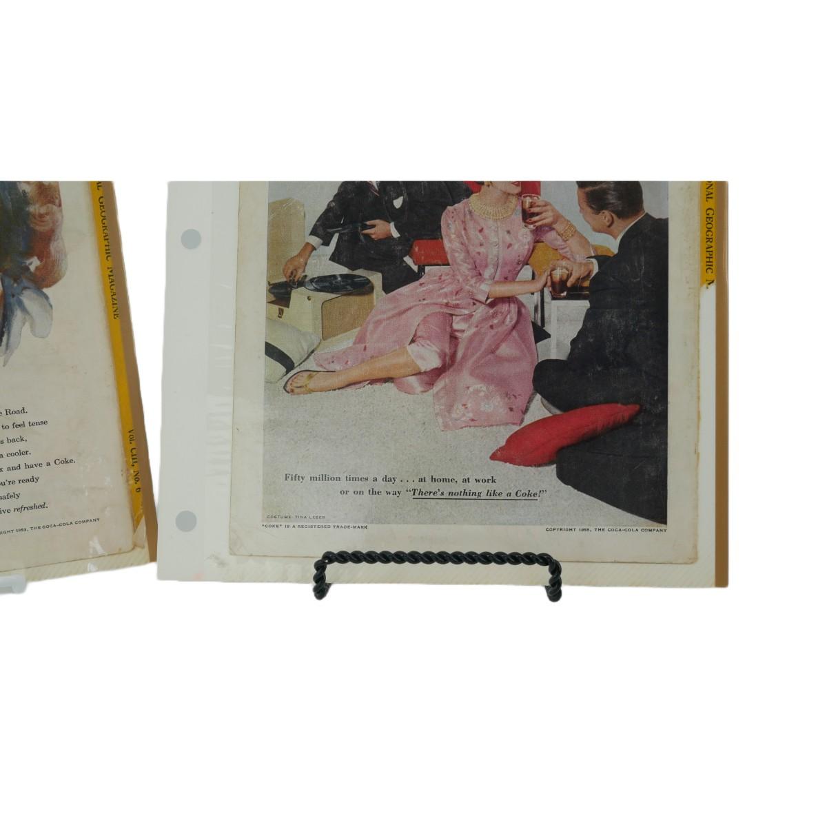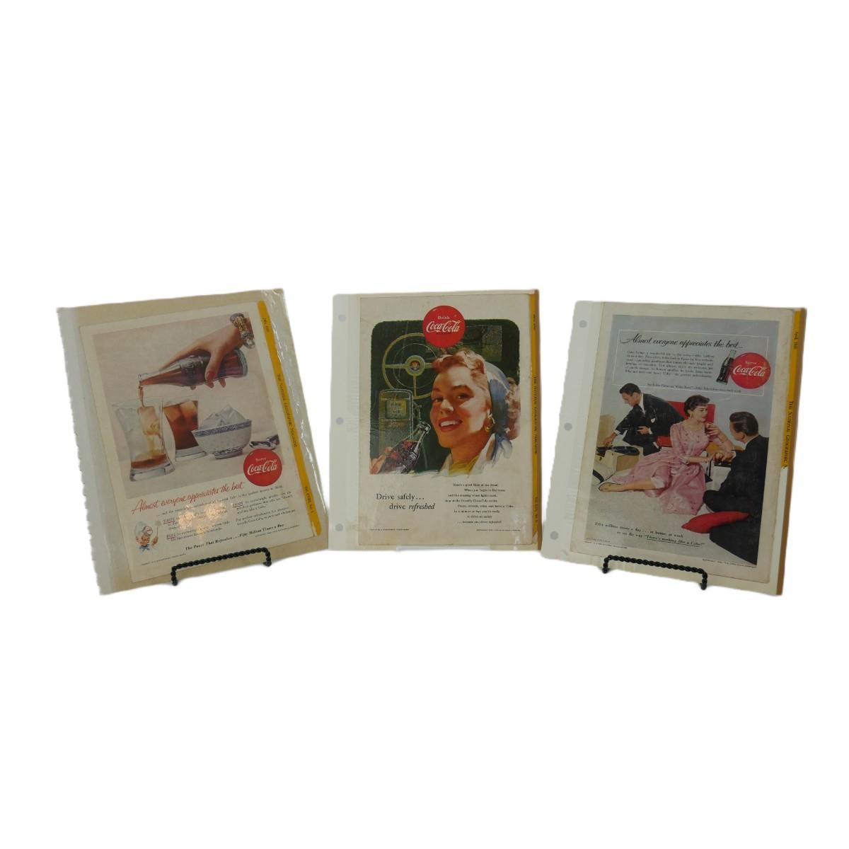 Three vintage Coca-Cola advertisements. One dated July 1955, one dated June 1953, and one dated April 1955. All were taken from The National Geogrpahic Magazine and kept in these loose scrapbook sheets. Varying condition, overall good shape for their age. Each magazine advertisement measures approximately L 7" x H 10". Lot weighs 4 oz. (C82)