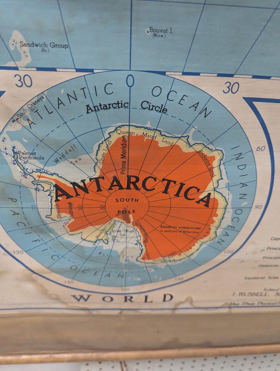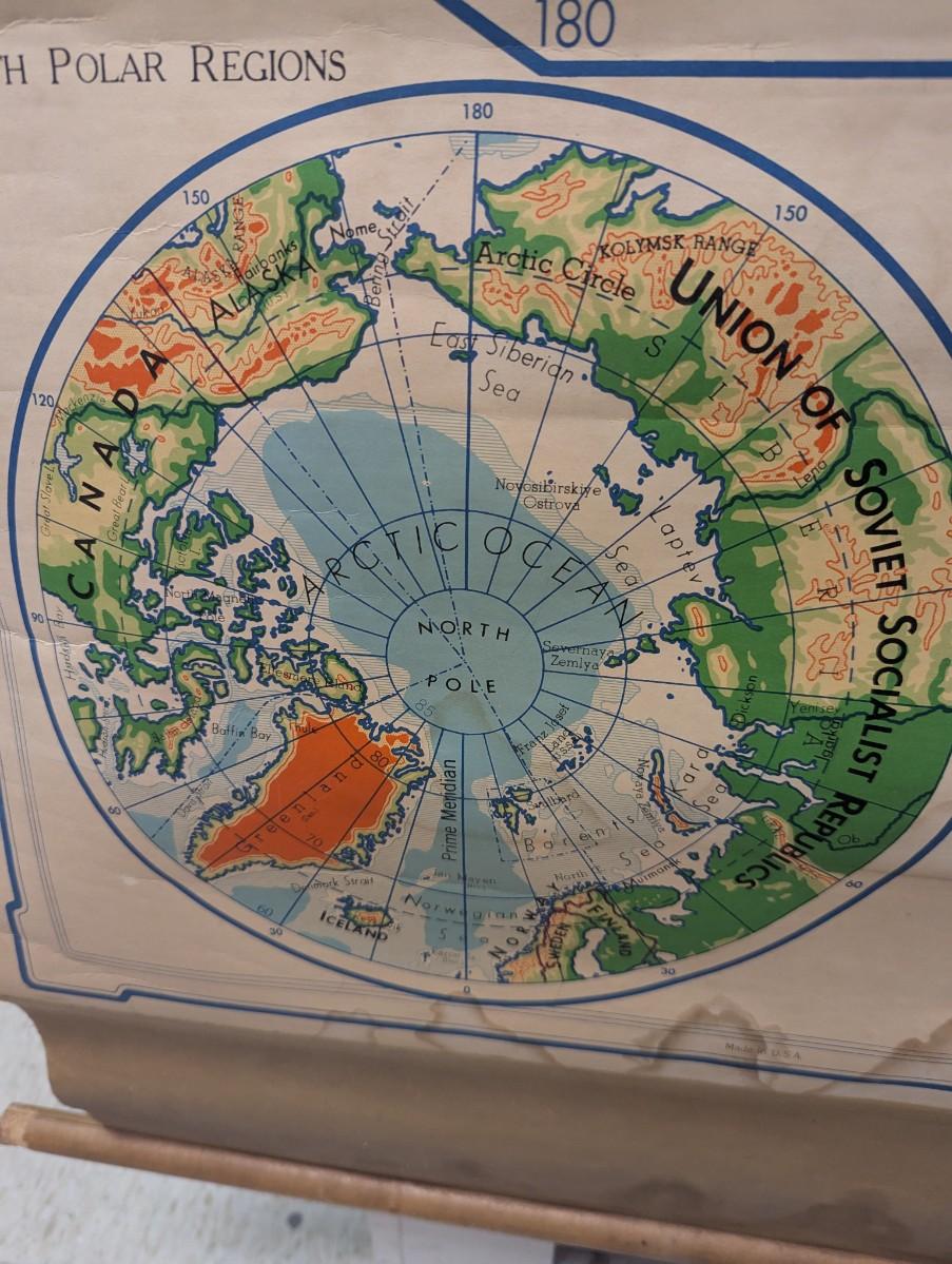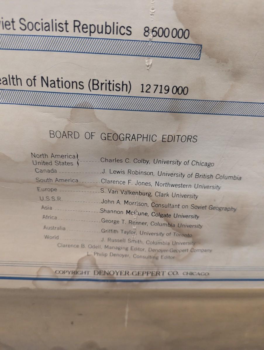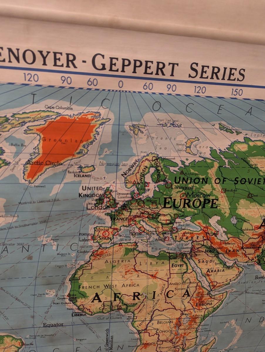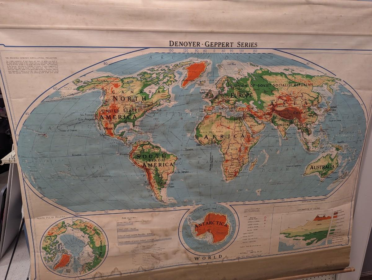 Vintage 1950's Denoyer-Geppert Pull-Down World Map by J Russell Smith