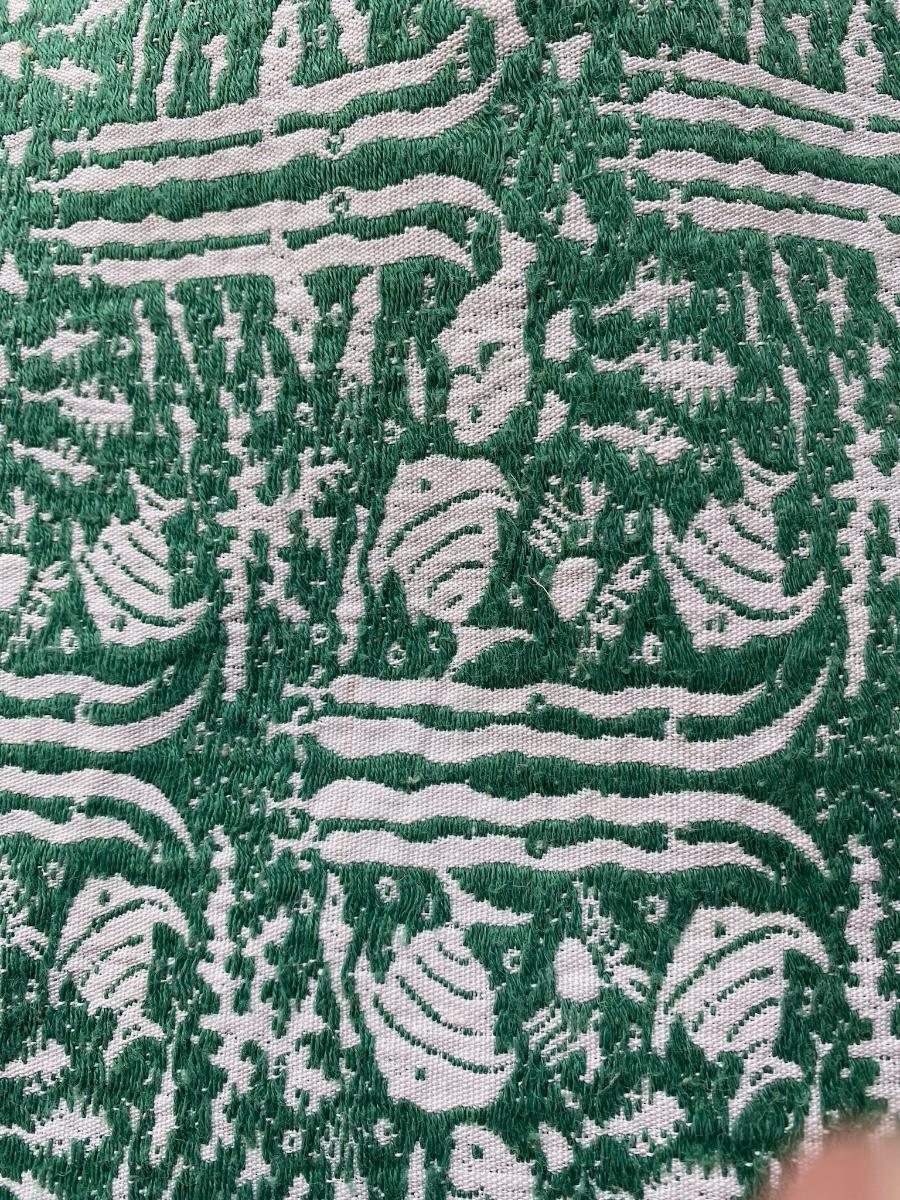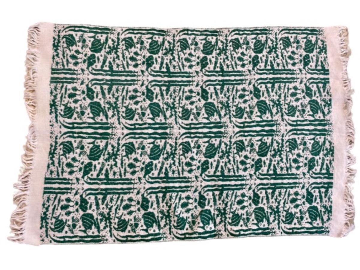 Six fabulous unused 1950s /60s era vintage damask smashing woven vivid jadite green fish design placemats. New used old stock condition. 18" X 12"