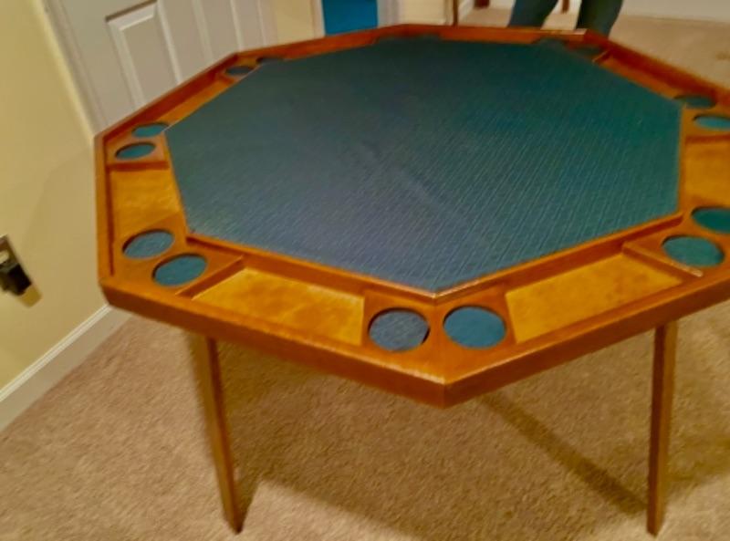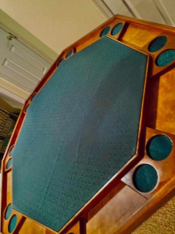 Great old mid century poker table used for decades by clients’ father - in a nice burled oak , with sleek legs that fold in to transport or store,. 48” across, accommodates 8 players with drink and chip holders . Covered in patterned green fabric, could be readily flipped.