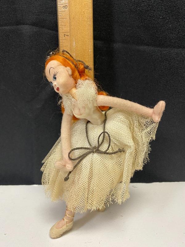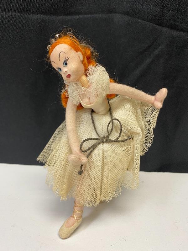 Vintage 1950s Klumpe red haired ballerina doll. Felt body with molded cloth face. Painted facial expression. Wired limbs so she can be bent into shape. Stands on her own but could benefit with a stand. Under 7" tall. In good condition, displays nicely.