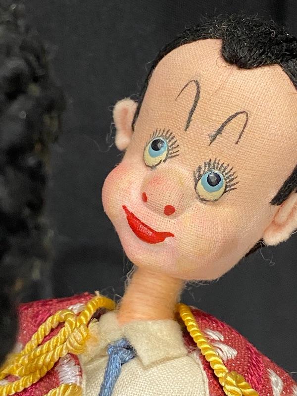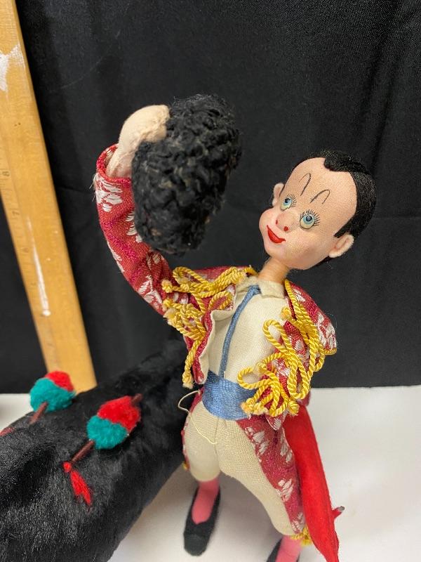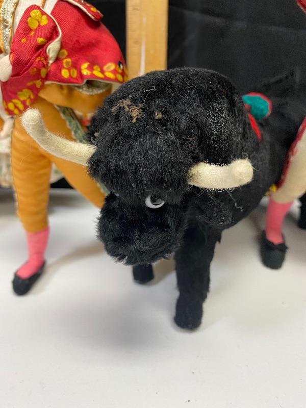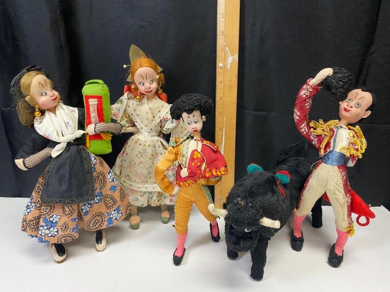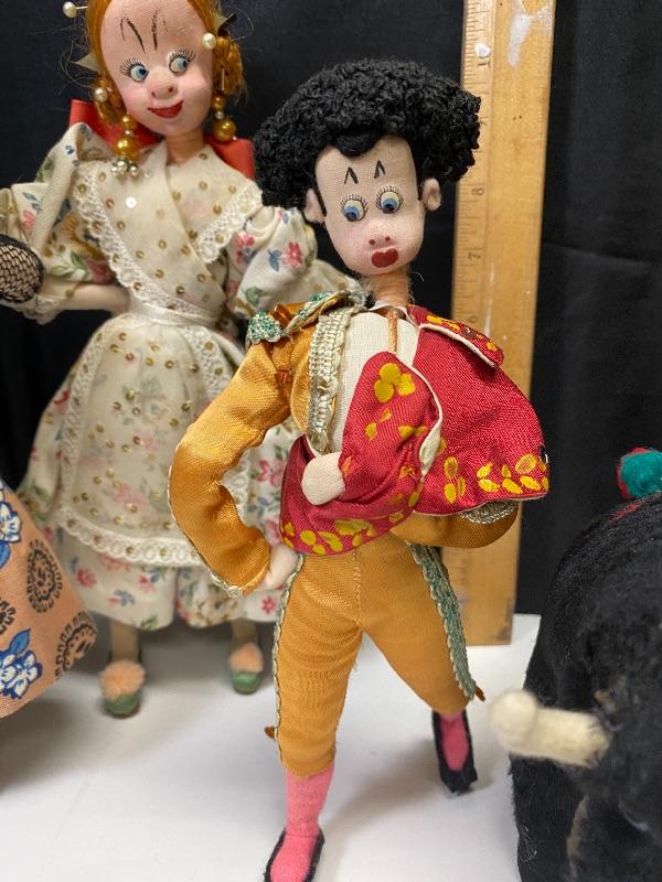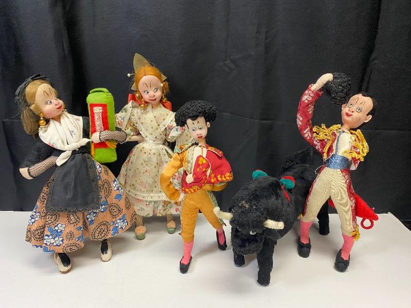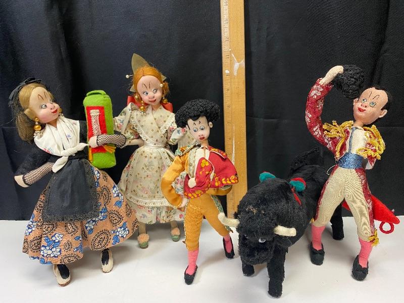 Vintage 1950s Klumpe Roldan dolls. 5 dolls total. 2 matadors, the bull, and two ladies watching. Cloth/felt bodies with wire inside. Faces are cloth but have been hardened. Painted facial expressions. Under 11" size. In very good condition. One still has an original Klumpe tag attached. Display nicely, stand on their own but would be better if they had a stand for support.
