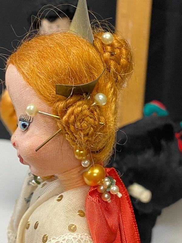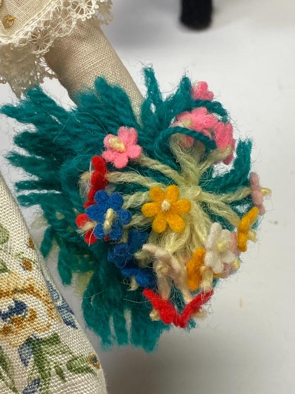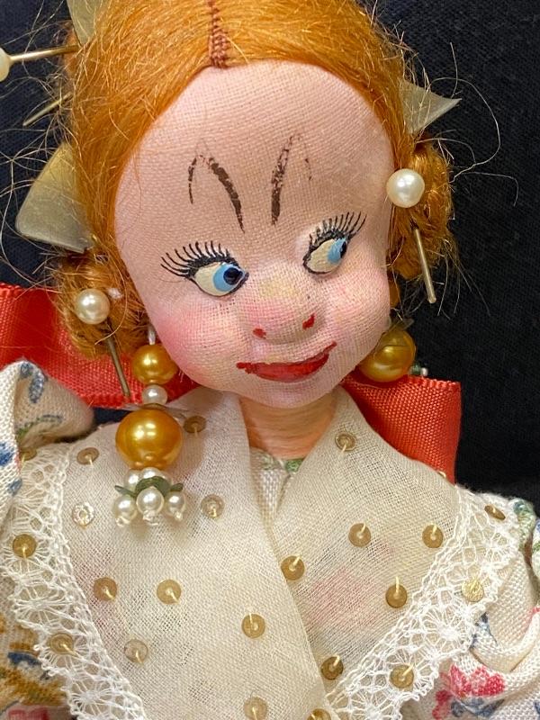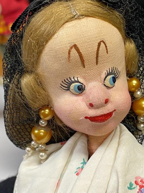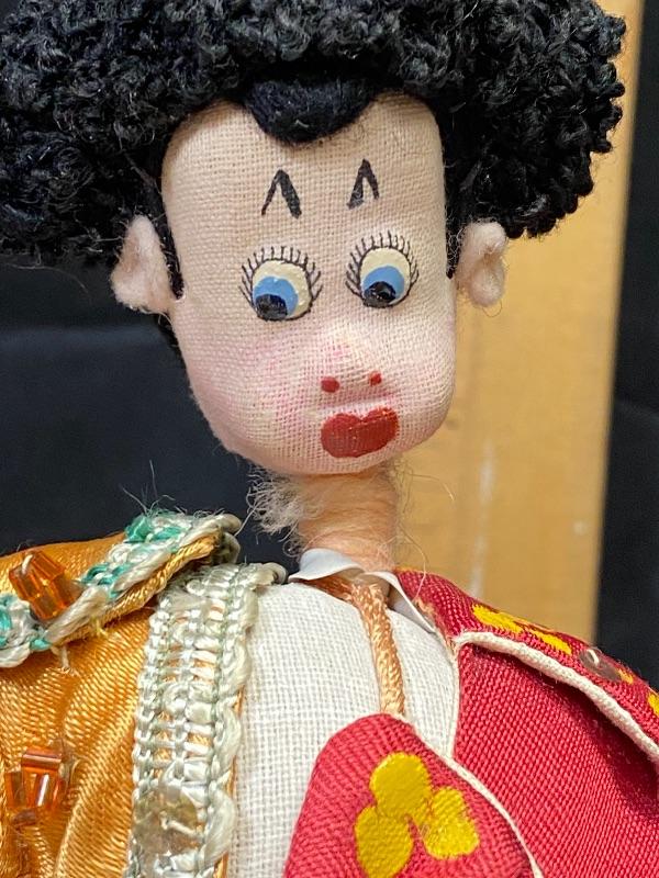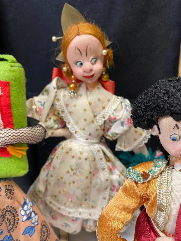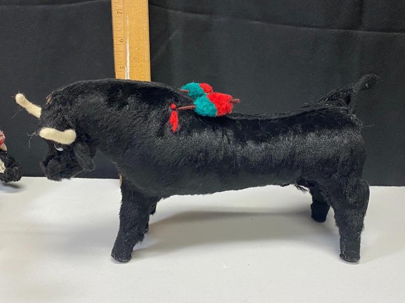 Vintage 1950s Klumpe Roldan dolls. 5 dolls total. 2 matadors, the bull, and two ladies watching. Cloth/felt bodies with wire inside. Faces are cloth but have been hardened. Painted facial expressions. Under 11" size. In very good condition. One still has an original Klumpe tag attached. Display nicely, stand on their own but would be better if they had a stand for support.