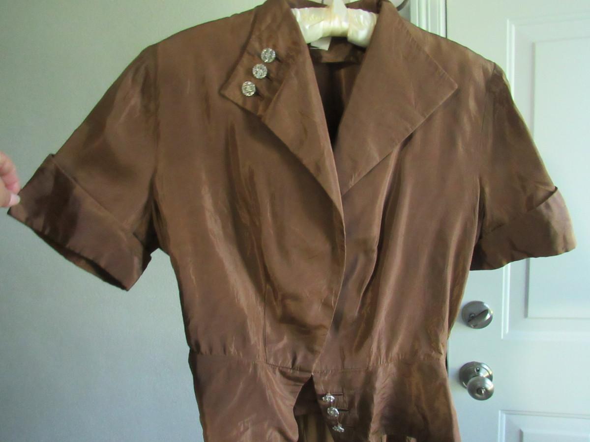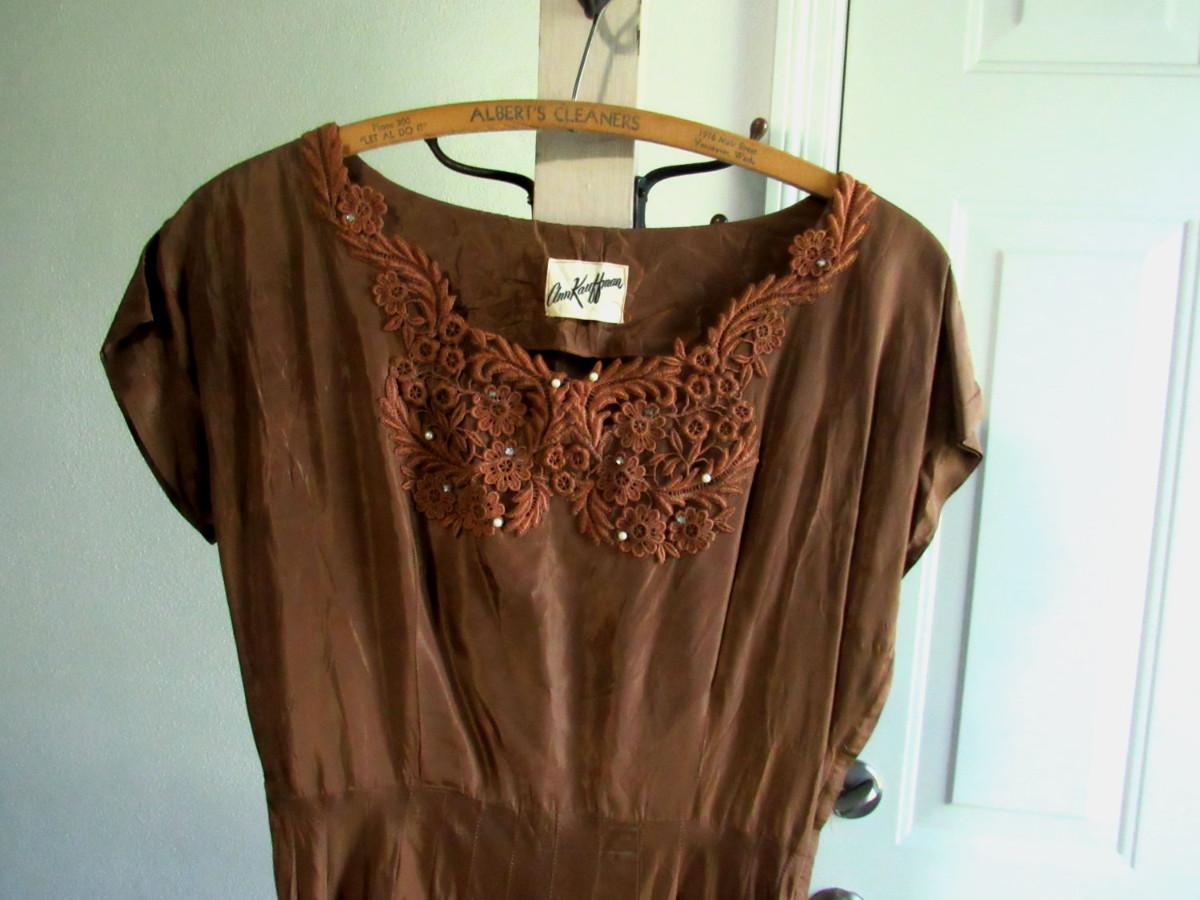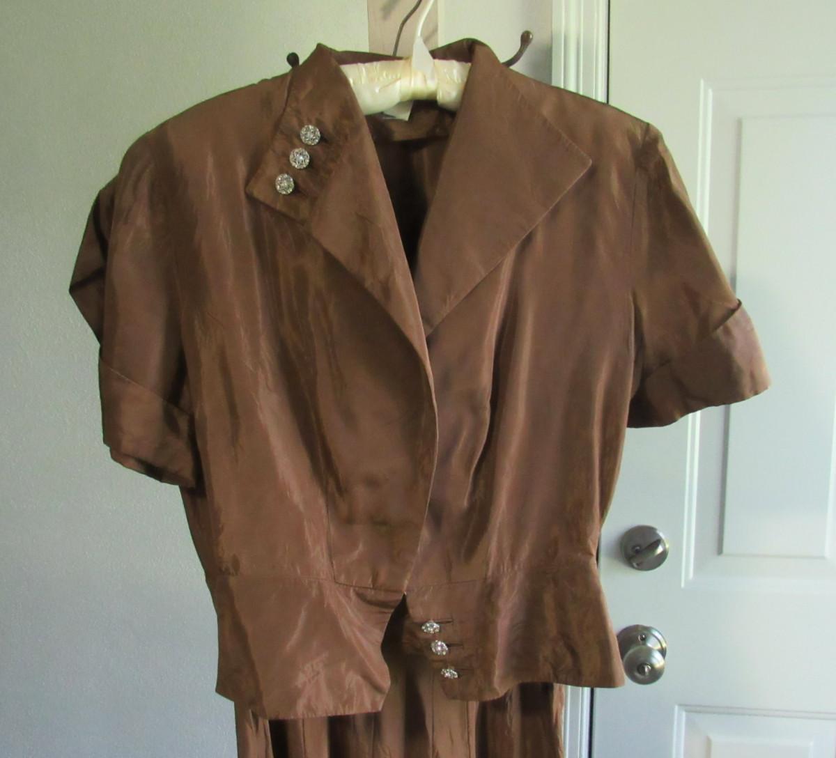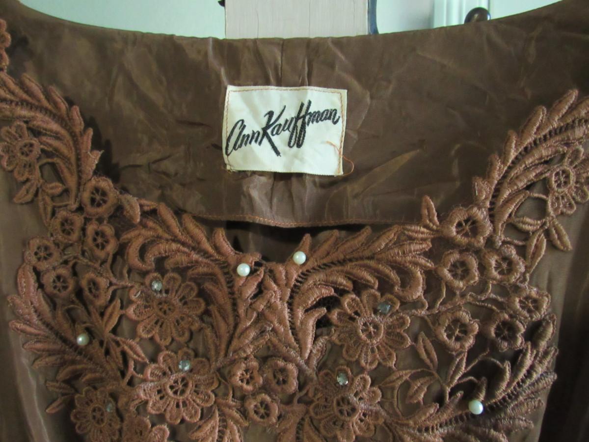 Set is in very good shape. My pics do not do this set justice. Color is off in photos. It is a nice medium brown shade. The lace in photos is too bright, it is darker brown in person. Rhinestones and faux pearls trim. Detailed stitching on front of dress, nice pleated skirt. Beautiful, needs pressing. Matching short jacket has rhinestone buttons, upturned cuffs at sleeves, shoulder pads. Beautiful condition but needs ironing. Not sure what kind of fabric this is. Ann Kauffmen label inside. Check out the online prices on these outfits! Shipping is available at actual shipping cost plus $5.00 handling fee per box for supplies/labor. See our terms for details. All sales are final. Condition notes may not be all inclusive, we may miss some issues as most vintage items are not in mint condition and have some degree of wear, paint loss, etc, but we always try to note obvious damage.