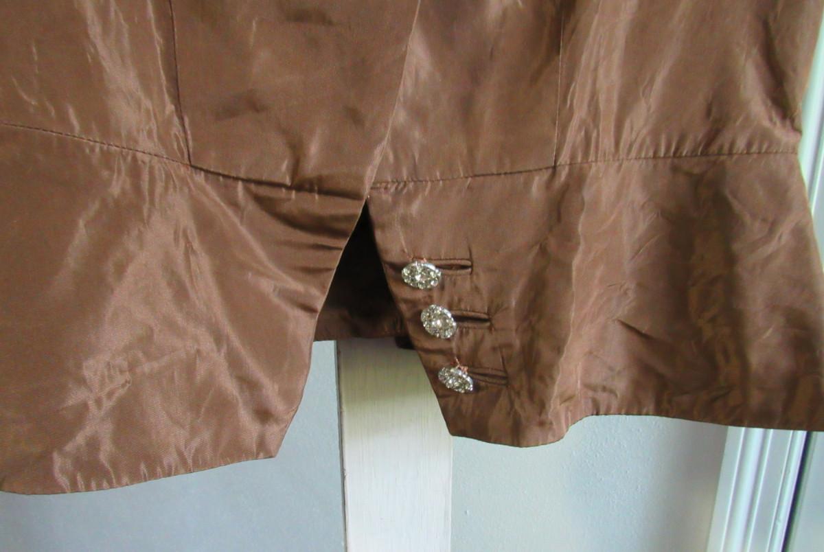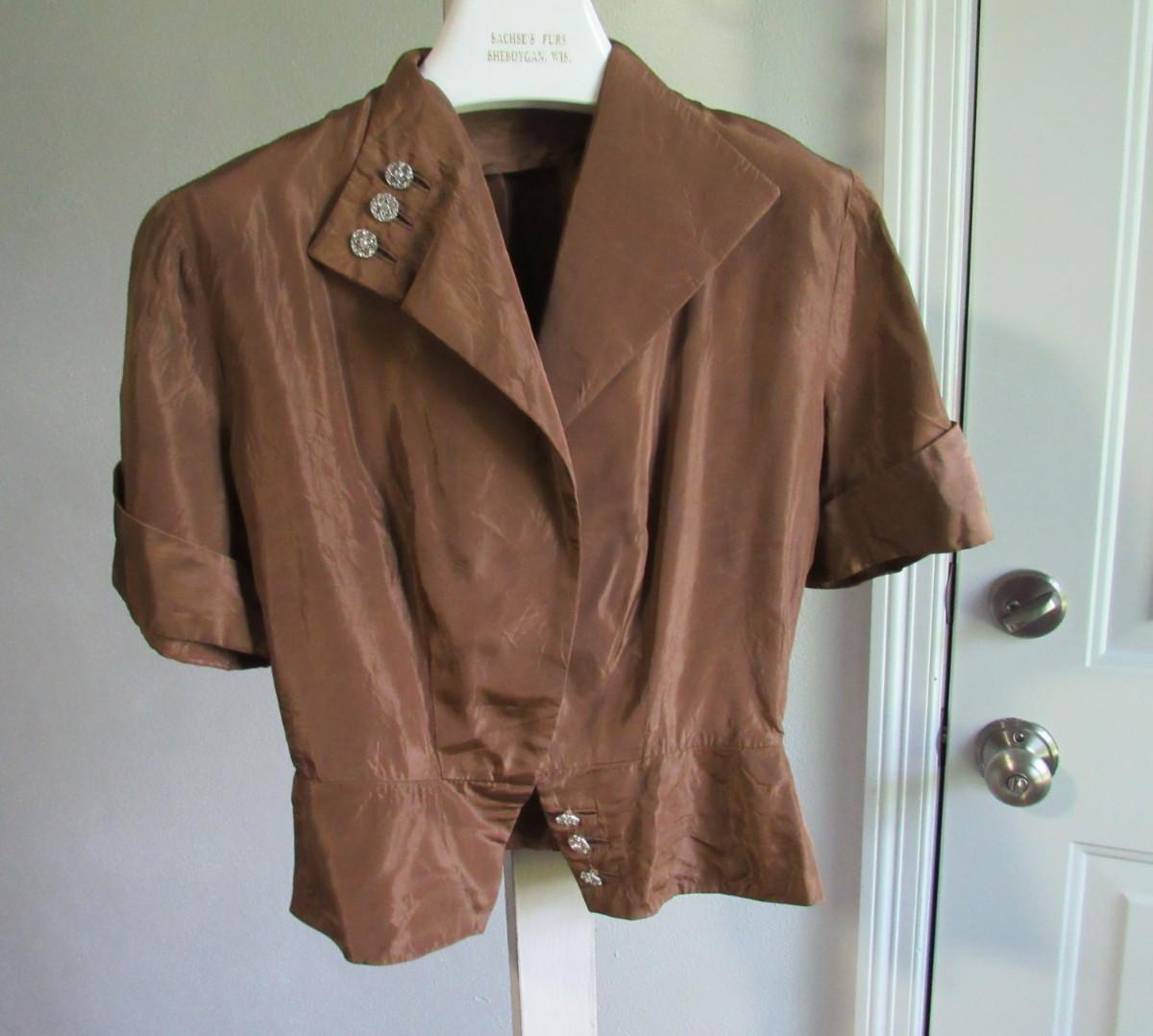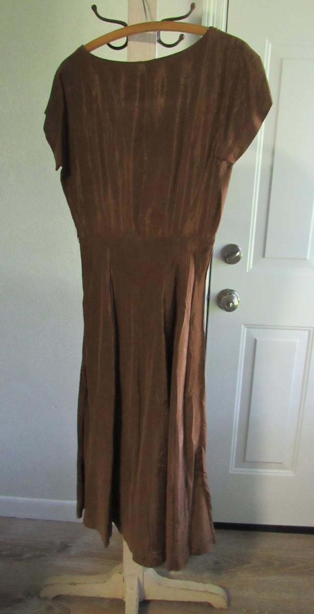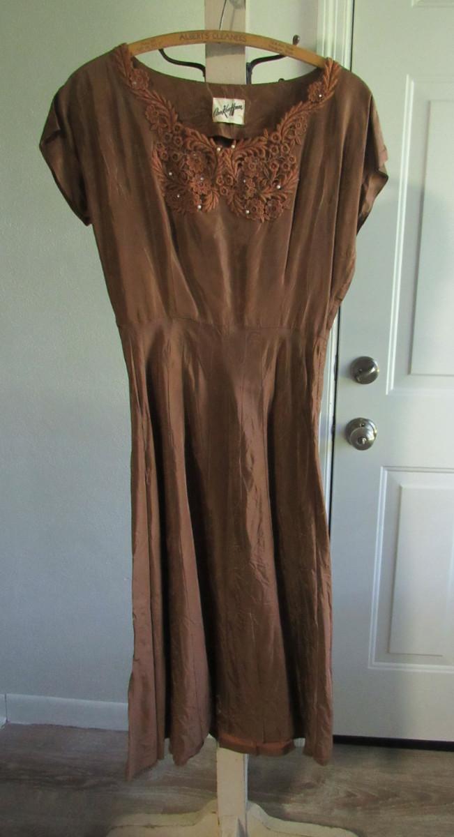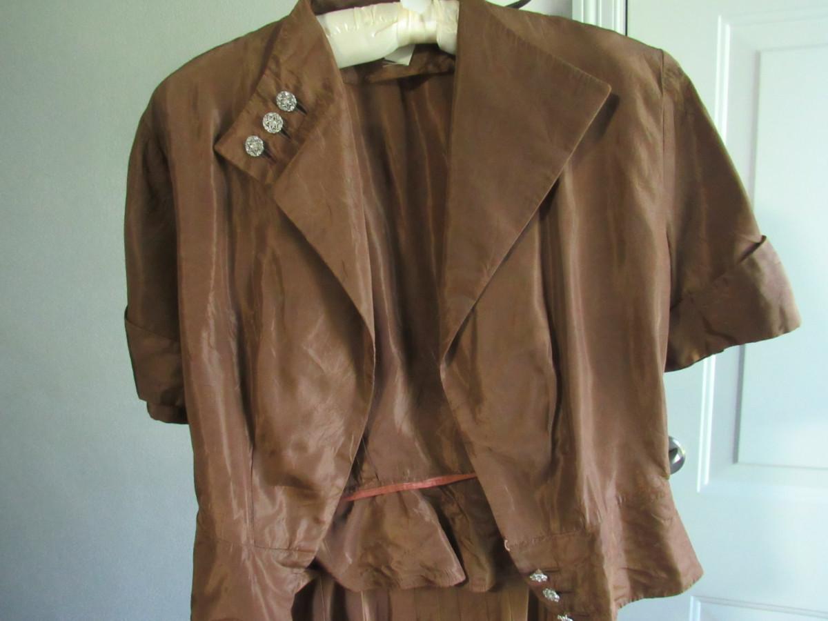 Set is in very good shape. My pics do not do this set justice. Color is off in photos. It is a nice medium brown shade. The lace in photos is too bright, it is darker brown in person. Rhinestones and faux pearls trim. Detailed stitching on front of dress, nice pleated skirt. Beautiful, needs pressing. Matching short jacket has rhinestone buttons, upturned cuffs at sleeves, shoulder pads. Beautiful condition but needs ironing. Not sure what kind of fabric this is. Ann Kauffmen label inside. Check out the online prices on these outfits! Shipping is available at actual shipping cost plus $5.00 handling fee per box for supplies/labor. See our terms for details. All sales are final. Condition notes may not be all inclusive, we may miss some issues as most vintage items are not in mint condition and have some degree of wear, paint loss, etc, but we always try to note obvious damage.