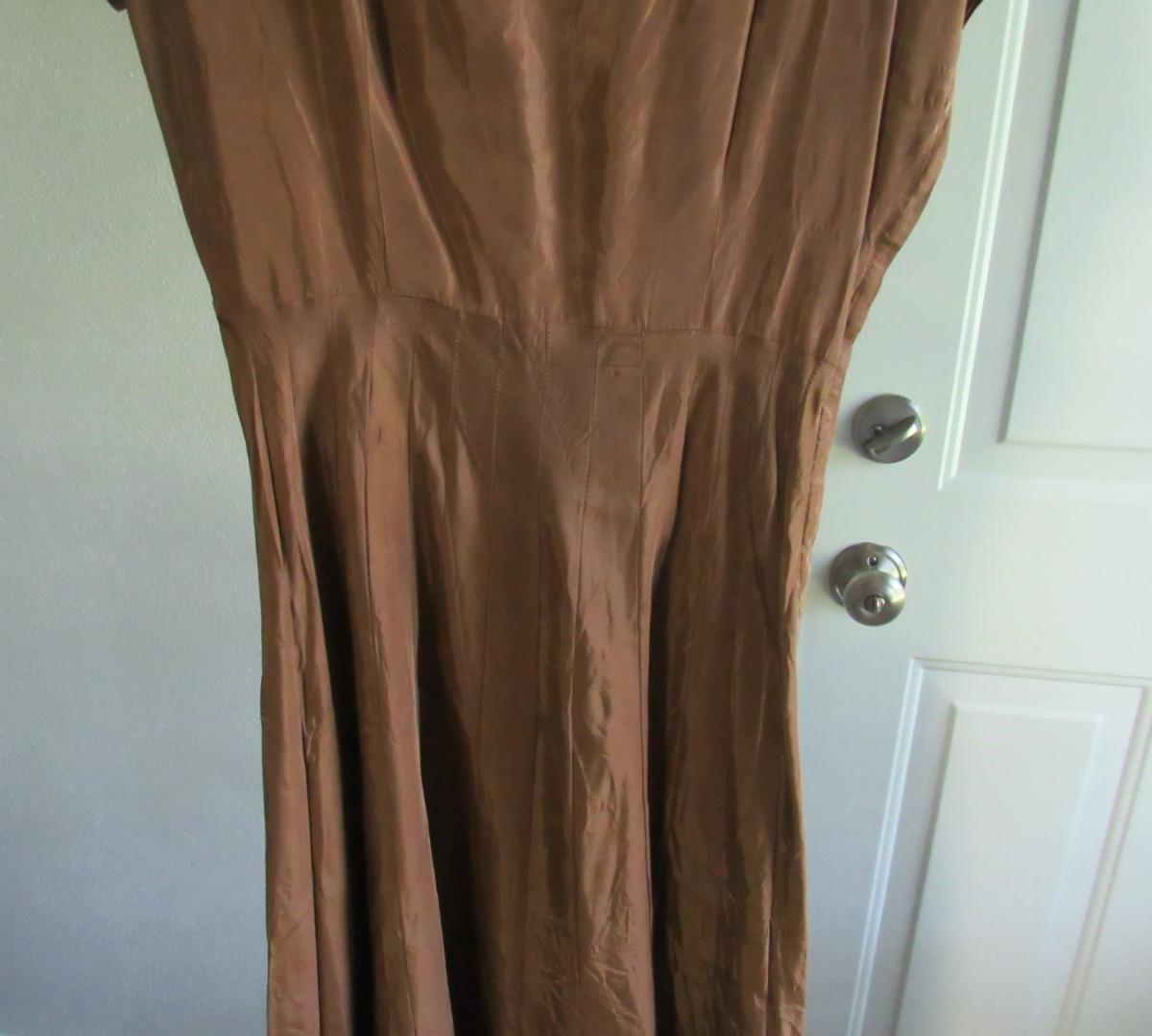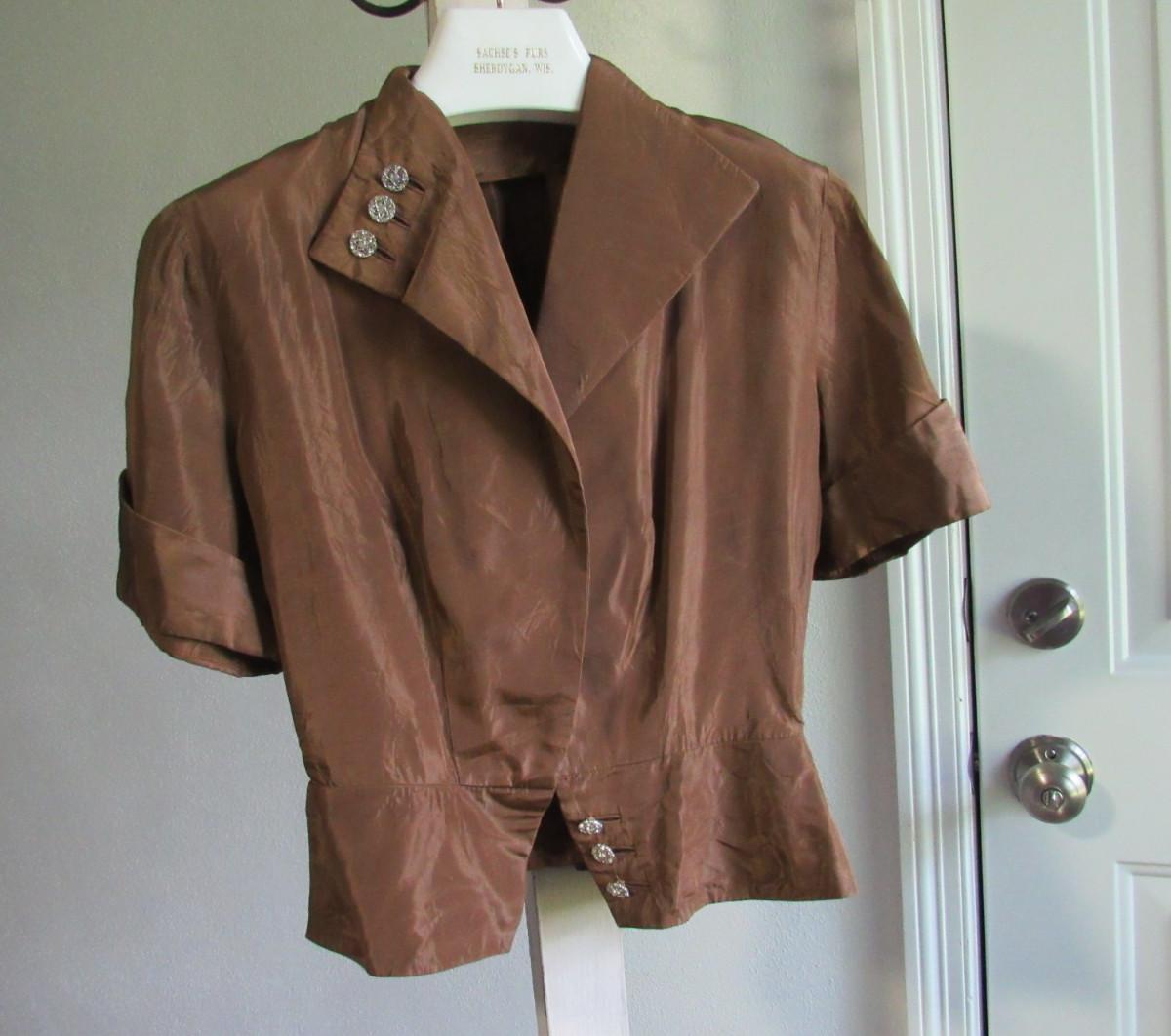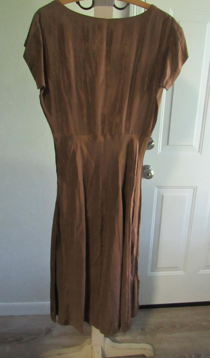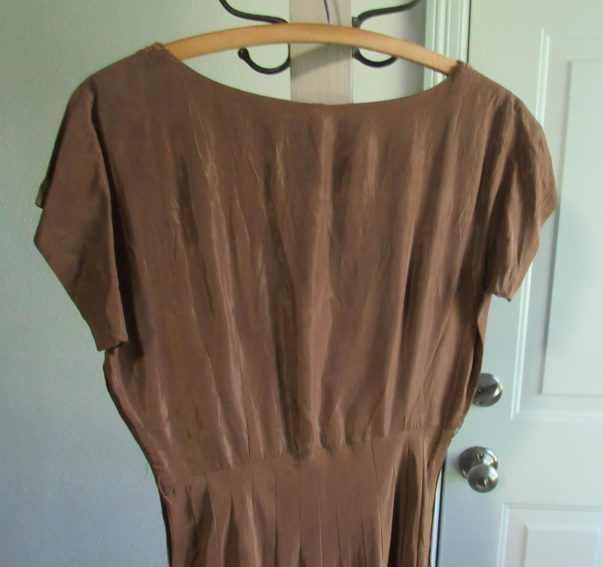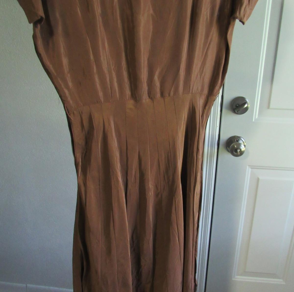 Set is in very good shape. My pics do not do this set justice. Color is off in photos. It is a nice medium brown shade. The lace in photos is too bright, it is darker brown in person. Rhinestones and faux pearls trim. Detailed stitching on front of dress, nice pleated skirt. Beautiful, needs pressing. Matching short jacket has rhinestone buttons, upturned cuffs at sleeves, shoulder pads. Beautiful condition but needs ironing. Not sure what kind of fabric this is. Ann Kauffmen label inside. Check out the online prices on these outfits! Shipping is available at actual shipping cost plus $5.00 handling fee per box for supplies/labor. See our terms for details. All sales are final. Condition notes may not be all inclusive, we may miss some issues as most vintage items are not in mint condition and have some degree of wear, paint loss, etc, but we always try to note obvious damage.