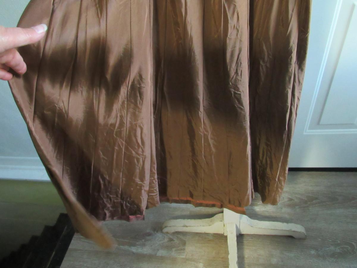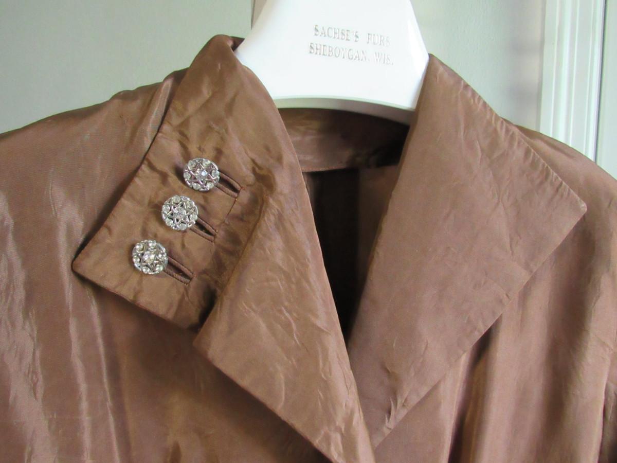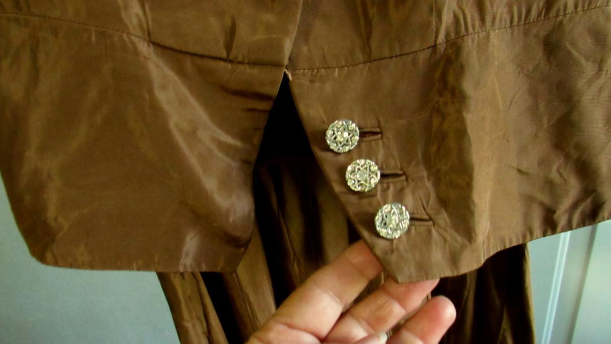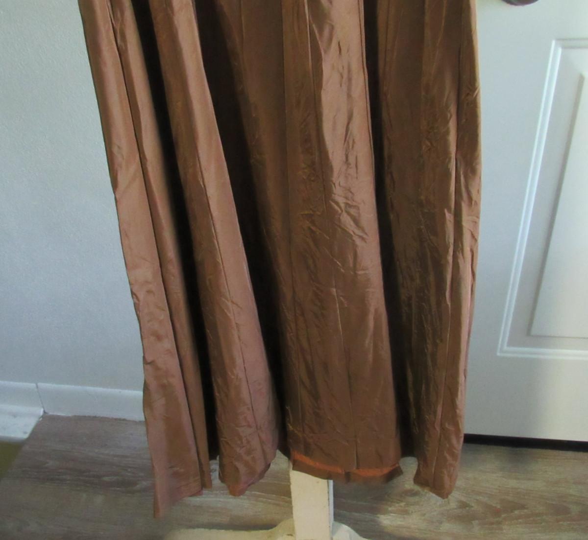 Set is in very good shape. My pics do not do this set justice. Color is off in photos. It is a nice medium brown shade. The lace in photos is too bright, it is darker brown in person. Rhinestones and faux pearls trim. Detailed stitching on front of dress, nice pleated skirt. Beautiful, needs pressing. Matching short jacket has rhinestone buttons, upturned cuffs at sleeves, shoulder pads. Beautiful condition but needs ironing. Not sure what kind of fabric this is. Ann Kauffmen label inside. Check out the online prices on these outfits! Shipping is available at actual shipping cost plus $5.00 handling fee per box for supplies/labor. See our terms for details. All sales are final. Condition notes may not be all inclusive, we may miss some issues as most vintage items are not in mint condition and have some degree of wear, paint loss, etc, but we always try to note obvious damage.