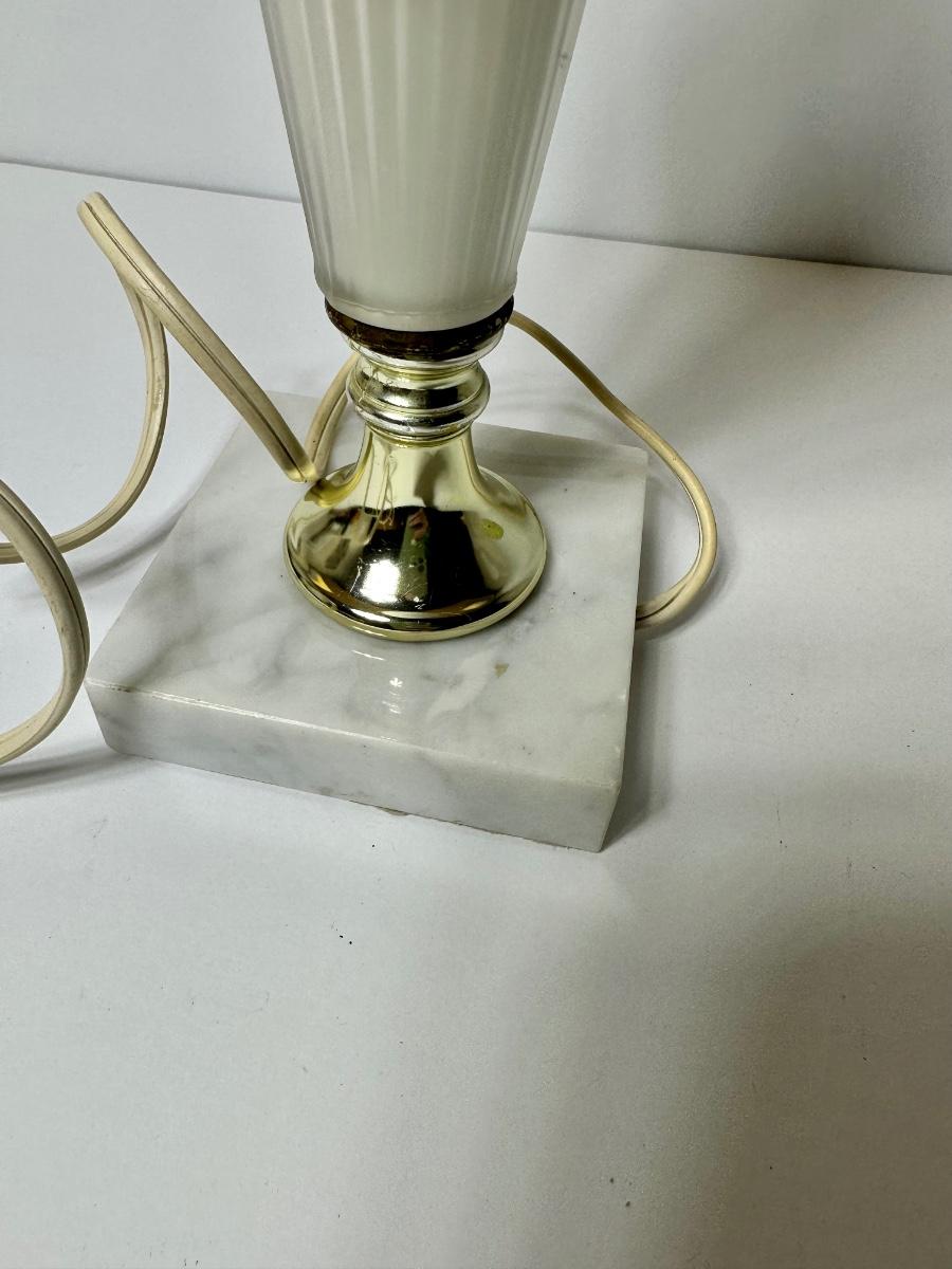 Beautiful satin, opaque ivory milk glass lamp with marble base. Lamp is in working condition, twist button operation with original cord.