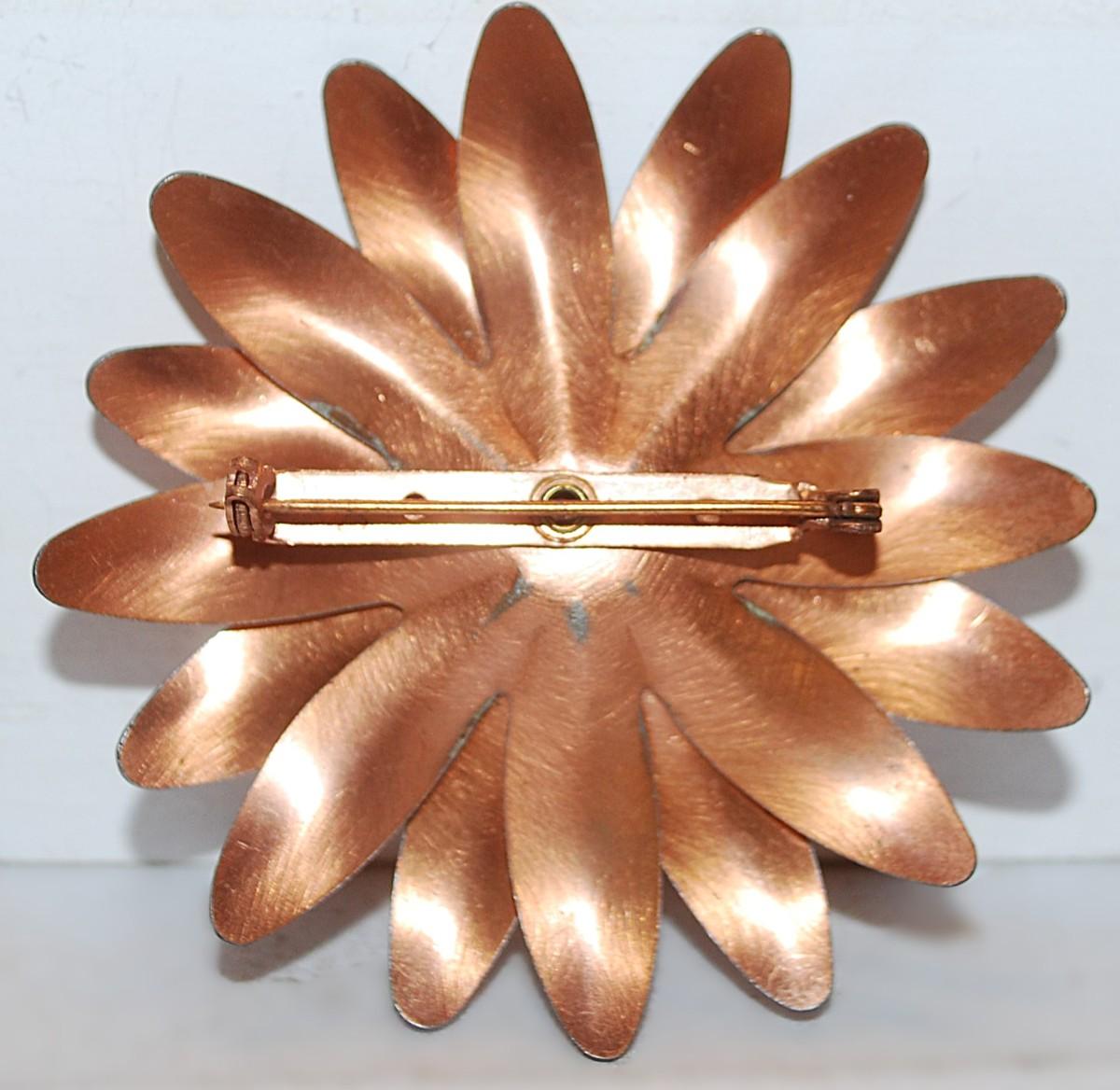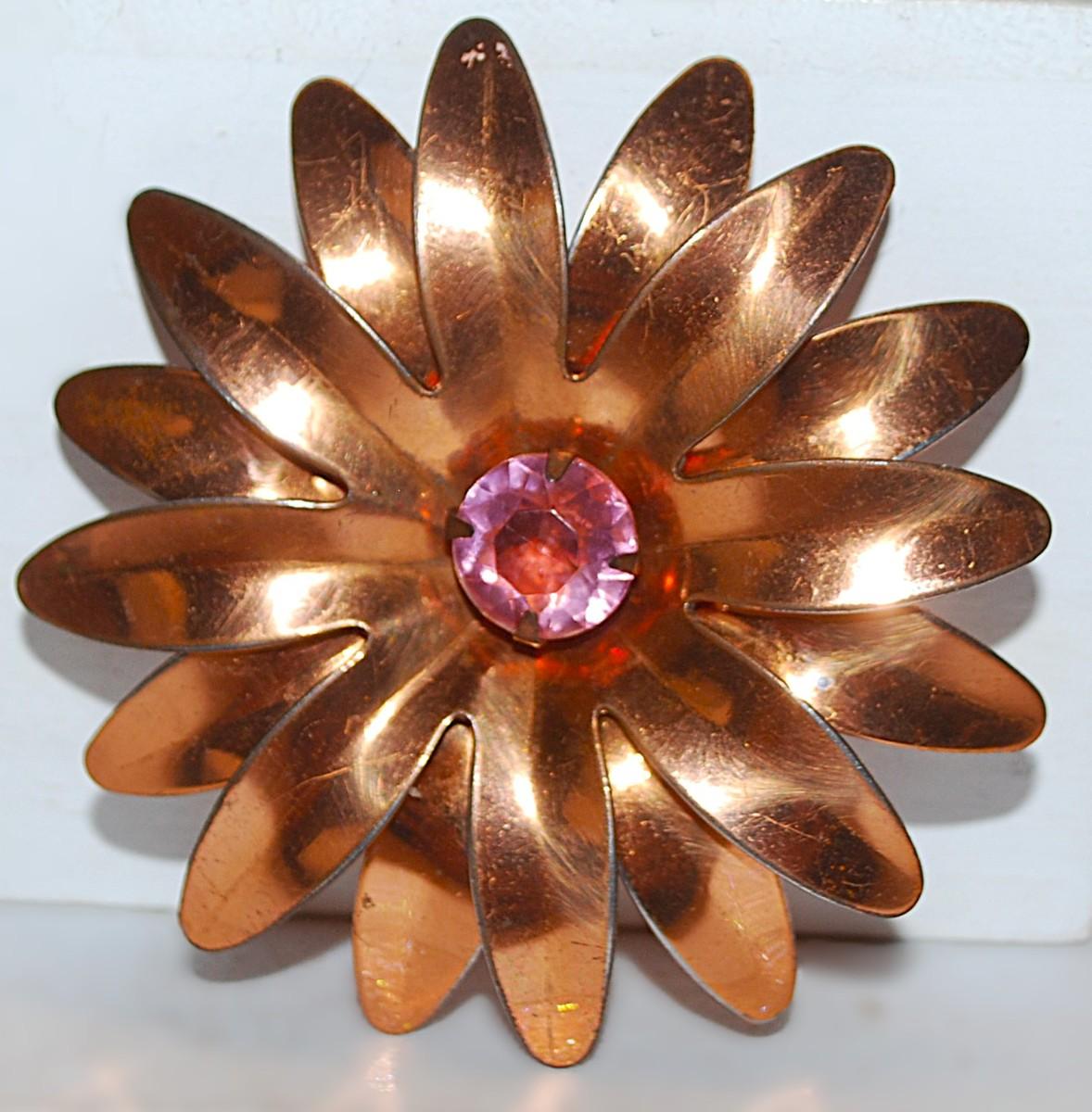 VINTAGE 1950's or 1960's Copper-Style TIN BROOCH (2½" Diam.) with a Round Beveled PINK Center Stone
