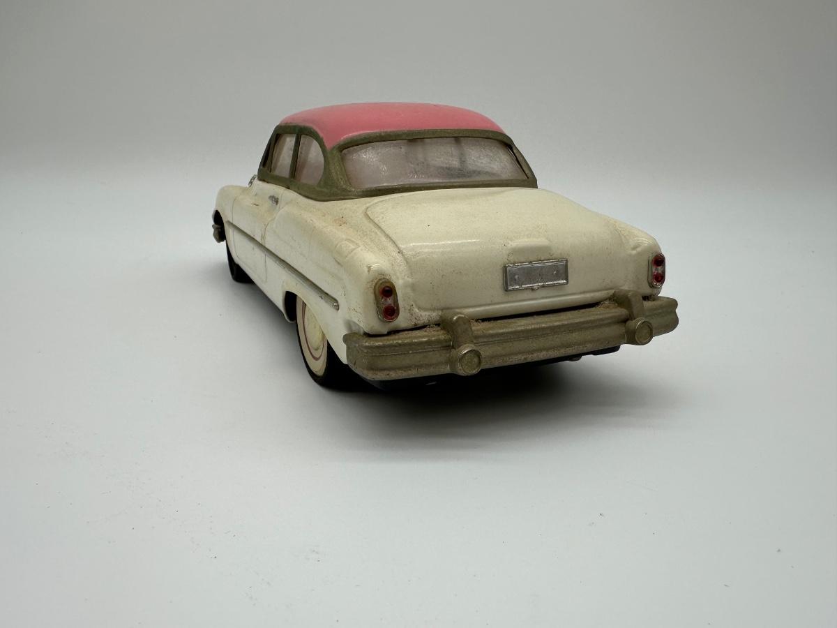 Vintage 1950s tin lithograph toy sedan, cream body with pink roof and clear plastic windows. Classic mid-century American car styling with chrome-look trim, detailed grille, and whitewall tires. Likely Japanese-made import from the post-war era. Great piece for a tin toy, automotive, or vintage toy collection.