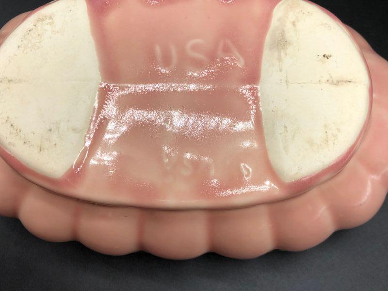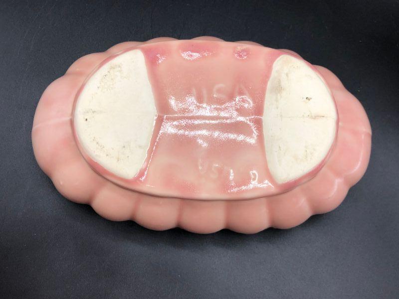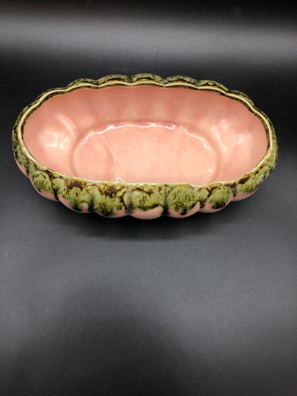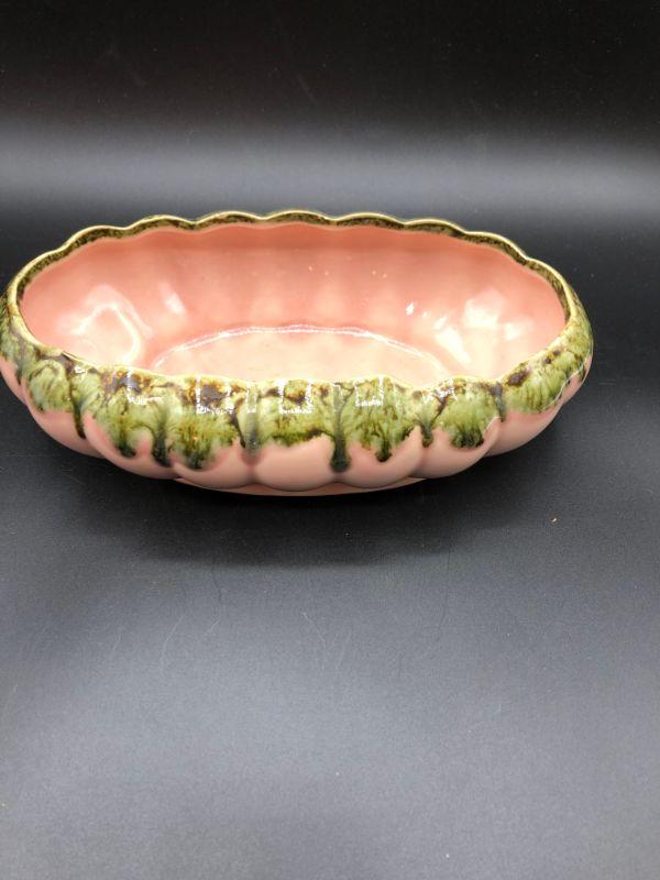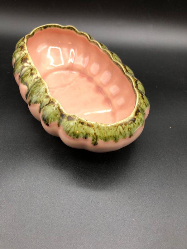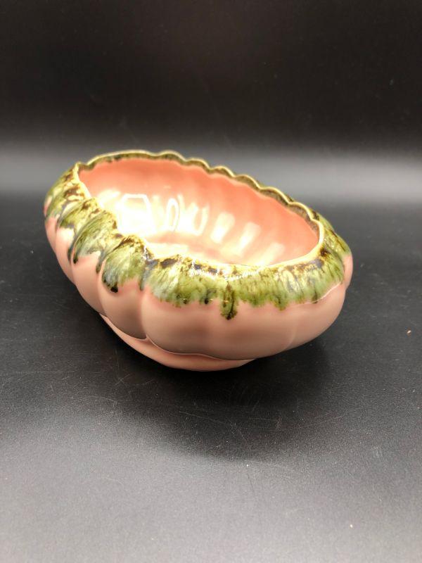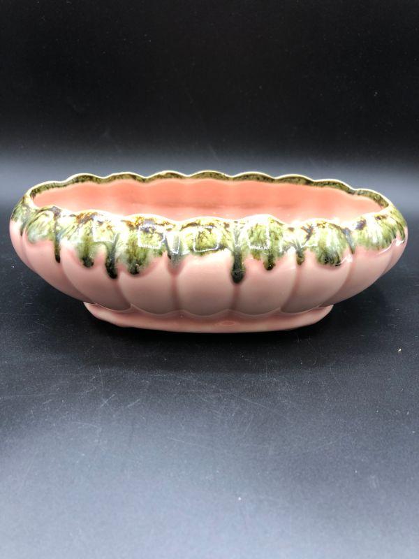 Vintage 1950s Upco Ungemach Pottery Planter. Pink glaze with a green dripware look to the edge. Scallop shape. It is stamped USA on the bottom. 8"x5" size.