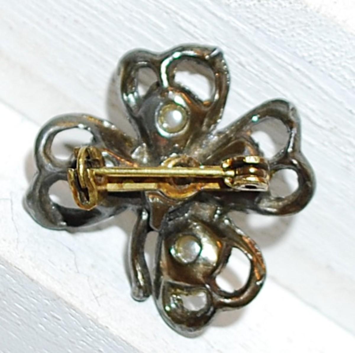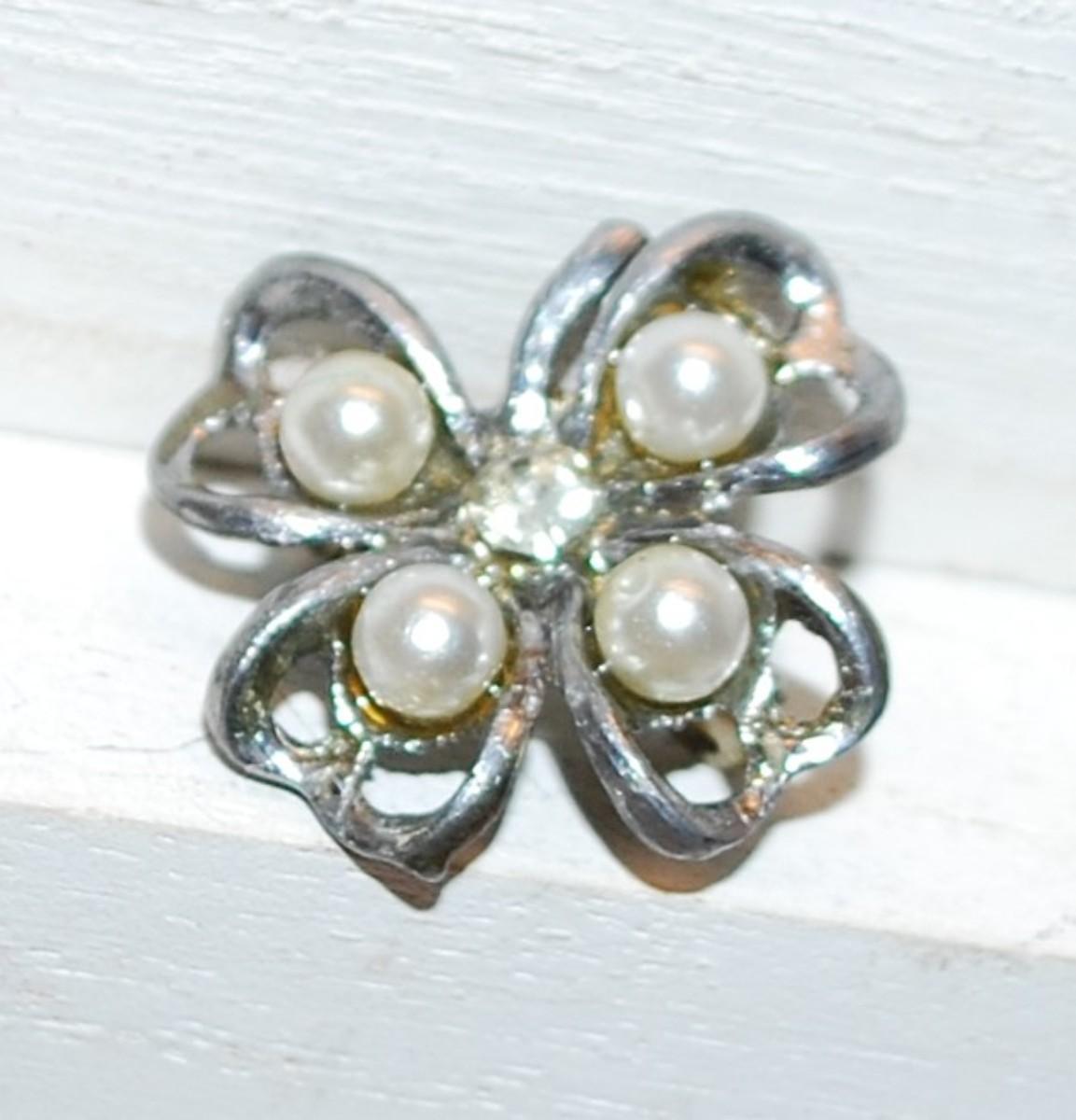 VINTAGE 1950's "White Pearls Flower Petal" PIN (1" Circ.) with 4 Faux Pearls and Single Clear Center Stone on a Silver Tone Setting