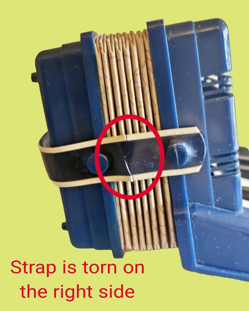 It is in pretty good condition considering it's age and the fact that it is a toy that children would play with. There is a tear in the strap on the right side (see photo) and a little bit of factory glue smears on the back where the bellows are attached. Plays like a real, grown up accordian plays.