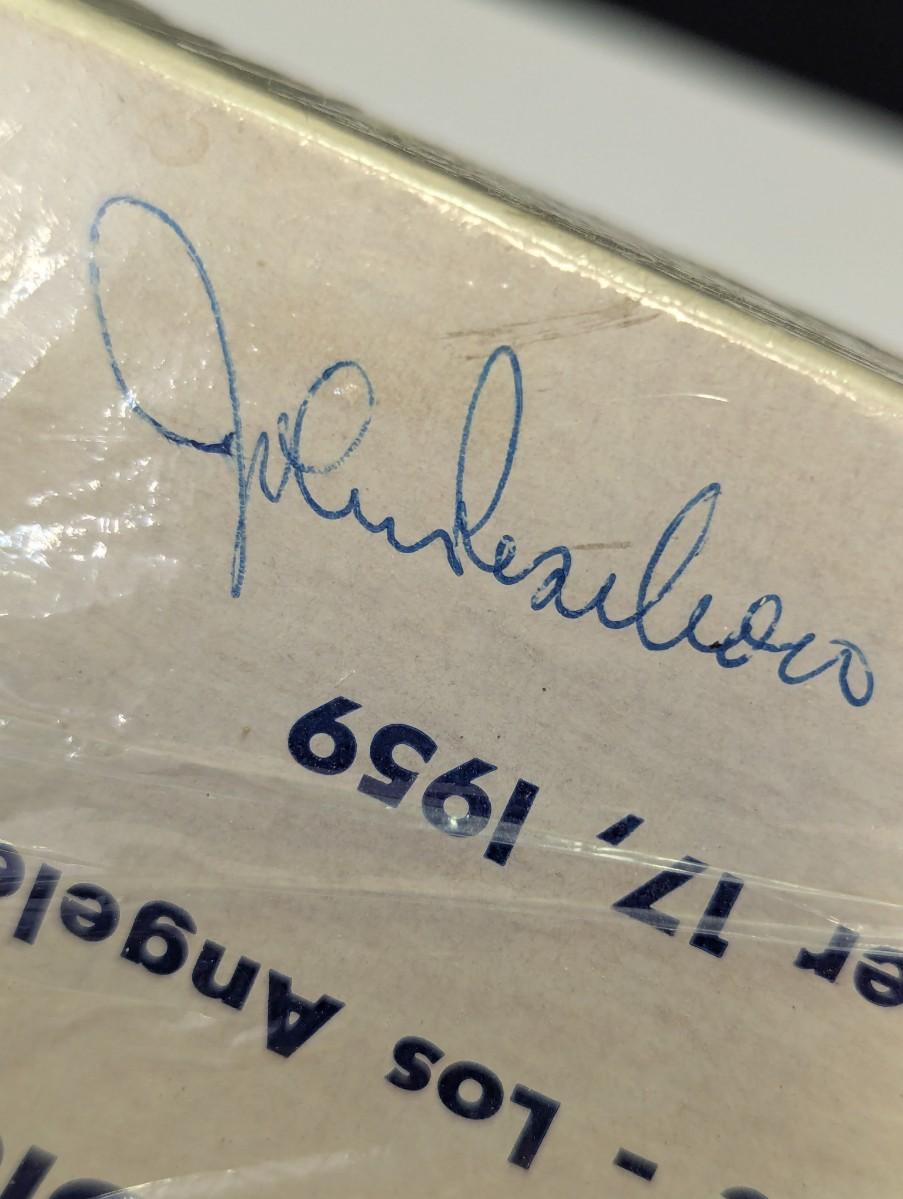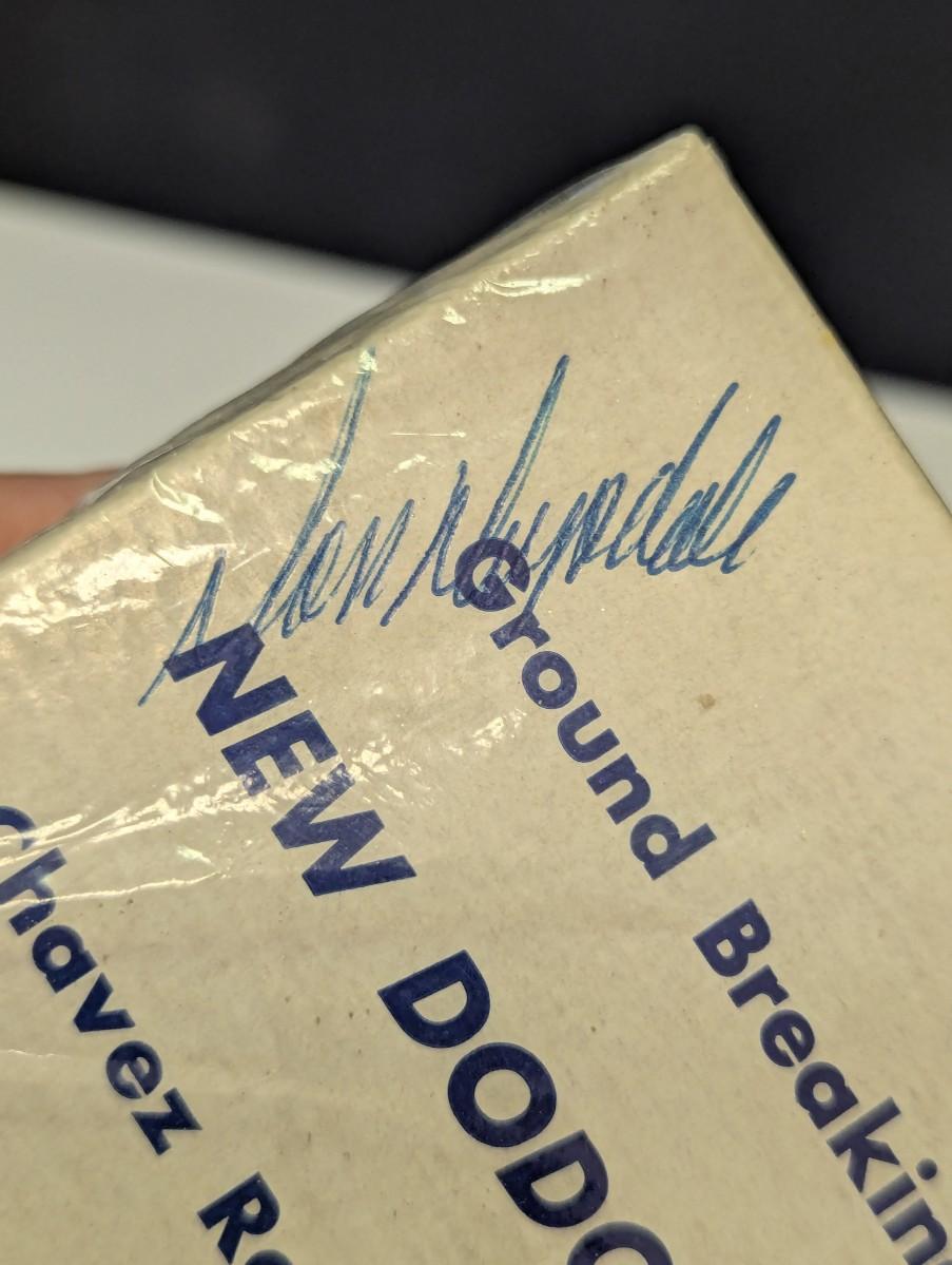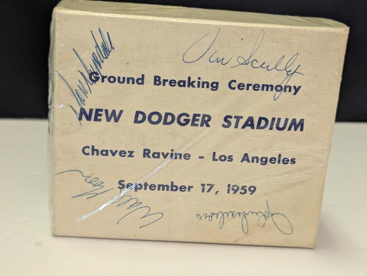 Vintage 1959 Dodger Stadium Groundbreaking Dirt In Souvenir Box Autographed by Vin Scully, Don Drysdale, Wally Moon,