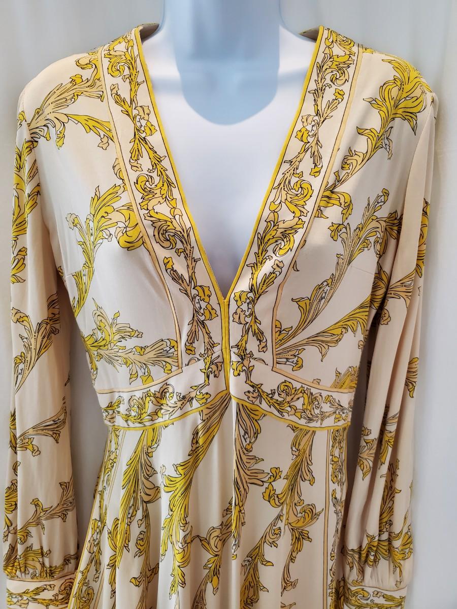 Side zipper. Measurements laying flat: 14.5" waist; 38" pit to pit; 16.5" across the shoulder; 24" sleeve length; 15.5" neck to waist; Tapered hemline - 27" waist to hem on short side, 30" waist to hem on long side. Bias cut skirt has overall circumference of 98" for beautiful swing and sway as you walk. Condition: Stunning! Some stitching has come a bit loose and should be reinforced before wearing, but there is no damage to this fabulous dress.