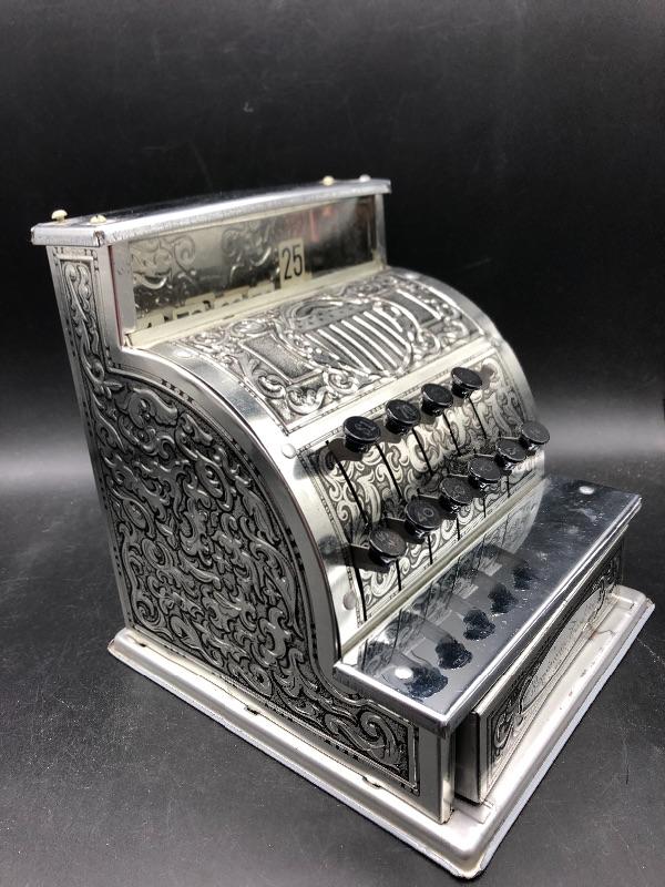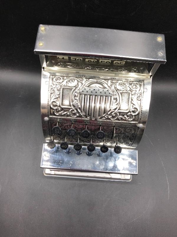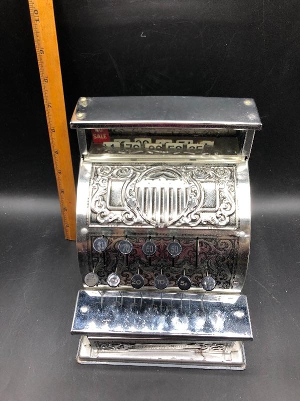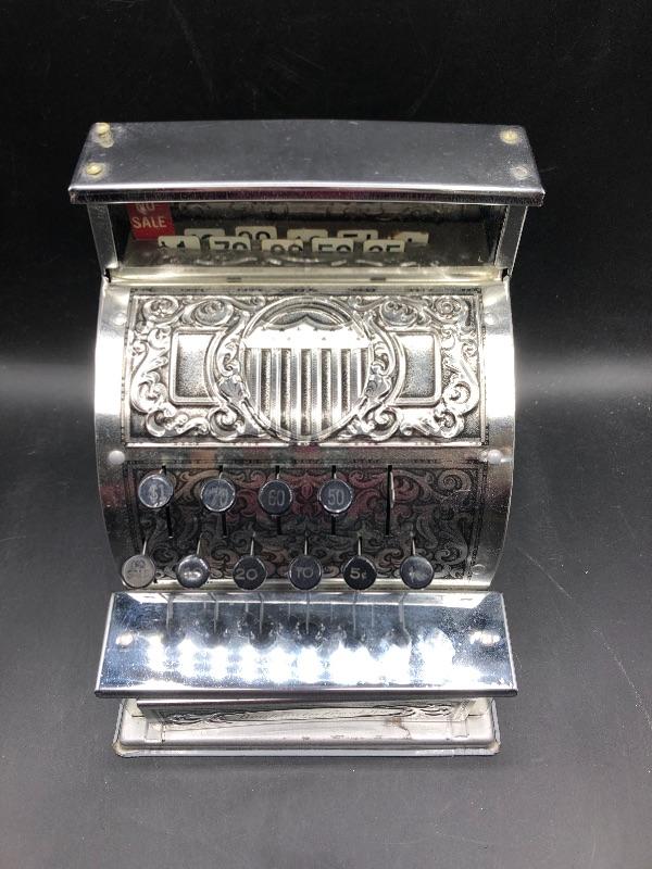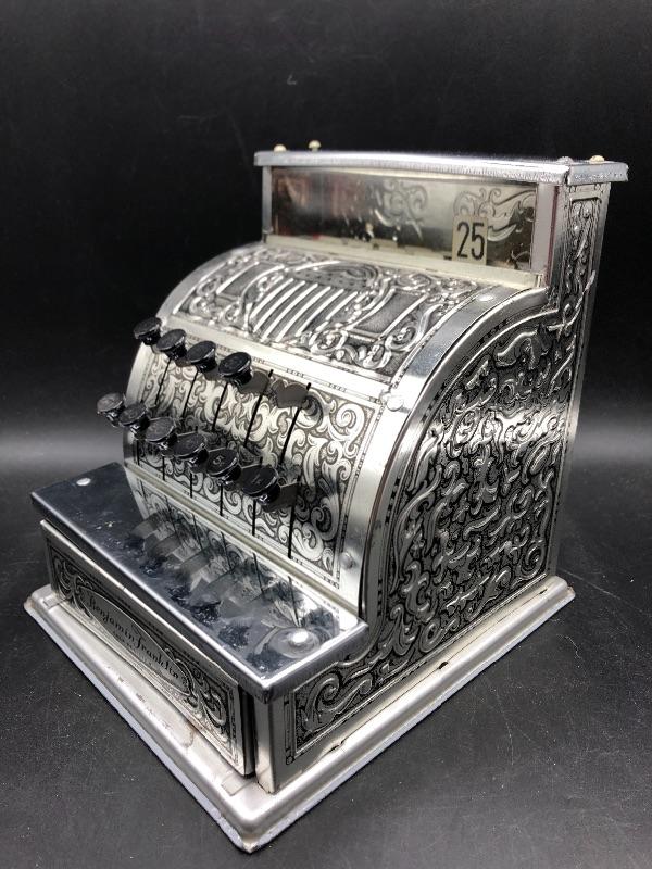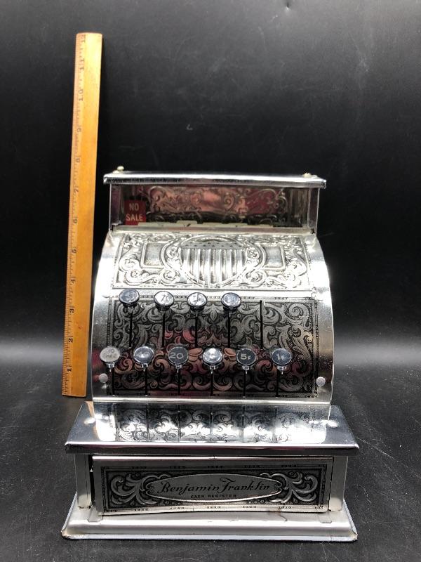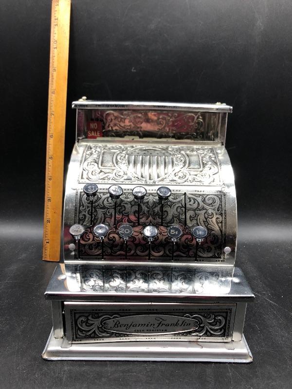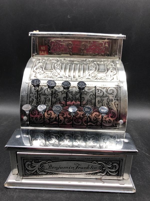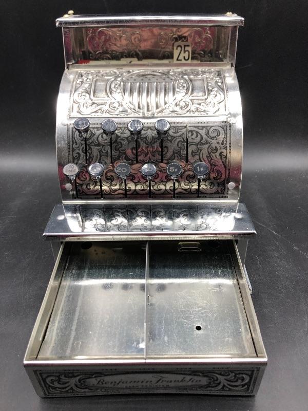 Vintage 1960's 1970's Benjamin Franklin Cash Register by KamKap Inc. Silver metal tin toy. In good vintage condition. Drawer is a little crooked but opens. Missing one button on the top right. About 8" size.