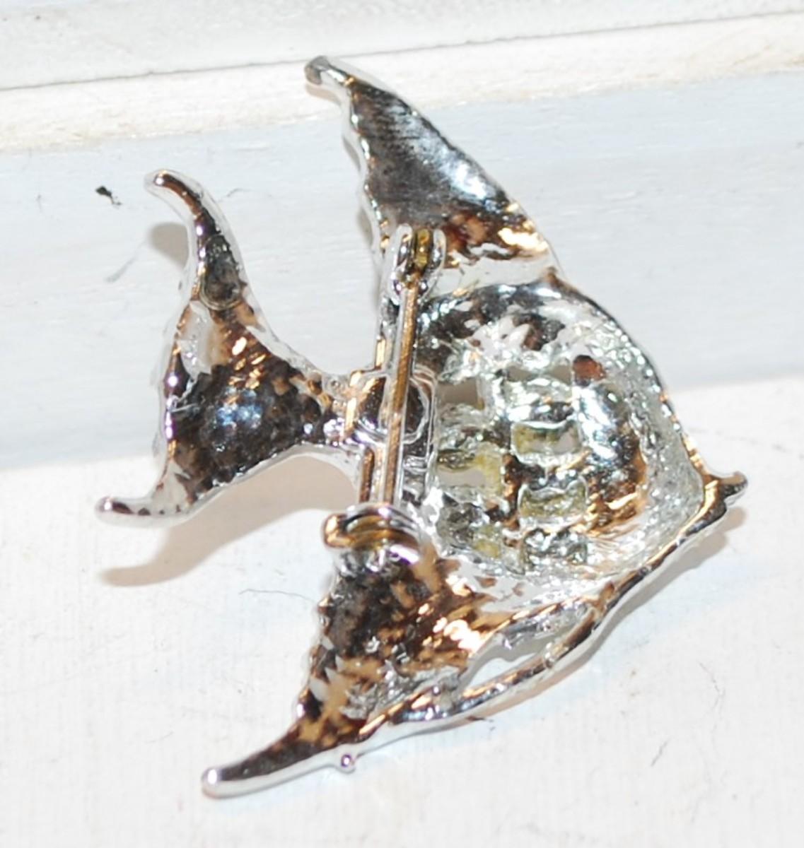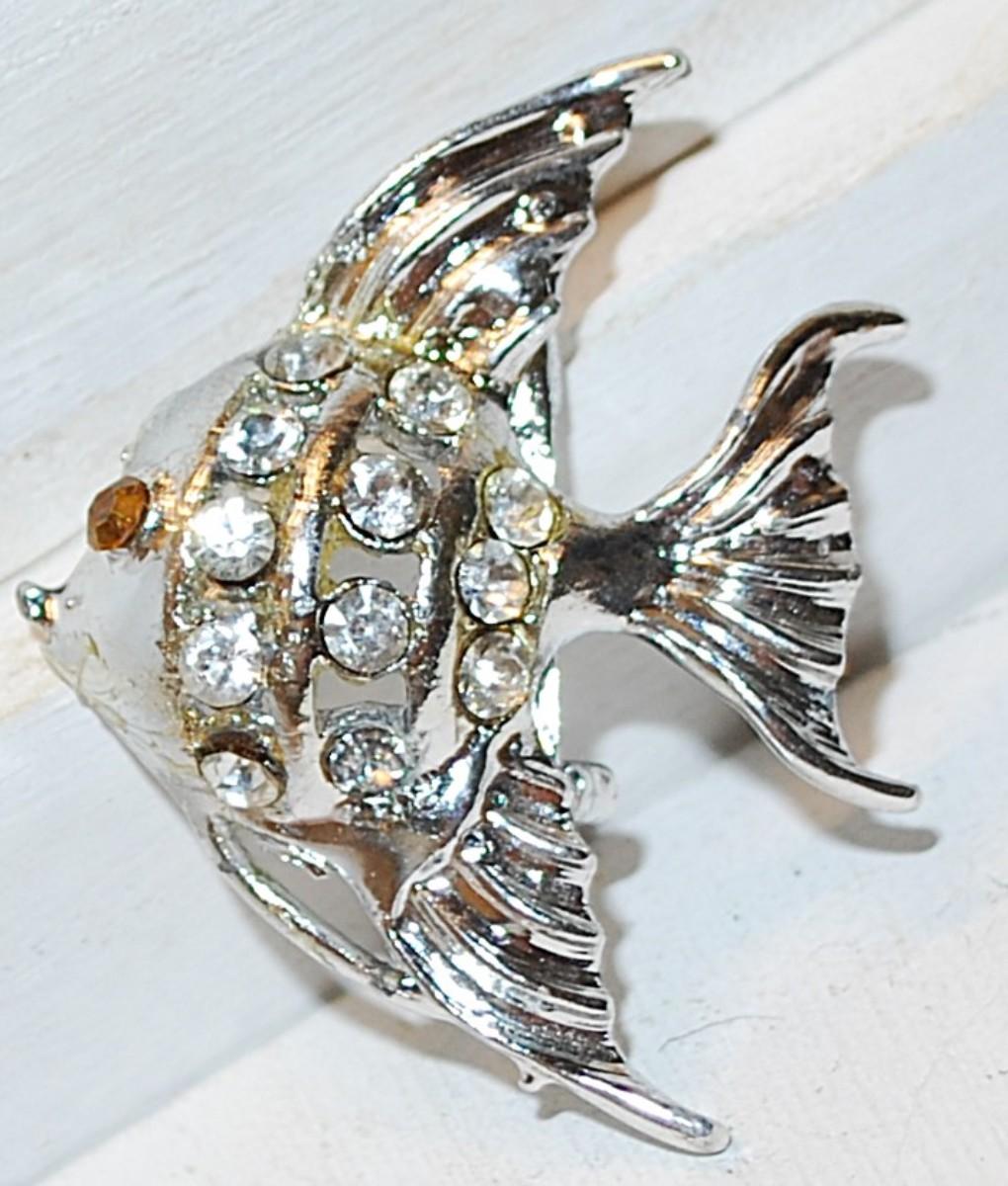 VINTAGE 1960's Amber-Eyed Angel Fish BROOCH (1¾" x 1¼") with 12 Clear Stones on a Silver Toned Base